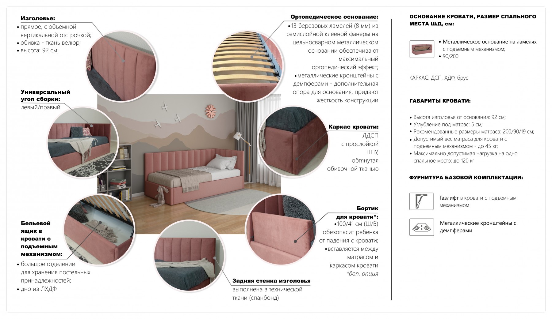 Агата" - кровать, которая сочетает в себе функциональность и стиль для спальной зоны в детской комнате. Отличительная черта дизайна - аккуратная вертикальная прострочка на изголовье и спинке, придающая модели оригинальный вид и дополнительный комфорт. Кровать оснащена ортопедическим основанием с ламелями на цельносварной металлической раме. Надежный подъемный механизм облегчает доступ к вместительному бельевому ящику, предоставляя дополнительное пространство для хранения. Конструкция кровати предусматривает сборку как с левой, так и с правой стороны, что делает её универсальным выбором для любого помещения.