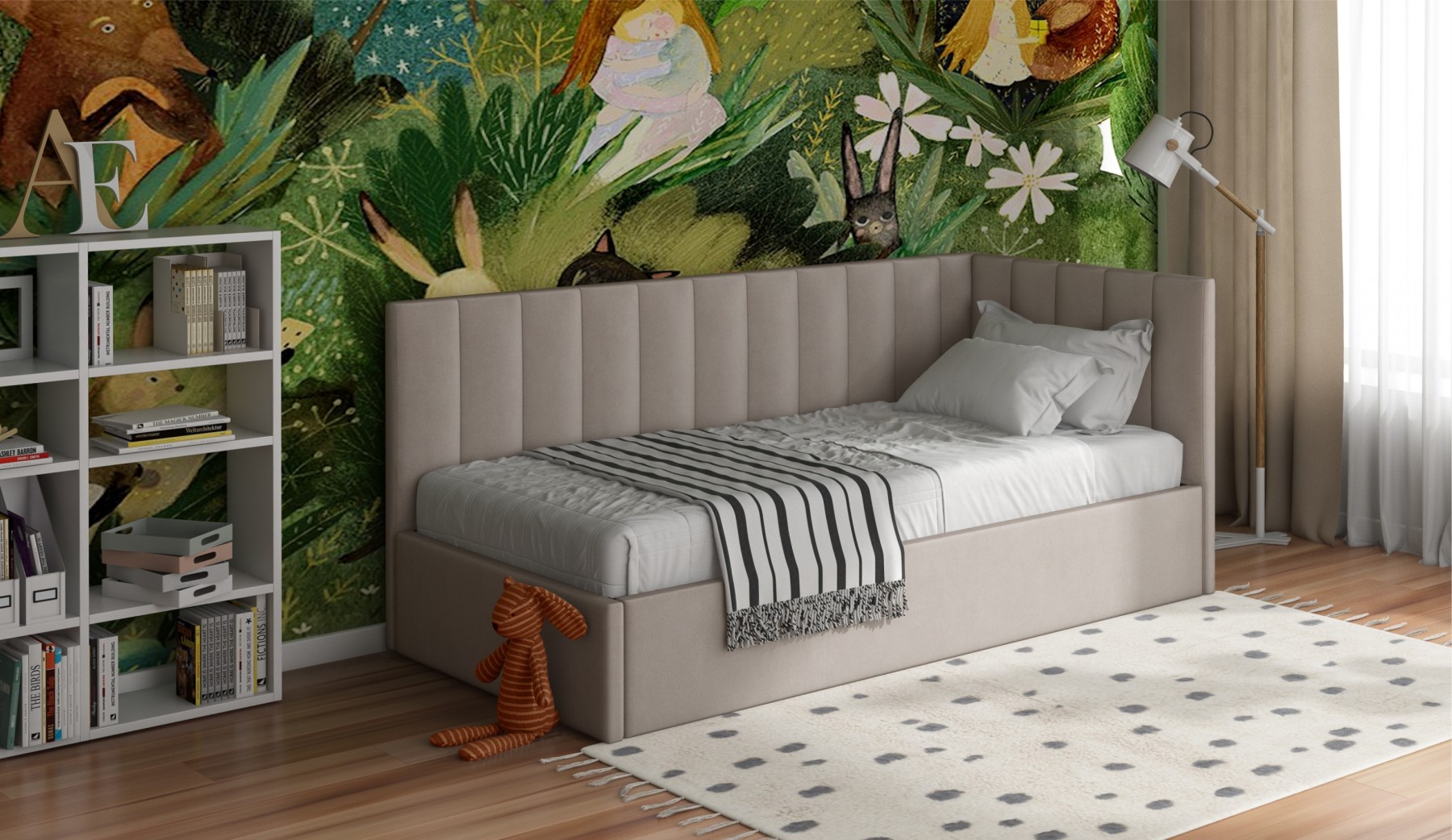 Агата" - кровать, которая сочетает в себе функциональность и стиль для спальной зоны в детской комнате. Отличительная черта дизайна - аккуратная вертикальная прострочка на изголовье и спинке, придающая модели оригинальный вид и дополнительный комфорт. Кровать оснащена ортопедическим основанием с ламелями на цельносварной металлической раме. Надежный подъемный механизм облегчает доступ к вместительному бельевому ящику, предоставляя дополнительное пространство для хранения. Конструкция кровати предусматривает сборку как с левой, так и с правой стороны, что делает её универсальным выбором для любого помещения.