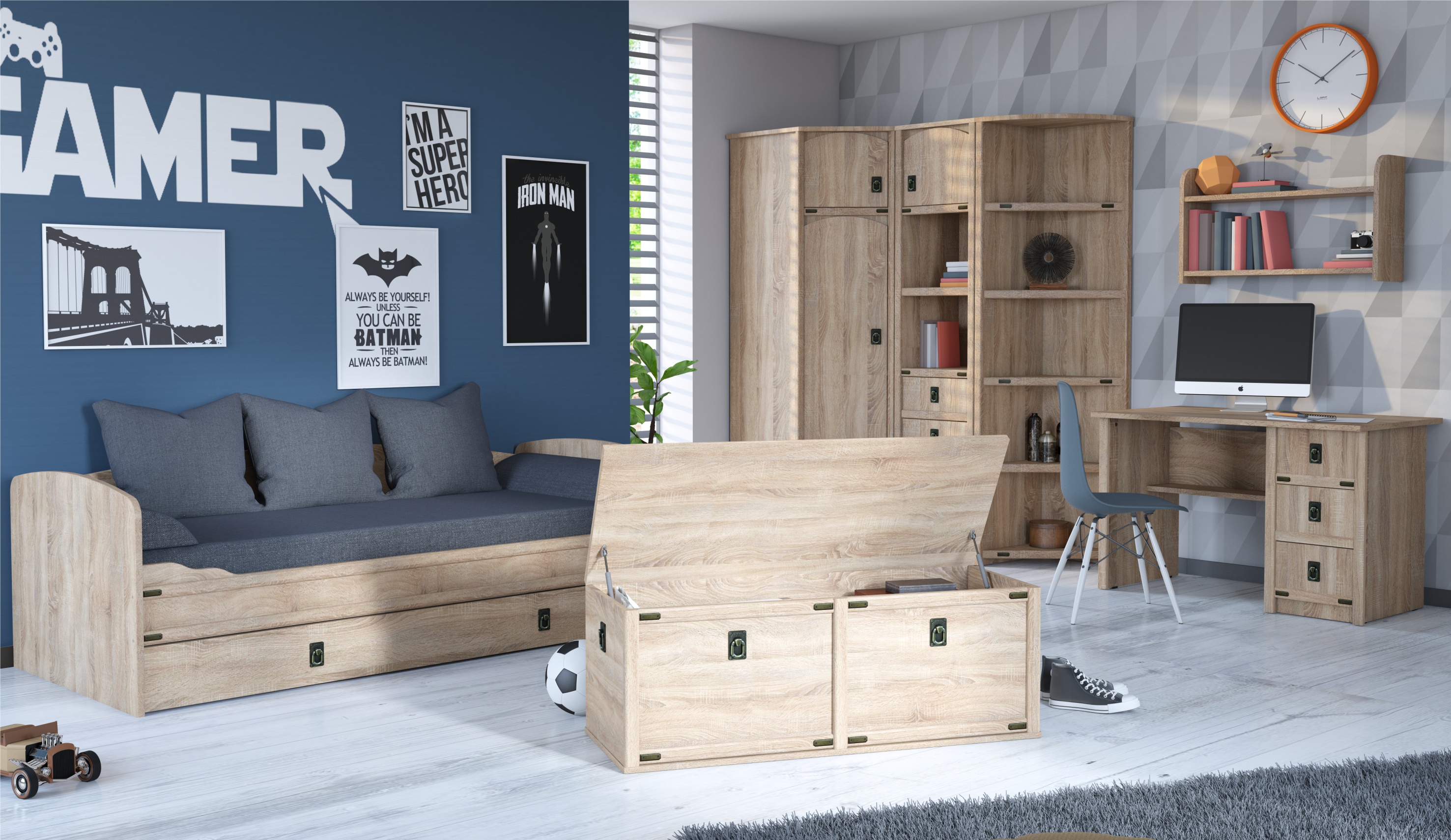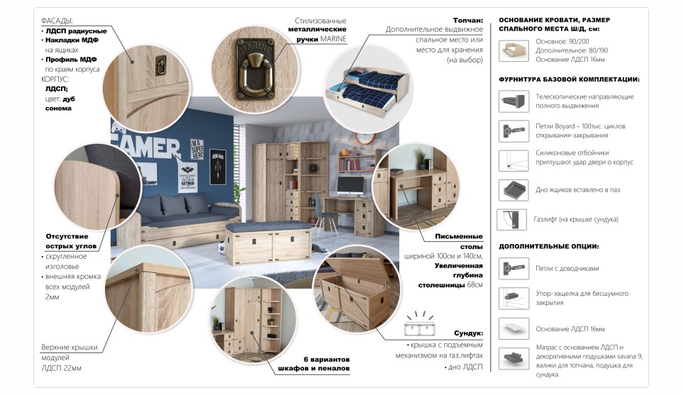 Кровать-топчан с закругленным изголовьем и высокой спинкой включает выдвижное спальное место, которое служит ящиком для хранения. Края кровати защищены мягкой кромкой 2 мм, предотвращающей появление царапин и сколов. Металлические ручки MARINE бронзового цвета и декоративные элементы добавляют уникальности изделию. Комплектуя кровать декоративным матрасом и подушками, получаете современный диван. Стандартные размеры 90x200 см, прочность конструкции и ненавязчивый цвет делают кровать комфортной для использования. Легко сочетается с другими элементами мебели "Валенсия".