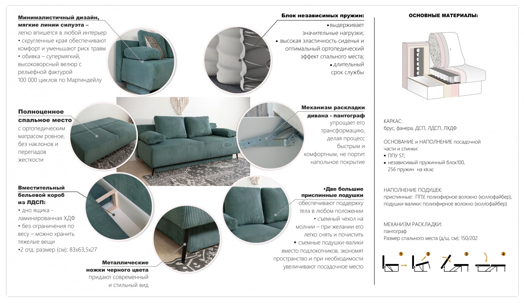 Диван Альба выполнен в стиле минимализма, где каждый его элемент наполнен функциональностью: от мягких, плавно округленных линий до удобных приспинных подушек и съемных валиков. Высокие металлические ножки добавляют легкости визуальному образу, в то время как рельефная велюровая обивка придает мягкости и облегчает уход. Механизм "Пантограф" делает процесс раскладки быстрым и комфортным, сберегает напольное покрытие даже при ежедневном использовании. Спальное место с ортопедическим матрасом на независимом пружинном блоке гарантирует полноценный сон ночью и комфортный отдых.