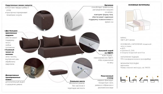 Многофункциональный компактный и практичный диван для съёмного жилья или дачи. С помощью механизма трансформации «еврокнижка» он легко превращается в спальное место с матрасом из эластичного ППУ. Вместительный бельевой короб можно использовать для хранения постельных принадлежностей, кухонного текстиля или посуды.