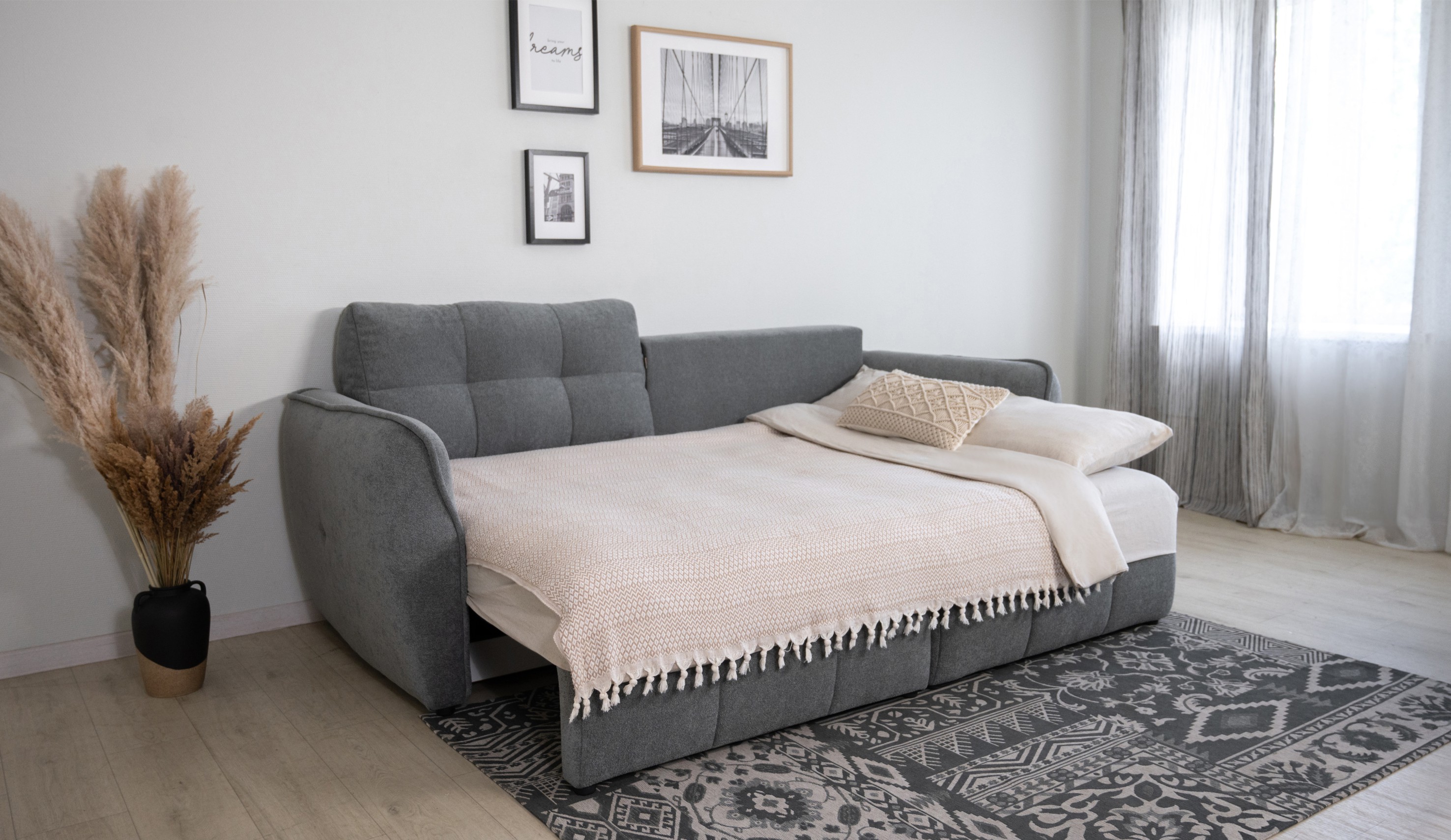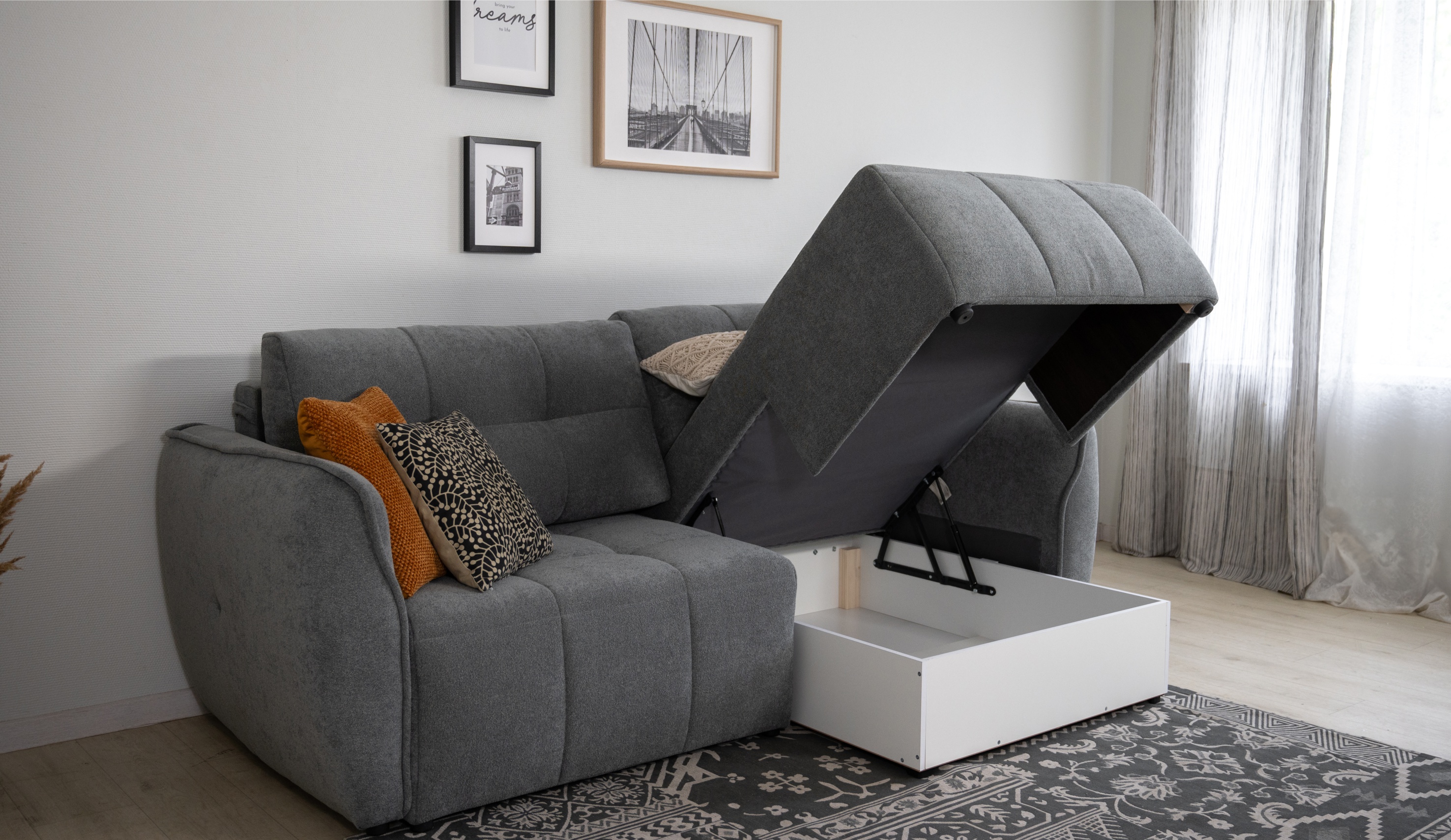 Современный диван Треви сочетает в себе эксклюзивный дизайн и функциональность. Его округлый силуэт и подлокотники с декоративным кантом добавляют элегантности, а мягкое стеганое сиденье с глубокой посадкой и качественная обивка обеспечивают необыкновенно уютную атмосферу. Диван оснащён двумя подушками для дополнительного удобства и легко трансформируется в просторное спальное место благодаря механизму "тик-так". Вместительный бельевой короб удобен для хранения, делая этот диван идеальным выбором для современного интерьера. Универсальный угол в диване позволяет легко адаптировать его под любое пространство и изменять интерьер без дополнительных затрат.