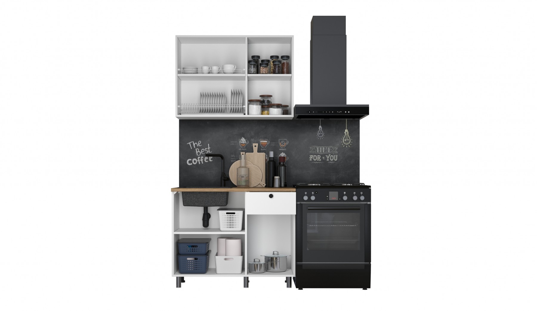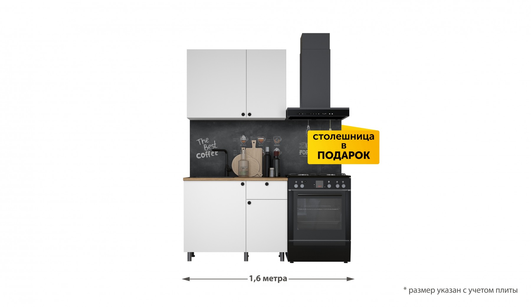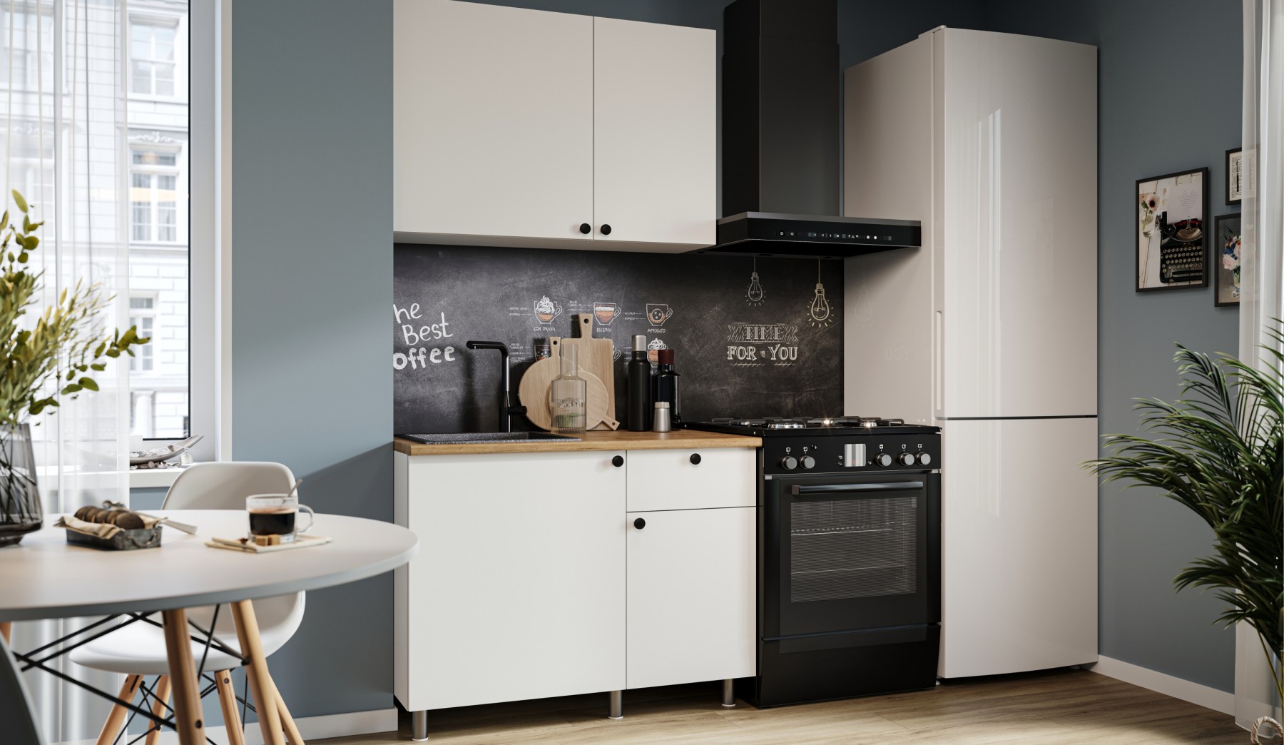 Функциональный готовый комплект кухни в едином корпусе с оптимальным набором модулей для небольших помещений. Лаконичные фасады ЛДСП белого цвета зрительно увеличивают помещение, черные ручки-кнопки с бархатистой поверхностью покрытия Soft-touch подчеркивают минимализм дизайна, пластиковые опоры серого цвета делают кухню легче и невесомей. Столешница в трендовом декоре «Дуб классический» с реалистичным крупным рисунком и оттенком древесной текстуры, входит в комплект в размере готового решения кухни.