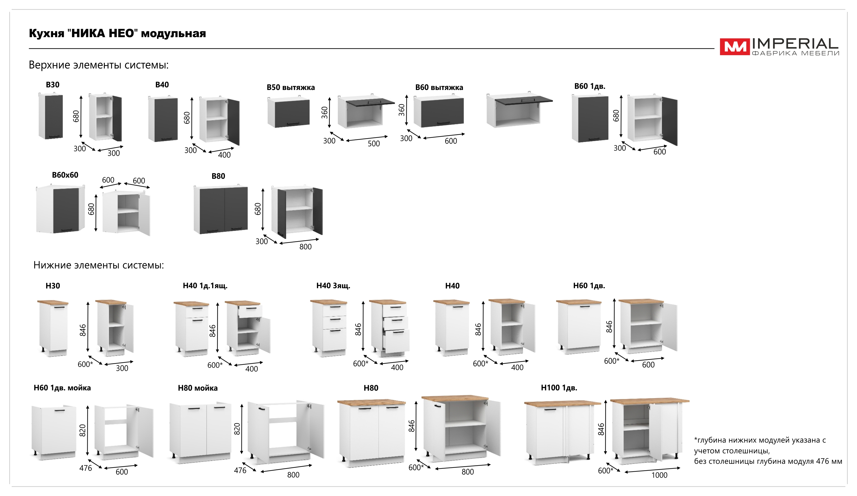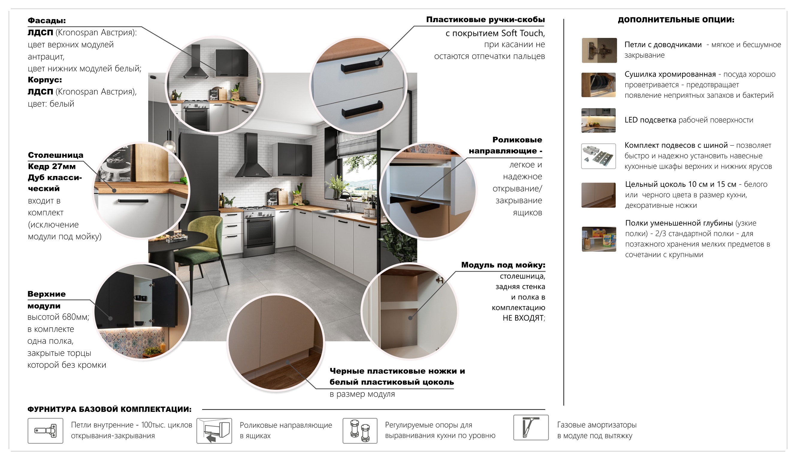 Кухонный гарнитур Ника Нео сочетает в себе элегантность и функциональность, подходит для помещений разного размера, позволяя использовать всё полезное пространство. Верхние шкафы выполнены в насыщенном антрацитовом цвете, который сочетается с белыми нижними модулями, создавая легкий и свежий вид. Четкая игра контрастов делает кухню визуально привлекательной и оригинальной. Ручки черного цвета с мягким покрытием soft-touch выглядят стильно, комфортны в использовании. Столешница, имитирующая текстуру дуба, добавляет тепла и уюта, завершая гармоничный облик кухни.