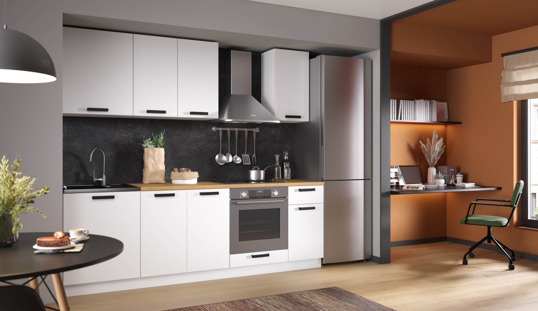 Функциональный готовый комплект модулей «Ника» подойдет для небольшой кухни в стиле сканди, лофт, экоминимализм. Лаконичные фасады ЛДСП в актуальных декорах природных оттенков в сочетании с классическим белым цветом создают спокойную гармоничную атмосферу, зрительно увеличивают пространство. Широкие черные ручки-скобы с бархатистым покрытием Soft-touch удобны в использовании и придают своеобразный колорит и характер кухне. Кухню при необходимости можно доукомплектовать модулями под вытяжку и духовку. Столешница в комплект не входит.