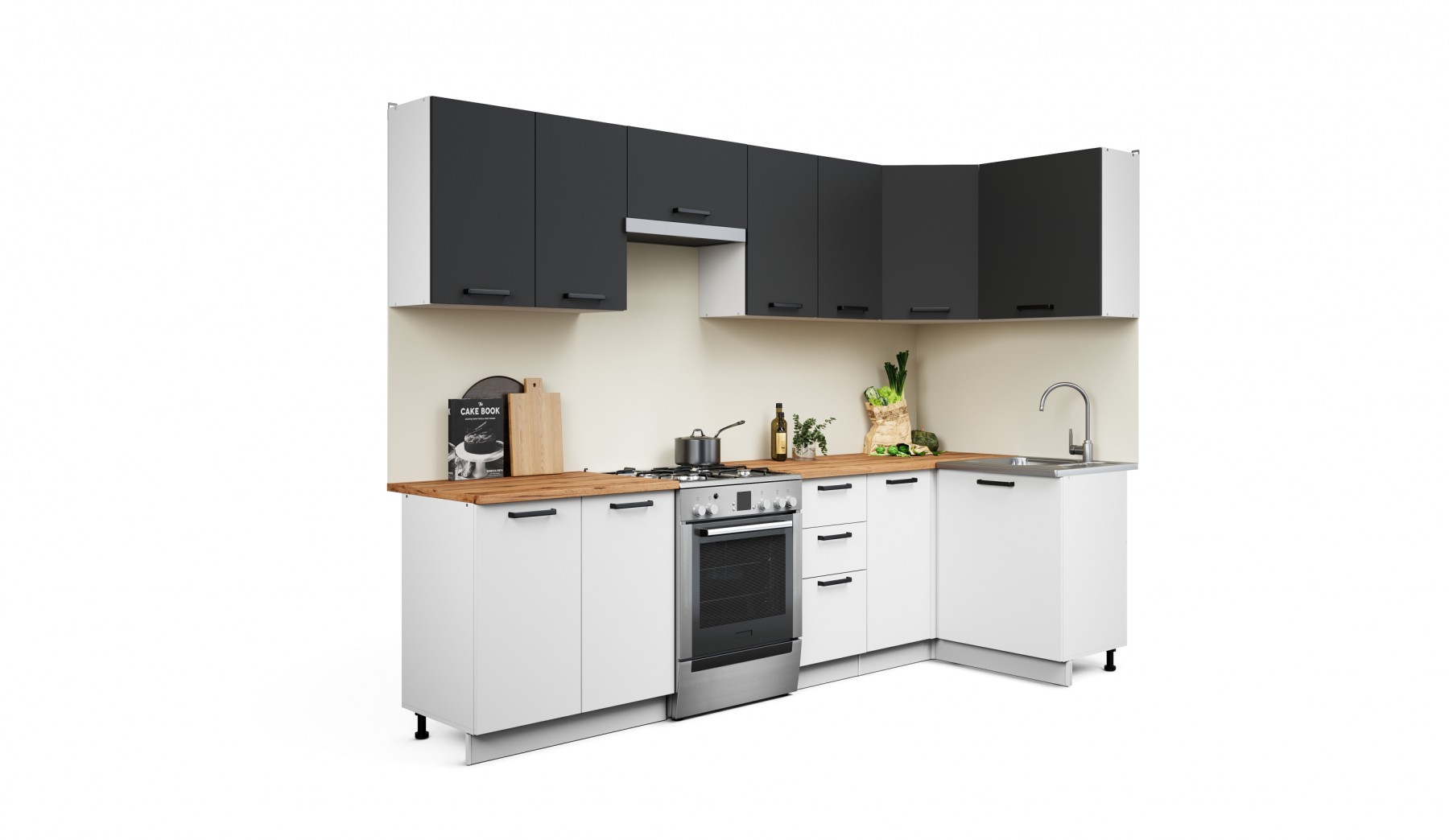 Ника Нео - это функциональная и современная кухня, которая легко адаптируется под ваши потребности и особенности помещения. Антрацитовый цвет добавляет глубину и серьезность, а белый - легкость и воздушность. Такое сочетание создает контраст, который привлекает внимание и подчеркивает чистоту линий. Черные ручки с покрытием soft-touch визуально дополняют образ и обеспечивают комфорт при использовании. В комплект входит столешница с декором под классический дуб, добавляя мебели природные акценты и гармонию.