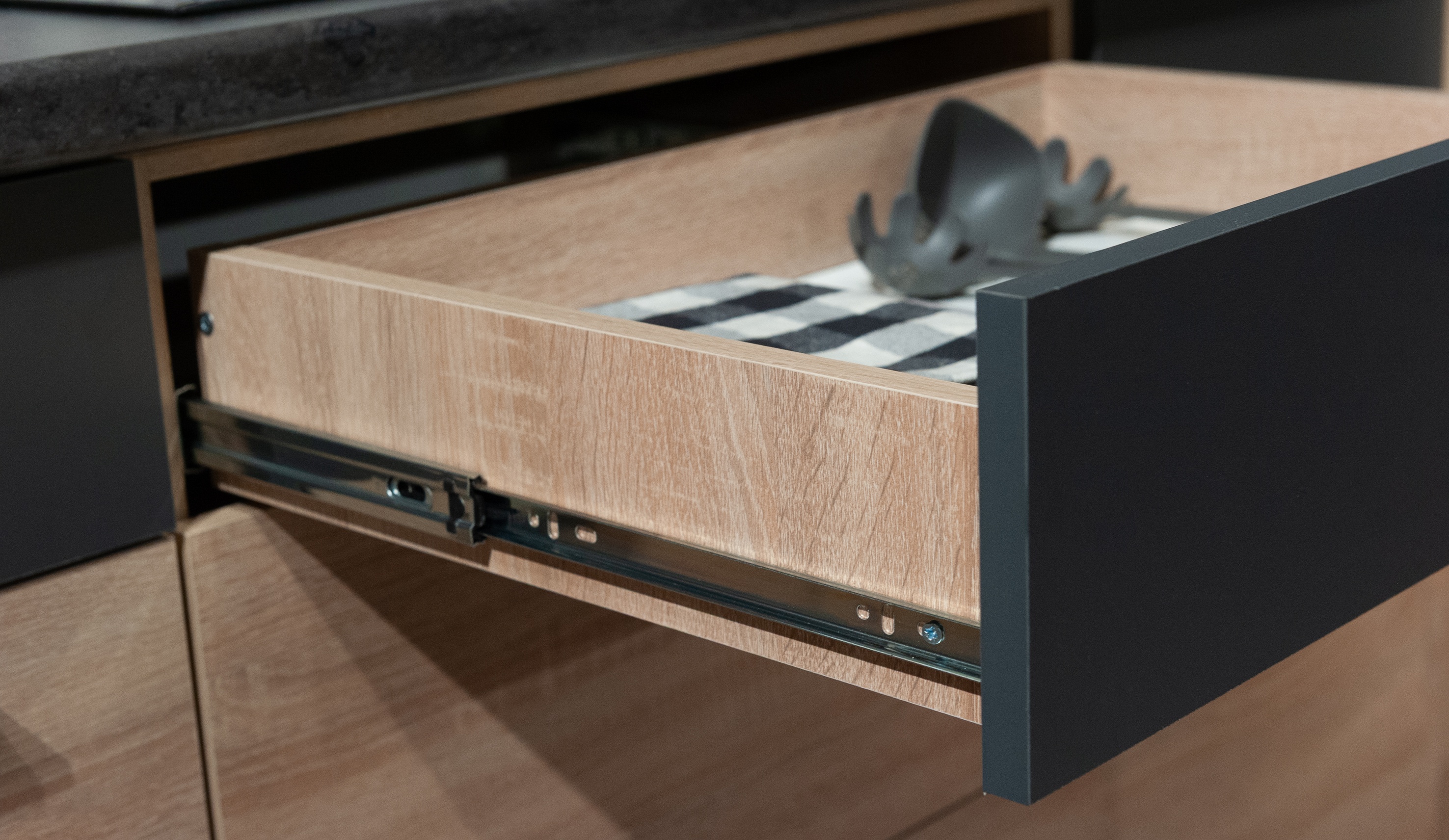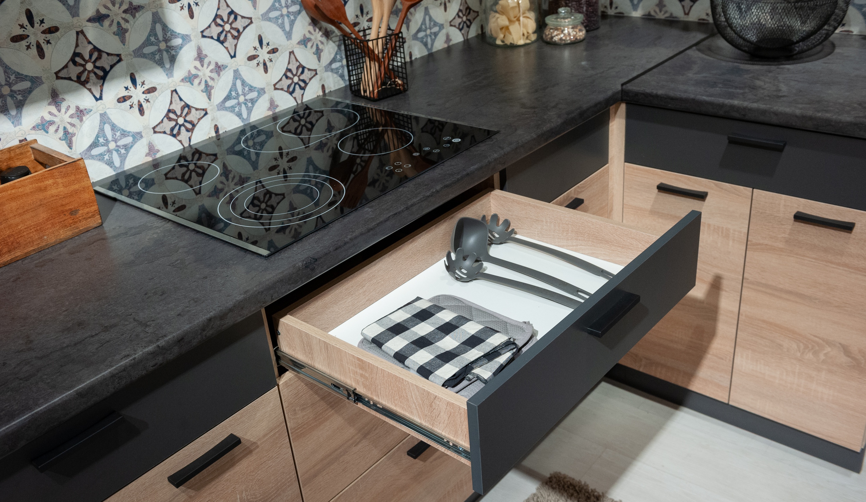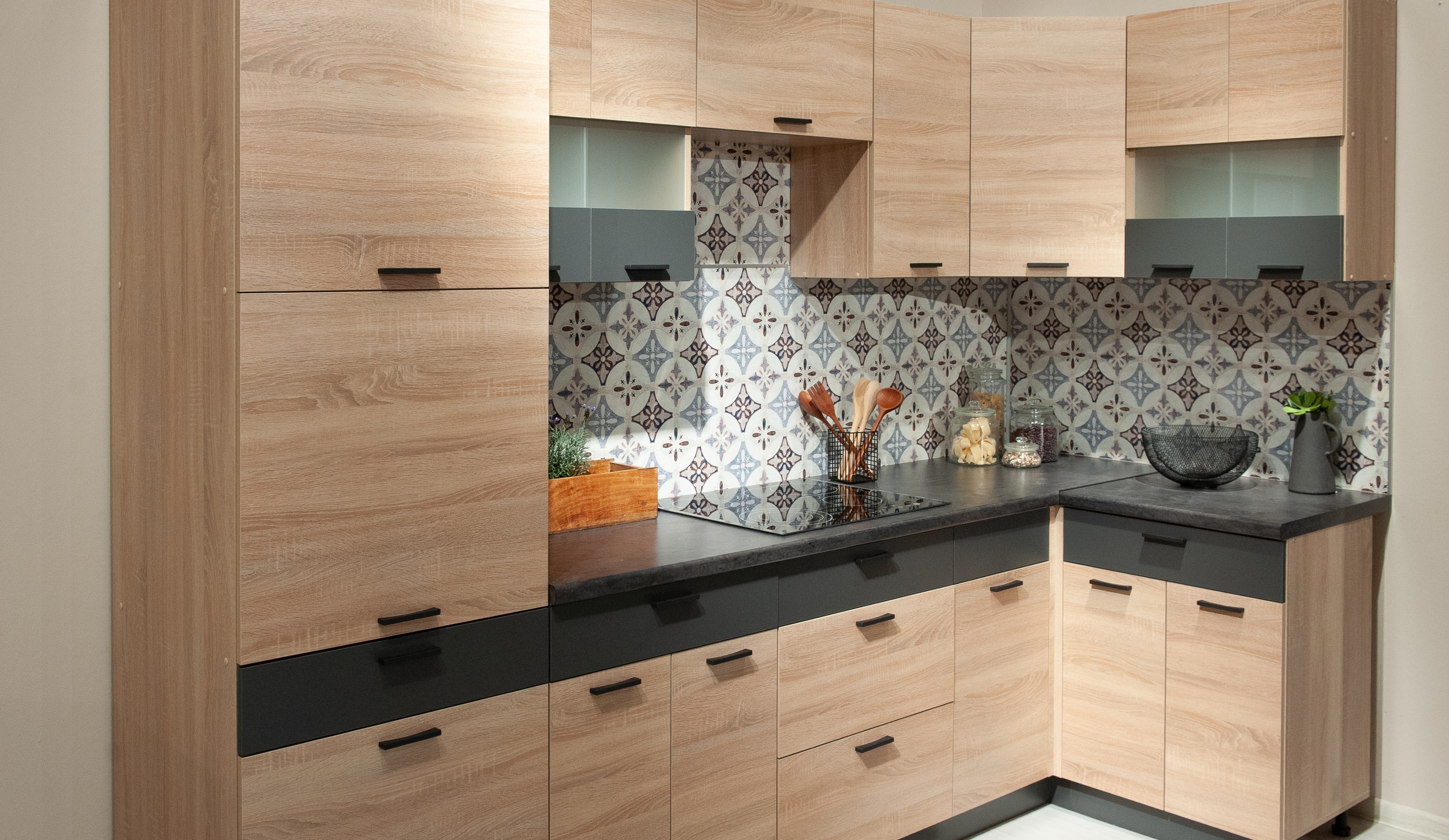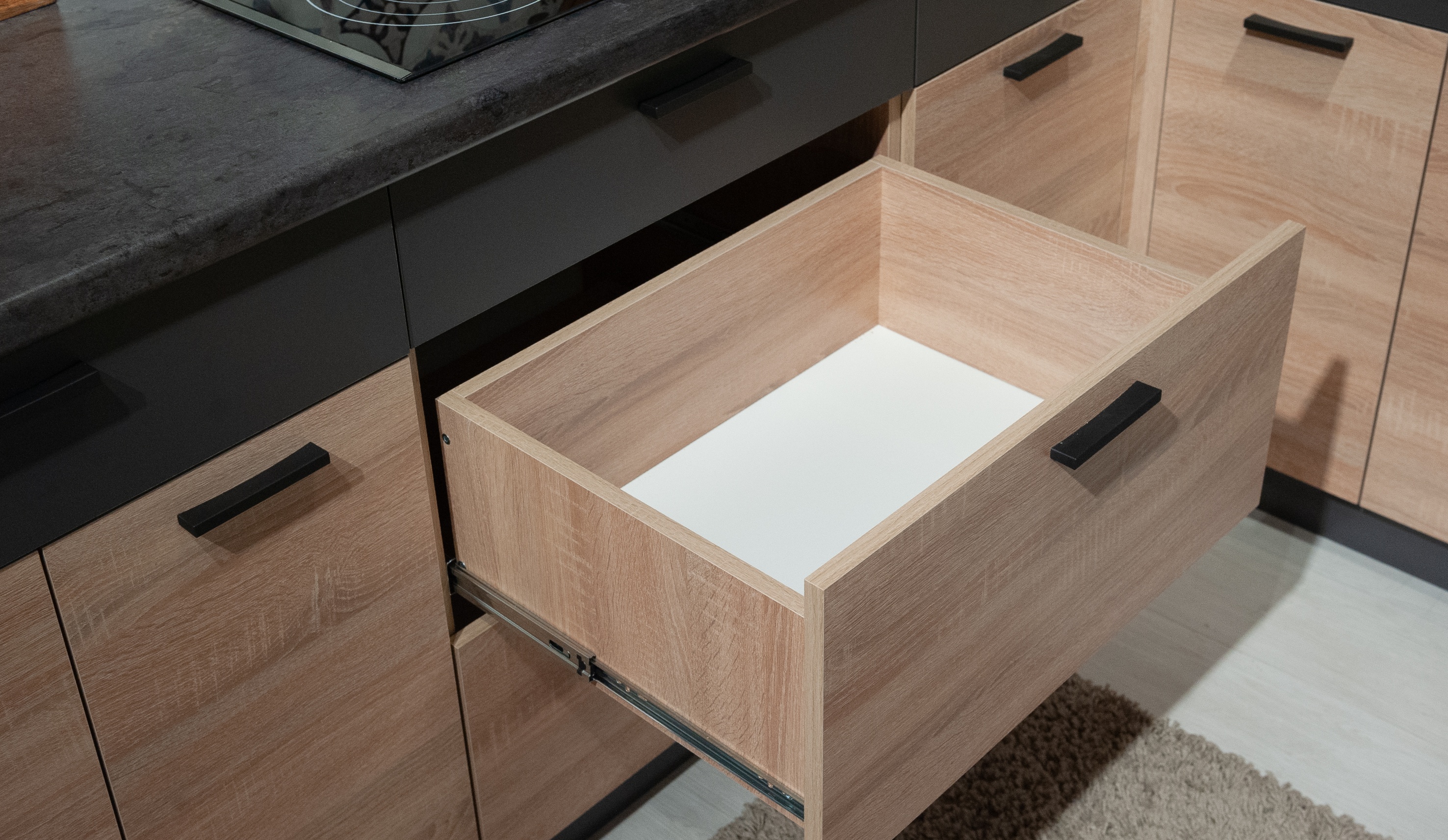 Кухня Николь специально разрабатывалась для создания интерьера студий (объединенное жилое и кухонное пространство) или для кухонь, совмещенных с гостиными. Поэтому и выбран один из самых распространенных сегодня цветов в мебели для жилых комнат - дуб сонома. Эта кухня гармонично впишется в пространство с другой жилой мебелью - шкафами, стеллажами, тумбами, столами и т.д. Широкий выбор сегментов модели Николь позволяет и вписать ее в небольшое помещение, и создать проект большой функциональной кухни. Дополнительную функциональность кухне придает то, что почти во всех нижних модулях есть выдвижные ящики. Наличие дополнительных опций дает возможность создать даже с небольшим бюджетом дизайнерский интерьер. Несмотря на невысокую стоимость, в этой кухне сохранены все экологические стандарты и использована качественная фурнитура. Столешница в комплект не входит, можно заказать у нас в размер Вашей кухни.