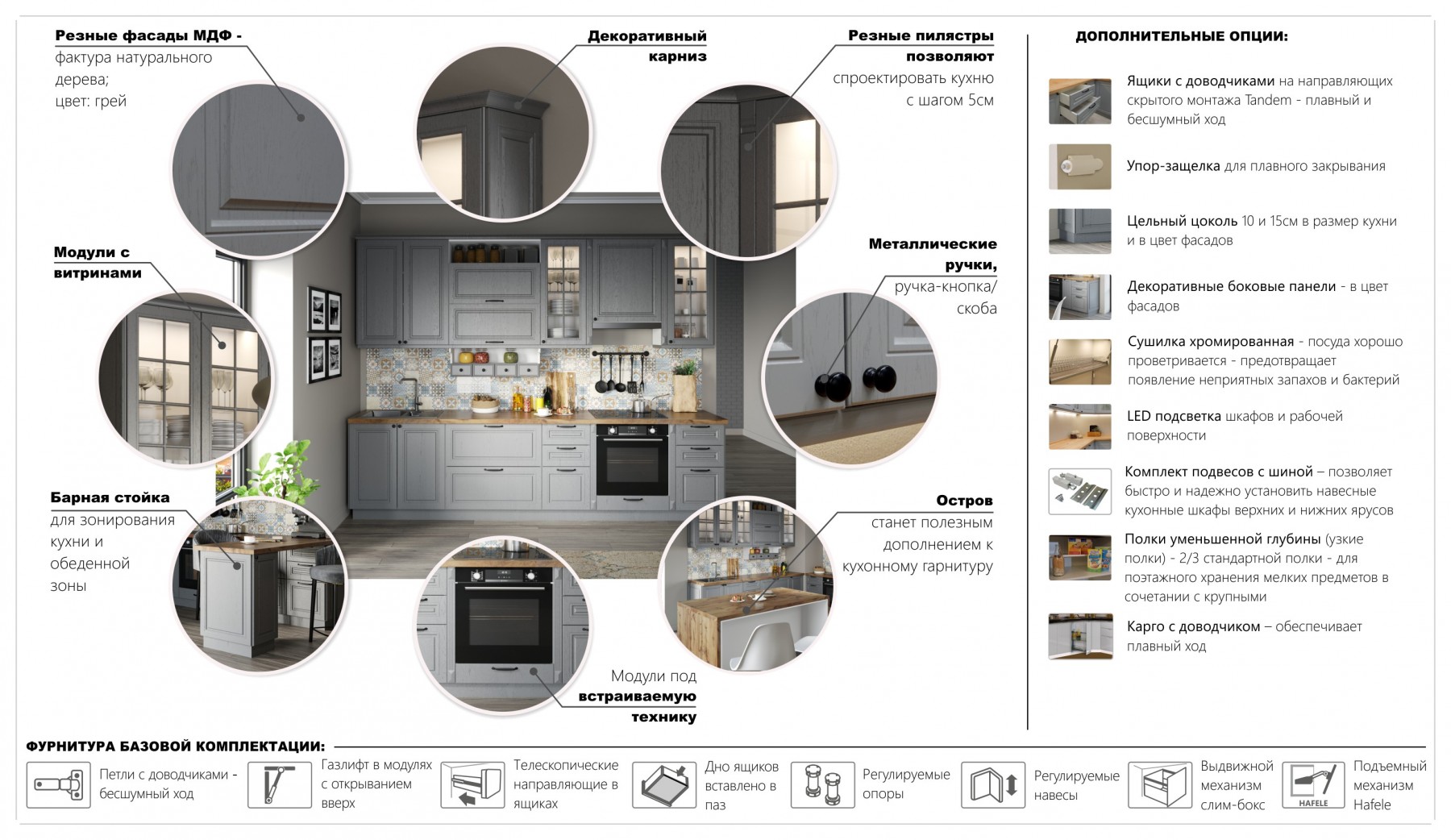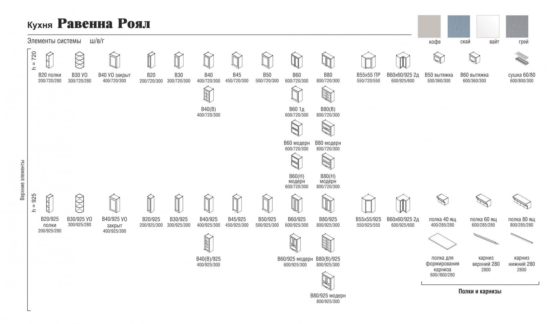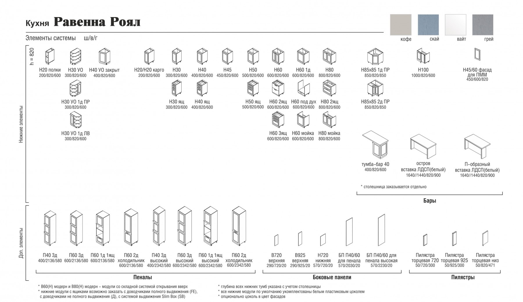 Кухня в классическом стиле Равенна Роял – идеальный выбор для людей, почитающих семейные ценности и традиции, стабильность и постоянство. Резные фасады из МДФ, спокойный нейтральный цвет, модули с прозрачными витринами и подсветкой, интересные решения барной стойки – все это подчеркнет ваш отличный вкус и создаст уютную обстановку. Многообразие модулей различного назначения делают кухню многофункциональной и универсальной для разных по площади помещений. Кухня хорошо адаптируется под любые стили – прованс, кантри, шебби-шик, достаточно добавить декор, соответствующий выбранному образу, и ваша кухня заиграет новыми красками.