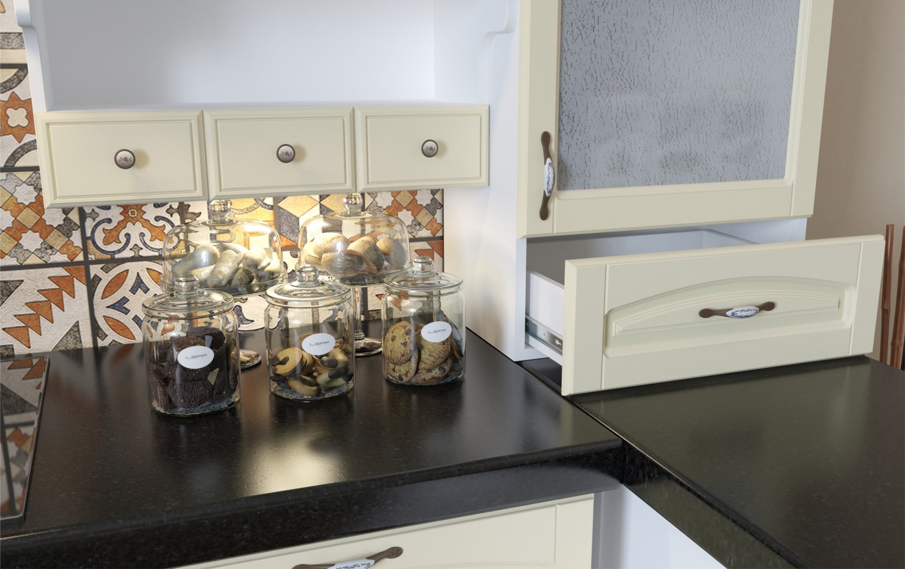 Равенна Фаби - это актуализация модных в настоящее время стилей Прованс и Кантри. Как цветовая гамма, так и стилизованная металлическая ручка с элементами керамики вписываются и в тот, и в другой стиль, что позволяет, в зависимости от аксессуаров и текстиля, создать интерьер нужного вам направления. Положите скатерть и полотенца в клетку, и вы получите теплый деревенский стиль Кантри, используйте в интерьере нежные фиолетовые оттенки лаванды и у вас уже уютный французский Прованс. В Равенну Фаби введены дополнительные модули с решетками в верхних и нижних сегментах, что особенно ярко подчеркивает стилистику кухни. Столешница в комплект не входит, можно заказать у нас в размер Вашей кухни.