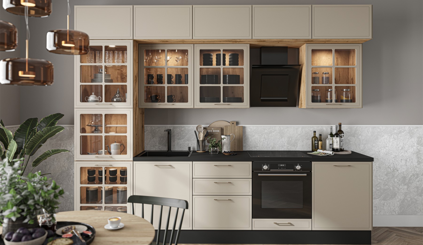 Модульная кухня «Равенна Спарк» — стильное сочетание классики и современности. Элегантные фасады в цвете «Сфинкс» гармонируют с тёплым древесным декором «Дуб Вотан», создавая уютную и благородную атмосферу. Металлические ручки в оттенке «Брашированное золото» и утончённая фрезеровка придают кухне изысканный вид. Корпуса витрин и антресолей выполнены в едином тоне с задними стенками, что подчёркивает целостность дизайна. Модульная система предлагает множество решений для удобной организации пространства — например, пенал с витринами, идеально подходящий для красивой посуды и декора.