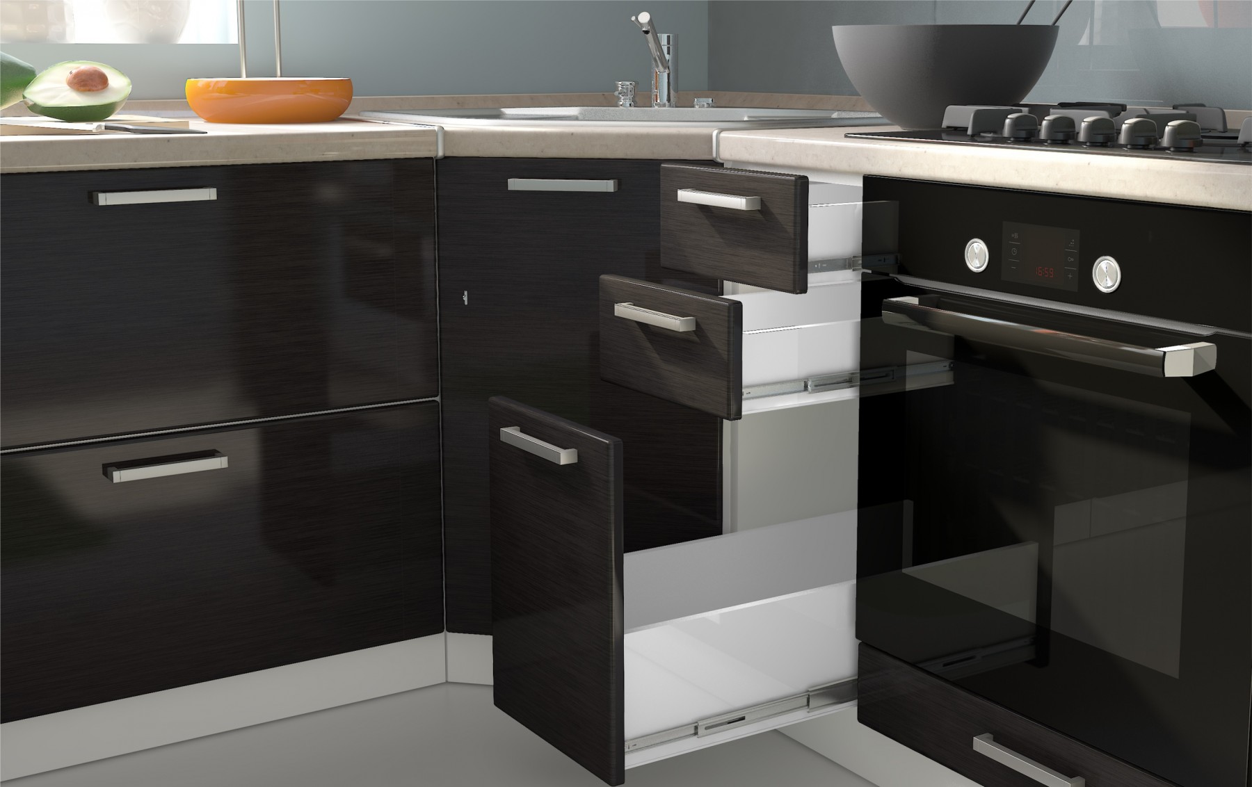 Угловая кухня является выигрышным вариантом – увеличивает площадь рабочей поверхности, задействовав угол комнаты. В кухне Равенна Стайл два вида угловых шкафов: