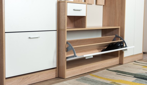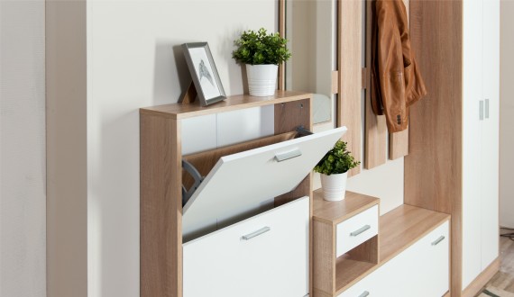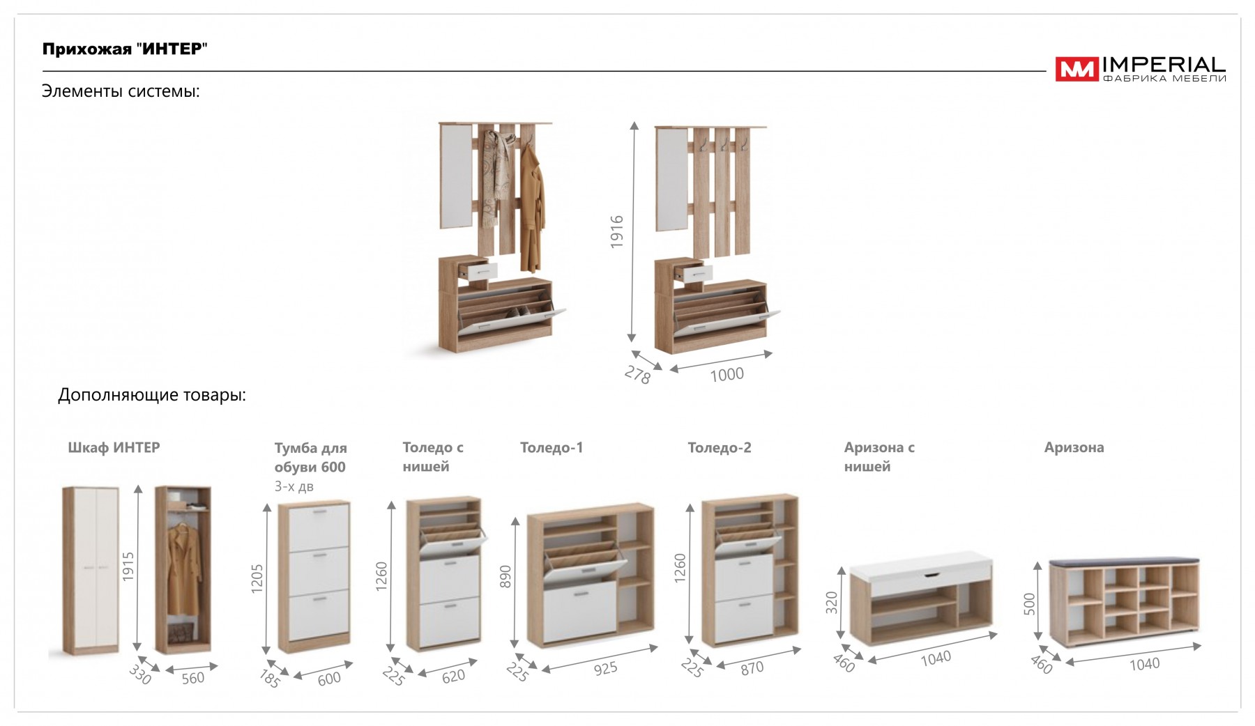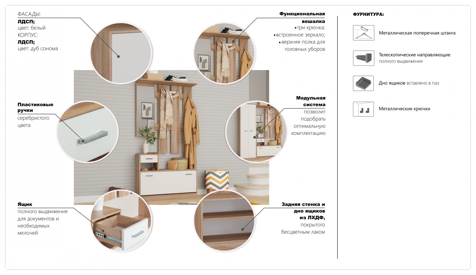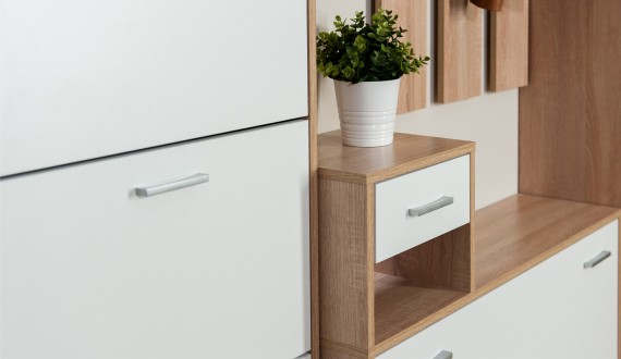 Интер – это современная прихожая в стиле минимализма, минимум декора, максимум функционала. Компактная и вместительная, с небольшой глубиной поможет правильно организовать пространство в помещении даже с небольшой площадью. Прихожая включает в себя необходимые модули: вешалка с крючками, вместительные обувницы, выдвижные ящики для мелочей, зеркало, шкаф с распашными дверями, выдвижной вешалкой и полками. Модное сочетание нейтральных природных цветов наполнит комнату светом, визуально увеличит пространство. Прихожая подойдет тем, кто любит практичность и разумность.