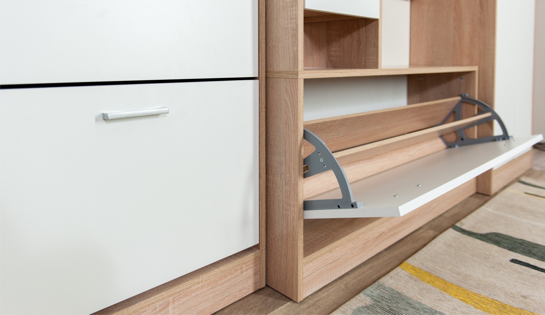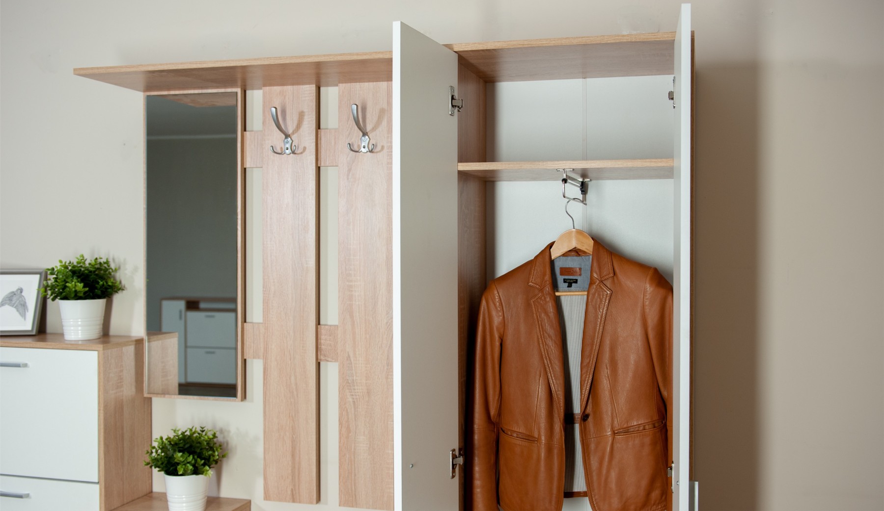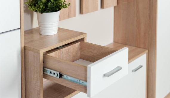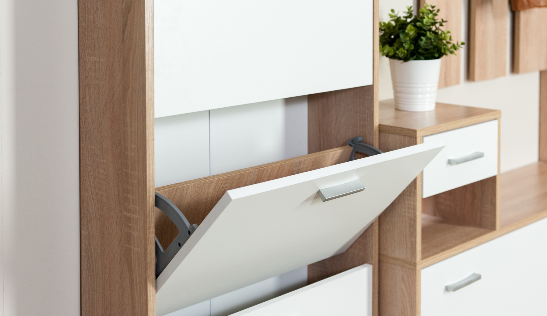 Интер – это современная прихожая в стиле минимализма, минимум декора, максимум функционала. Компактная и вместительная, с небольшой глубиной поможет правильно организовать пространство в помещении даже с небольшой площадью. Прихожая включает в себя необходимые модули: вешалка с крючками, вместительные обувницы, выдвижные ящики для мелочей, зеркало, шкаф с распашными дверями, выдвижной вешалкой и полками. Модное сочетание нейтральных природных цветов наполнит комнату светом, визуально увеличит пространство. Прихожая подойдет тем, кто любит практичность и разумность.