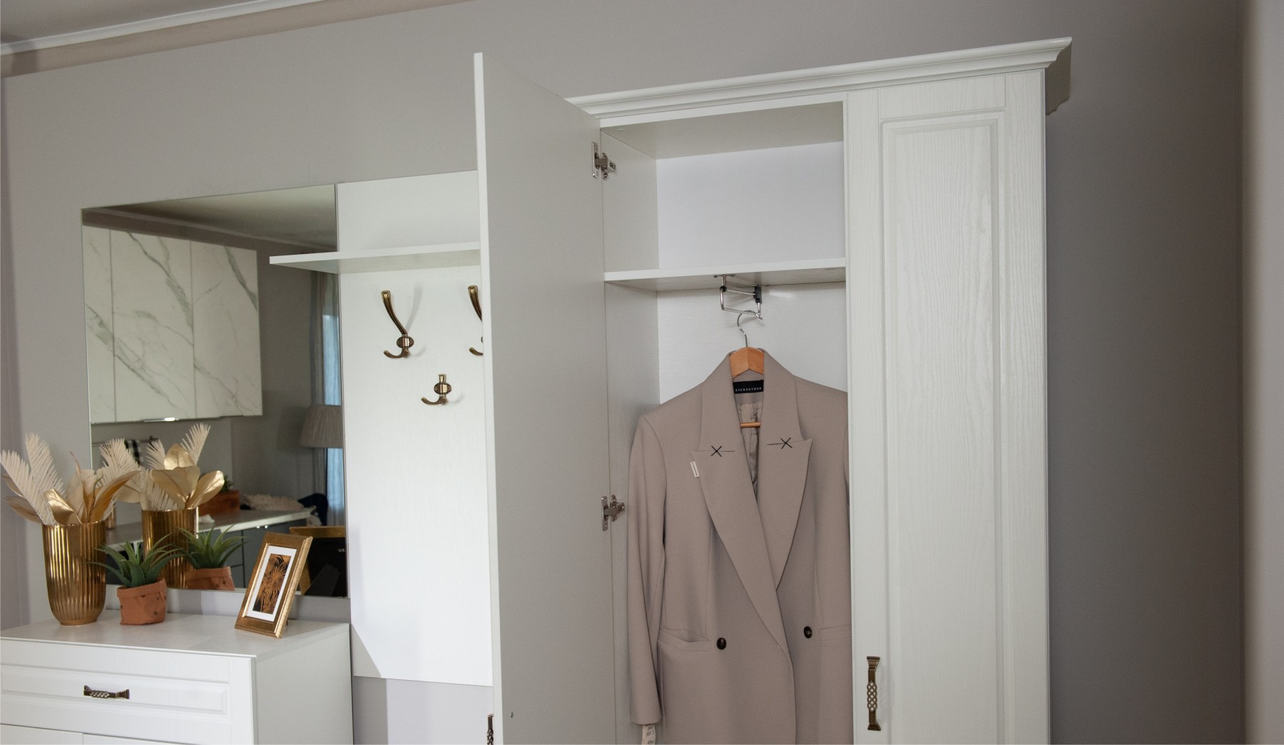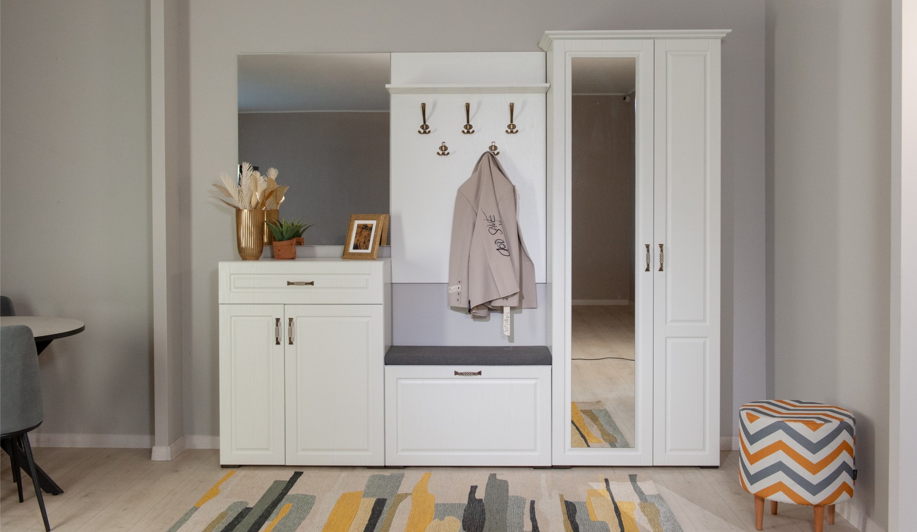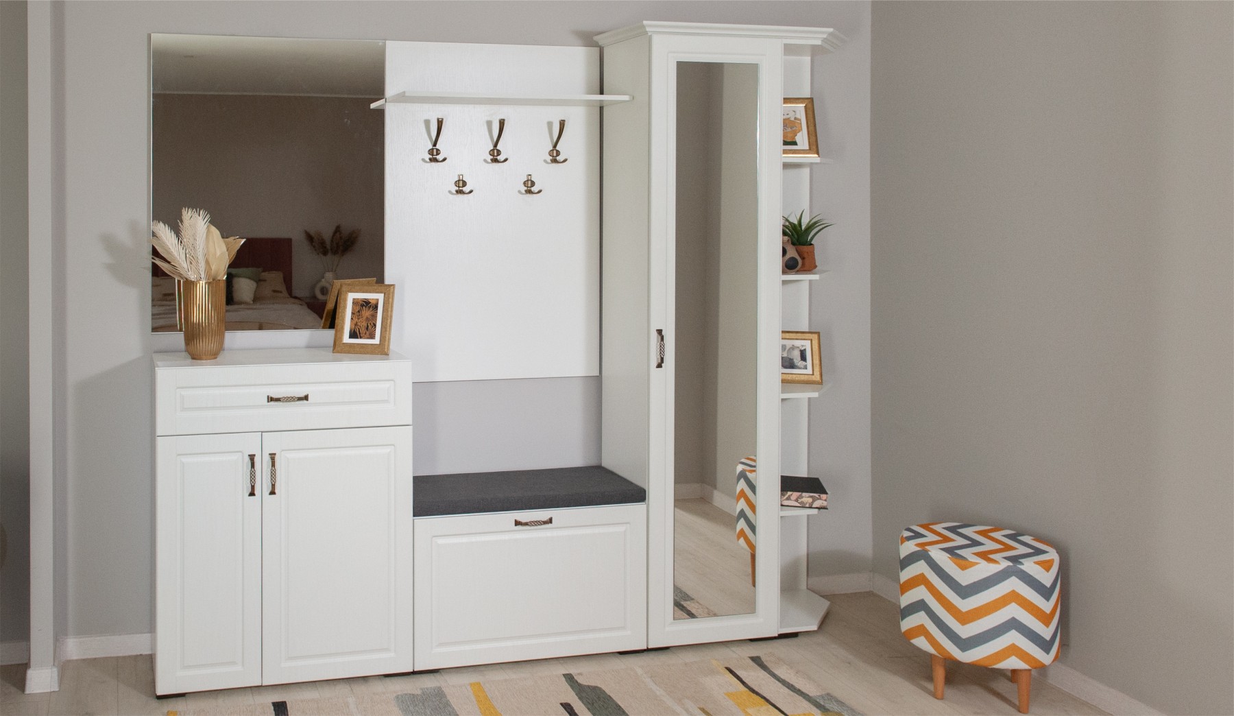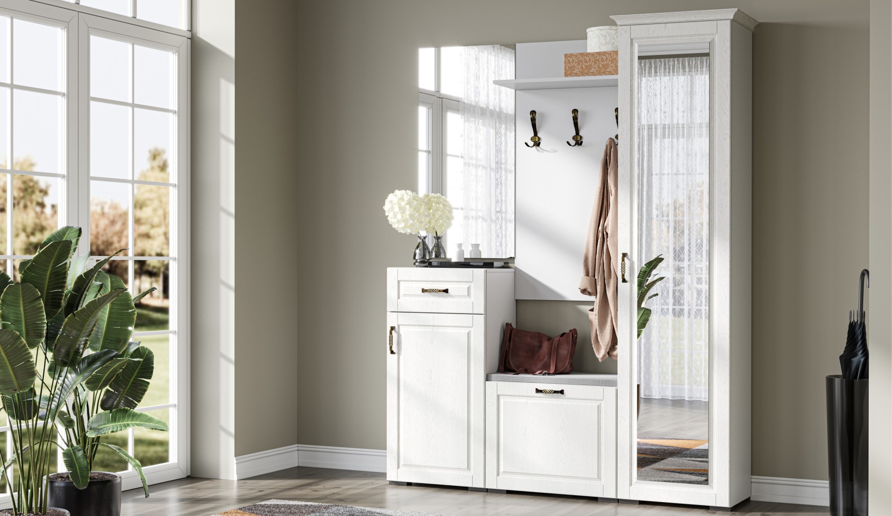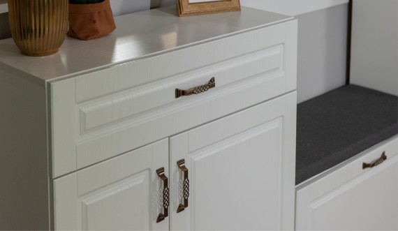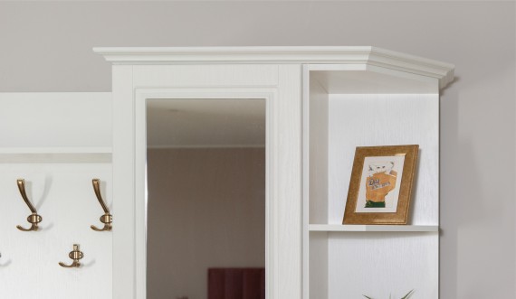 Прихожая Лацио в стиле неоклассики, обладающая высокой функциональностью, соответствует самым актуальным тенденциям в дизайне мебели. Фасады из МДФ с фрезерованной рамкой и имитацией текстуры дерева в сочетании с металлическими ручками добавляют ей изысканности и выразительности. Благодаря белоснежному цвету декора, прихожая визуально расширяет пространство. Большой ассортимент модулей позволяет выстроить систему хранения даже в ограниченном пространстве. Мебель выполнена из качественных материалов, гарантирующих долговечность и безопасность: корпус из экологичного ЛДСП класса эмиссии Е1, петли выдерживают 100 тыс. циклов открывания-закрывания (по ГОСТу достаточно 20 тыс. циклов), задняя стенка и дно ящиков из ламинированной плиты ХДФ, в ящиках комодов телескопические направляющие полного выдвижения.
