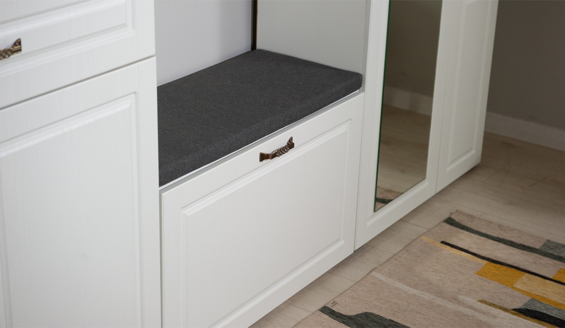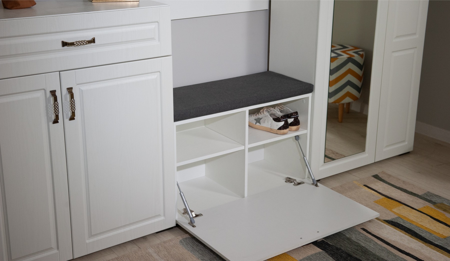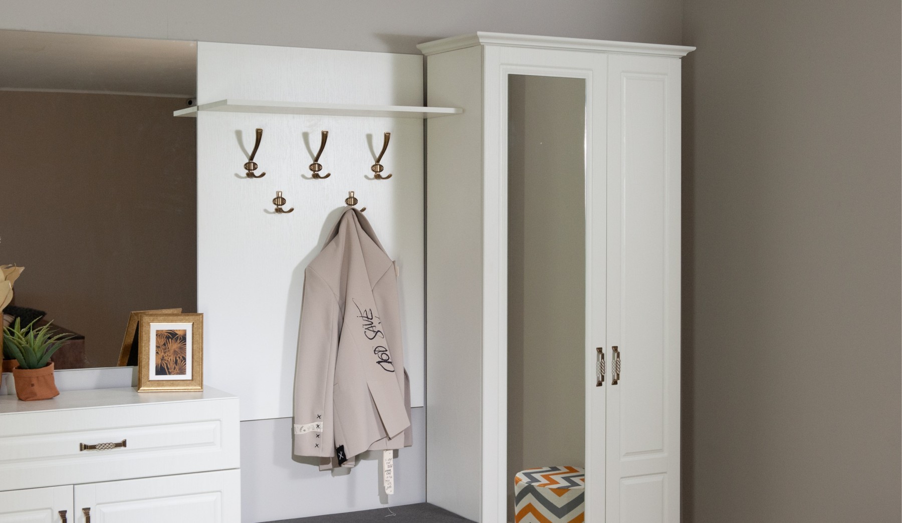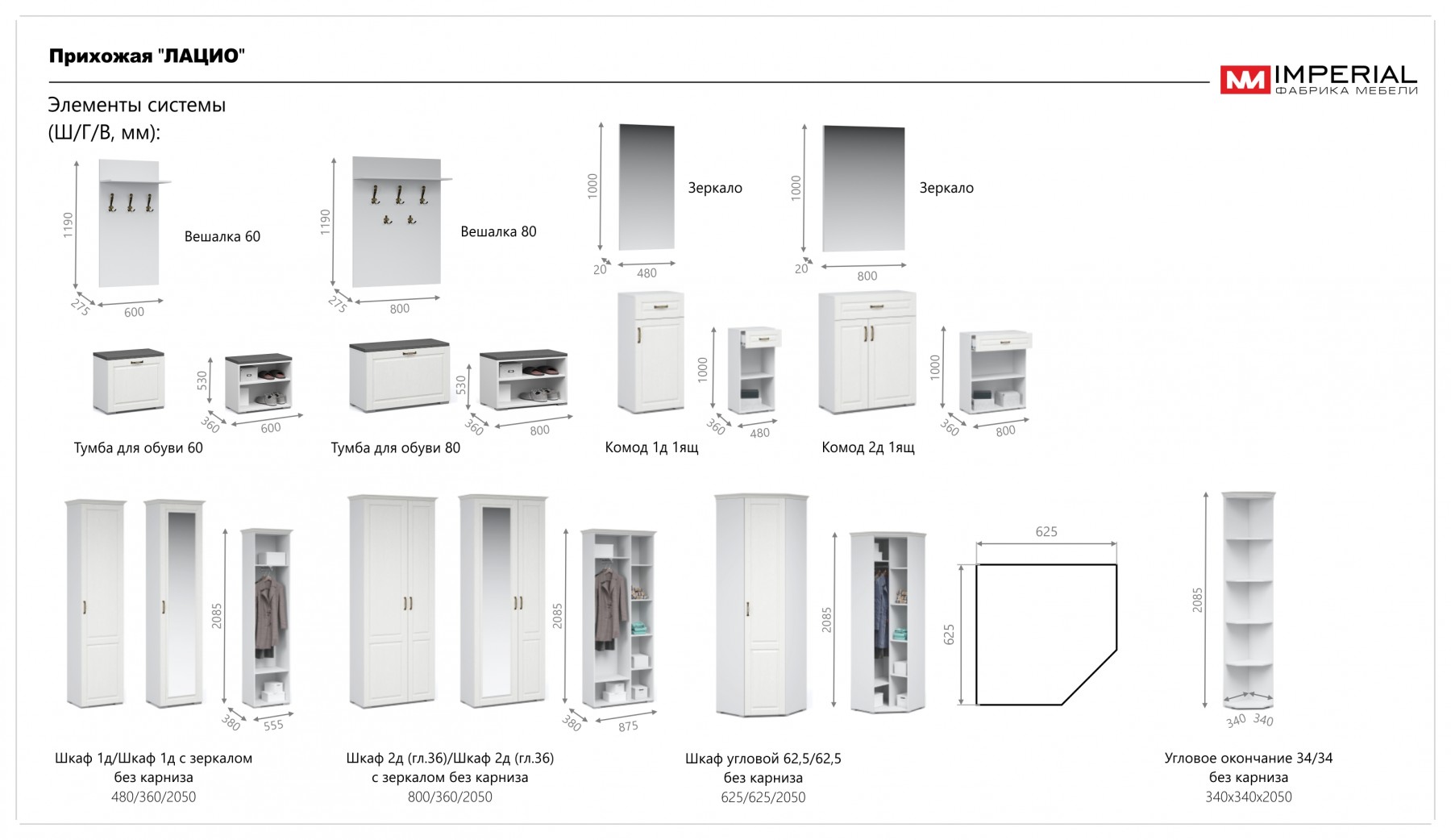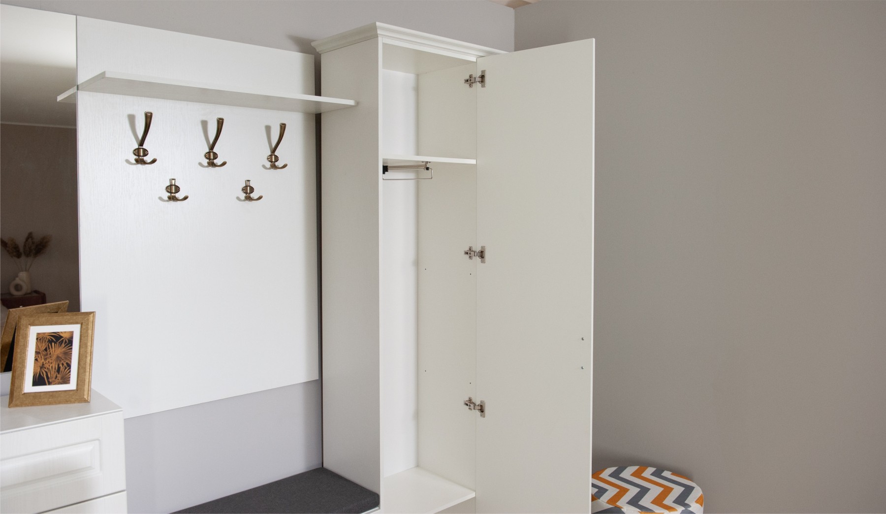 Прихожая Лацио в стиле неоклассики, обладающая высокой функциональностью, соответствует самым актуальным тенденциям в дизайне мебели. Фасады из МДФ с фрезерованной рамкой и имитацией текстуры дерева в сочетании с металлическими ручками добавляют ей изысканности и выразительности. Благодаря белоснежному цвету декора, прихожая визуально расширяет пространство. Большой ассортимент модулей позволяет выстроить систему хранения даже в ограниченном пространстве. Мебель выполнена из качественных материалов, гарантирующих долговечность и безопасность: корпус из экологичного ЛДСП класса эмиссии Е1, петли выдерживают 100 тыс. циклов открывания-закрывания (по ГОСТу достаточно 20 тыс. циклов), задняя стенка и дно ящиков из ламинированной плиты ХДФ, в ящиках комодов телескопические направляющие полного выдвижения.