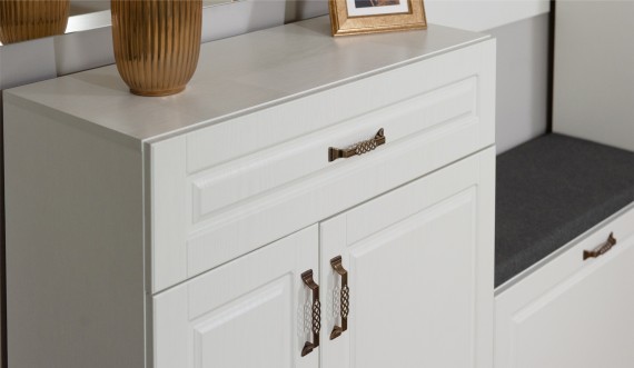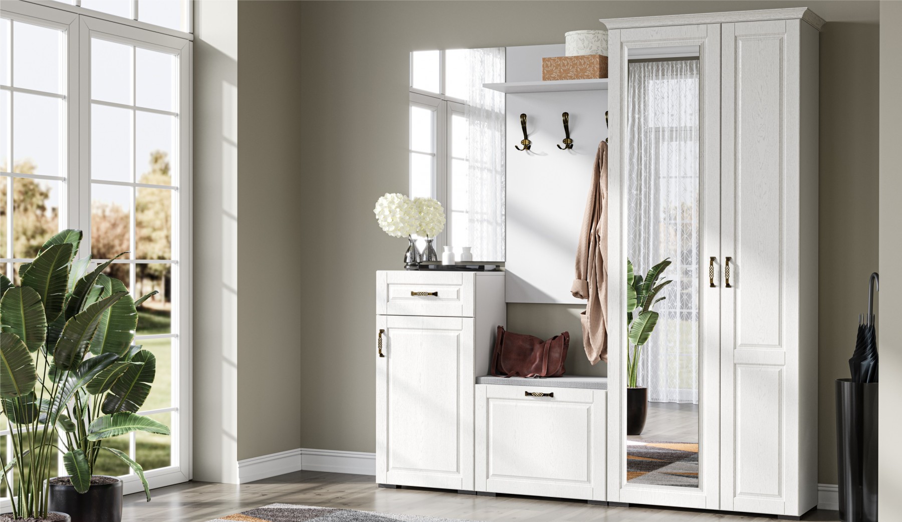 Прихожая Лацио в стиле неоклассики, обладающая высокой функциональностью, соответствует самым актуальным тенденциям в дизайне мебели. Фасады из МДФ с фрезерованной рамкой и имитацией текстуры дерева в сочетании с металлическими ручками добавляют ей изысканности и выразительности. Благодаря белоснежному цвету декора, прихожая визуально расширяет пространство. Большой ассортимент модулей позволяет выстроить систему хранения даже в ограниченном пространстве. Мебель выполнена из качественных материалов, гарантирующих долговечность и безопасность: корпус из экологичного ЛДСП класса эмиссии Е1, петли выдерживают 100 тыс. циклов открывания-закрывания (по ГОСТу достаточно 20 тыс. циклов), задняя стенка и дно ящиков из ламинированной плиты ХДФ, в ящиках комодов телескопические направляющие полного выдвижения.