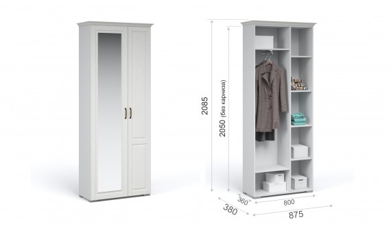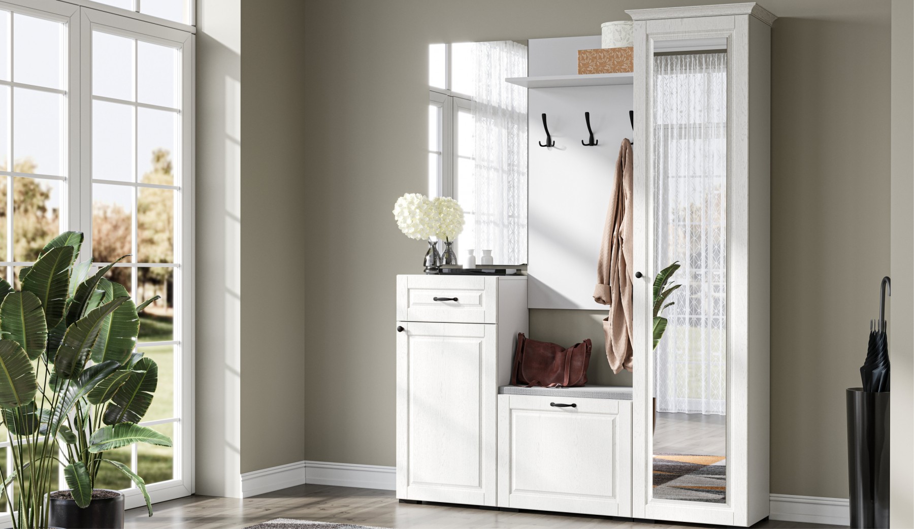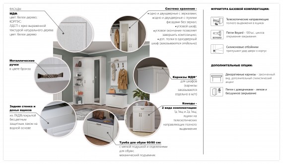 Прихожая Лацио в стиле неоклассики, обладающая высокой функциональностью, соответствует самым актуальным тенденциям в дизайне мебели. Фасады из МДФ с фрезерованной рамкой и имитацией текстуры дерева в сочетании с металлическими ручками добавляют ей изысканности и выразительности. Благодаря белоснежному цвету декора, прихожая визуально расширяет пространство. Большой ассортимент модулей позволяет выстроить систему хранения даже в ограниченном пространстве. Мебель выполнена из качественных материалов, гарантирующих долговечность и безопасность: корпус из экологичного ЛДСП класса эмиссии Е1, петли выдерживают 100 тыс. циклов открывания-закрывания (по ГОСТу достаточно 20 тыс. циклов), задняя стенка и дно ящиков из ламинированной плиты ХДФ, в ящиках комодов телескопические направляющие полного выдвижения.