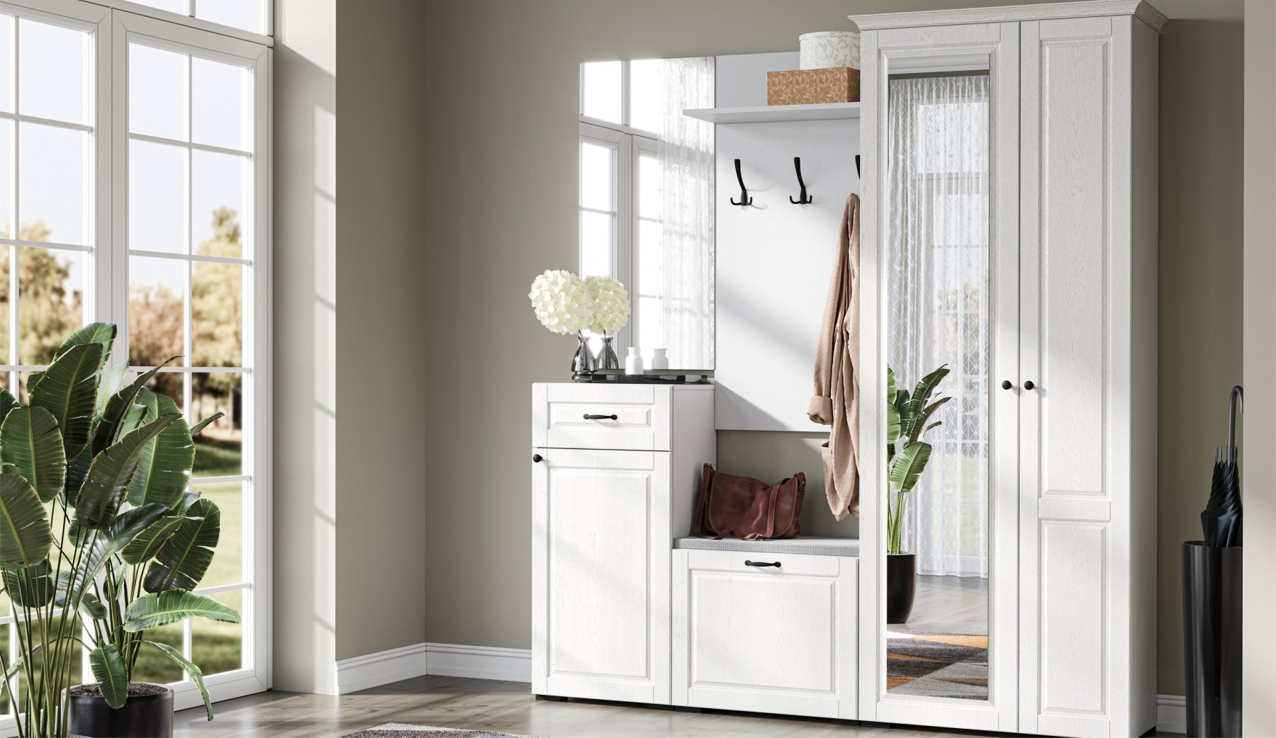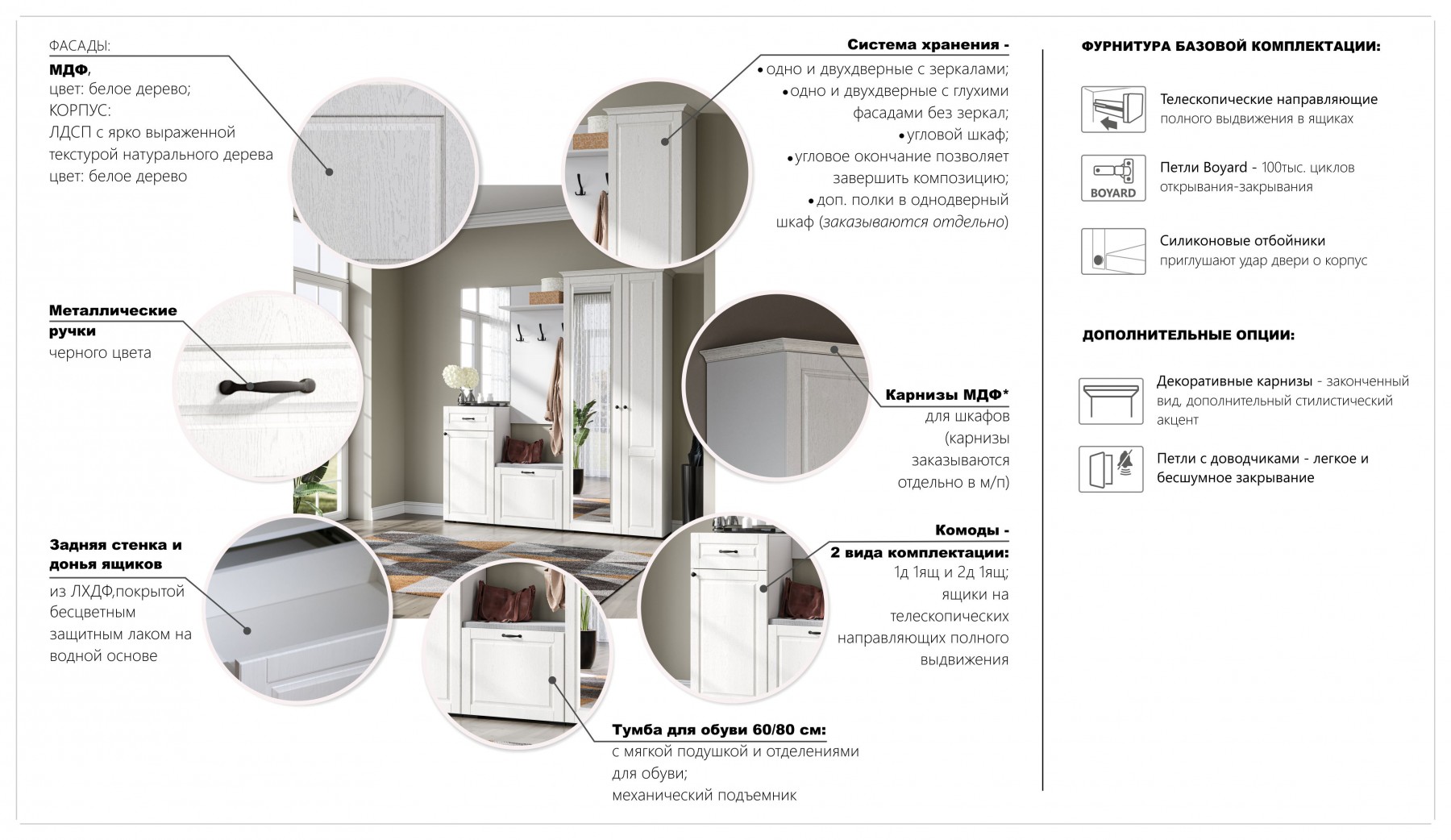 Прихожая Лацио в стиле неоклассики, обладающая высокой функциональностью, соответствует самым актуальным тенденциям в дизайне мебели. Фасады из МДФ с фрезерованной рамкой и имитацией текстуры дерева в сочетании с металлическими ручками добавляют ей изысканности и выразительности. Благодаря белоснежному цвету декора, прихожая визуально расширяет пространство. Большой ассортимент модулей позволяет выстроить систему хранения даже в ограниченном пространстве. Мебель выполнена из качественных материалов, гарантирующих долговечность и безопасность: корпус из экологичного ЛДСП класса эмиссии Е1, петли выдерживают 100 тыс. циклов открывания-закрывания (по ГОСТу достаточно 20 тыс. циклов), задняя стенка и дно ящиков из ламинированной плиты ХДФ, в ящиках комодов телескопические направляющие полного выдвижения.