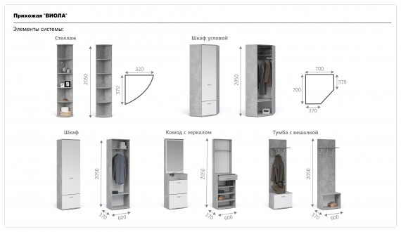Прихожая "Виола" создаст гостеприимную атмосферу в Вашем доме, а небольшая глубина шкафов и возможность выбора модулей позволит разместить гарнитур в прихожей любых размеров. Удобная тумба с зеркалом, вместительный шкаф со штангой, вешалка для одежды и полки для самых разных вещей. Немного декора, и максимум возможностей!
