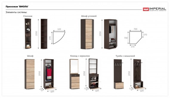 Прихожая "Виола" создаст гостеприимную атмосферу в Вашем доме, а небольшая глубина шкафов и возможность выбора модулей позволит разместить гарнитур в прихожей любых размеров. Удобная тумба с зеркалом, вместительный шкаф со штангой, вешалка для одежды и полки для самых разных вещей. Немного декора, и максимум возможностей!