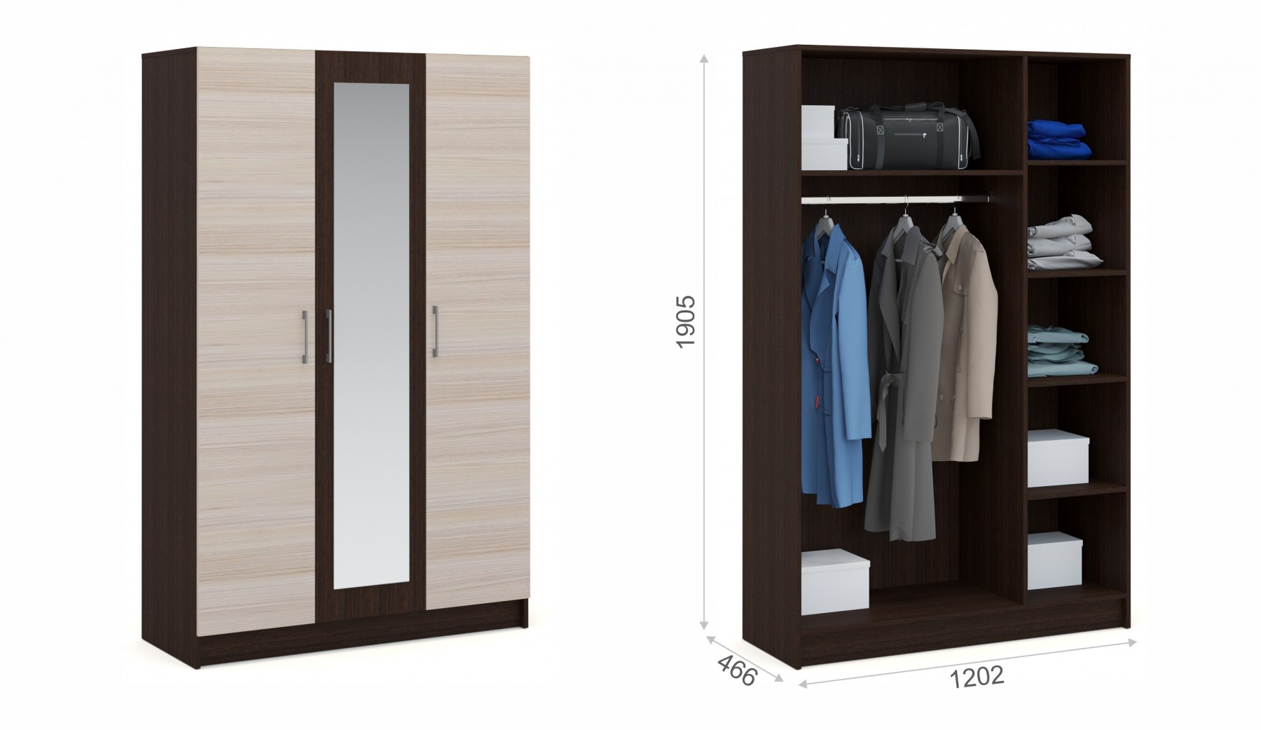 Классический распашной шкаф Алена выполнен в универсальных сочетаниях цветов. Он включает в себя вместительные полки и отделение со штангой, что позволяет создать систему для хранения вещей различного назначения. Зеркала визуально расширяют пространство комнаты, добавляют в комнату больше света и яркости. Идеально компонуется с комплектом спальни Алена.