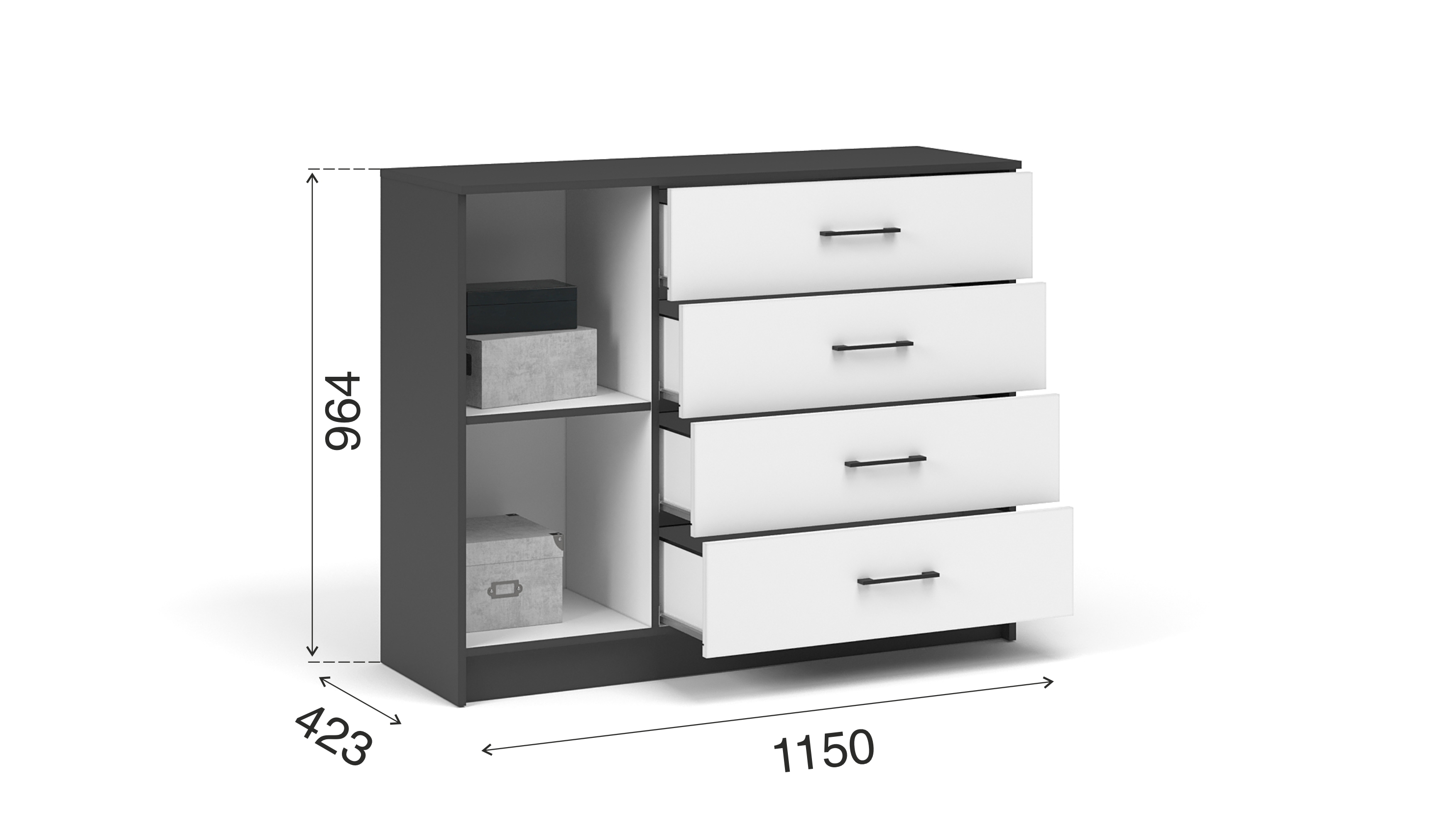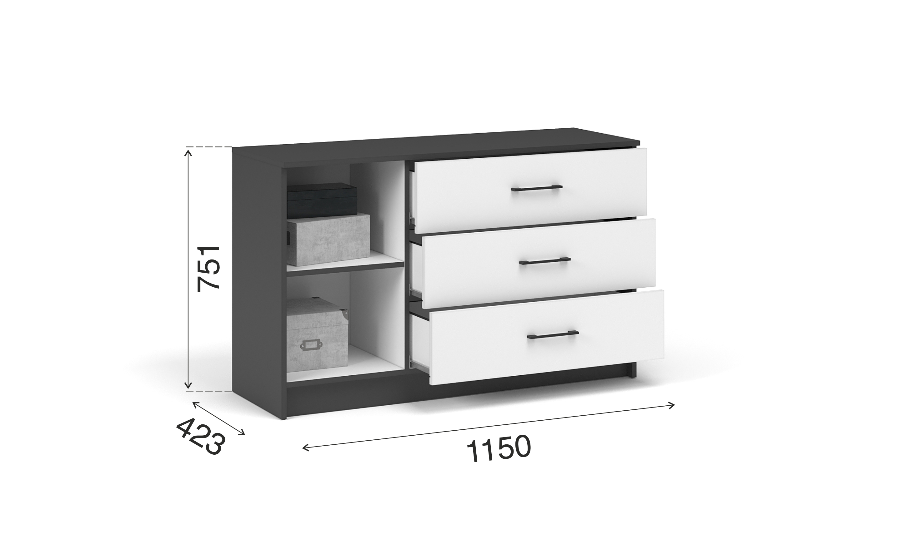 • Дно ящиков и задняя стенка изготовлены из ламинированного ХДФ, который выделяется высокой прочностью и экологической безопасностью, что гарантирует долговечность и надежность мебели