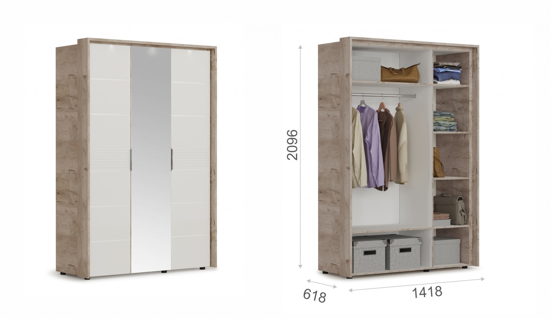Современный распашной шкаф Джулия яркий представитель европейского минимализма. Это шкаф-конструктор, который позволяет выбрать подходящий вам размер, его наполнение и дизайн. На базе корпуса можно создать множество комбинаций: с зеркалами, с глухими глянцевыми фасадами, с порталом из ЛДСП 22мм или без него. Дополнительная опция – светодиодная подсветка, монтируется в верхней части портала над каждой дверью. Шкаф выполнен из экологически безопасных надежных материалов. Декором белым глянцевым фасадам High Gloss служит фрезерованный рисунок «Волна» - подчеркивает зеркальный блеск, делает интерьер спальни особенным и неповторимым. Торцевые ручки из хромированного металла - яркий акцент фасадов. Наполнение шкафа включает в себя вместительные полки и отделения со штангой, что позволяет создать систему для хранения вещей различного назначения. Идеально компонуются со всеми модулями системы Джулия.