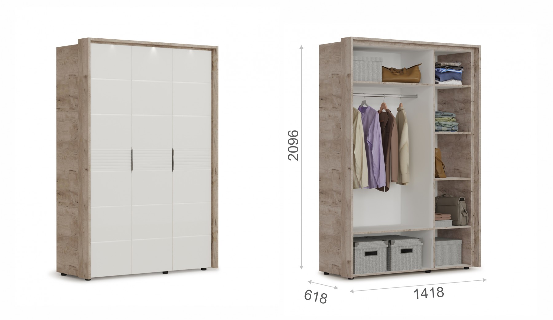 Современный распашной шкаф Джулия яркий представитель европейского минимализма. Это шкаф-конструктор, который позволяет выбрать подходящий вам размер, его наполнение и дизайн. На базе корпуса можно создать множество комбинаций: с зеркалами, с глухими глянцевыми фасадами, с порталом из ЛДСП 22мм или без него. Дополнительная опция – светодиодная подсветка, монтируется в верхней части портала над каждой дверью. Шкаф выполнен из экологически безопасных надежных материалов. Декором белым глянцевым фасадам High Gloss служит фрезерованный рисунок «Волна» - подчеркивает зеркальный блеск, делает интерьер спальни особенным и неповторимым. Торцевые ручки из хромированного металла - яркий акцент фасадов. Наполнение шкафа включает в себя вместительные полки и отделения со штангой, что позволяет создать систему для хранения вещей различного назначения. Идеально компонуются со всеми модулями системы Джулия.