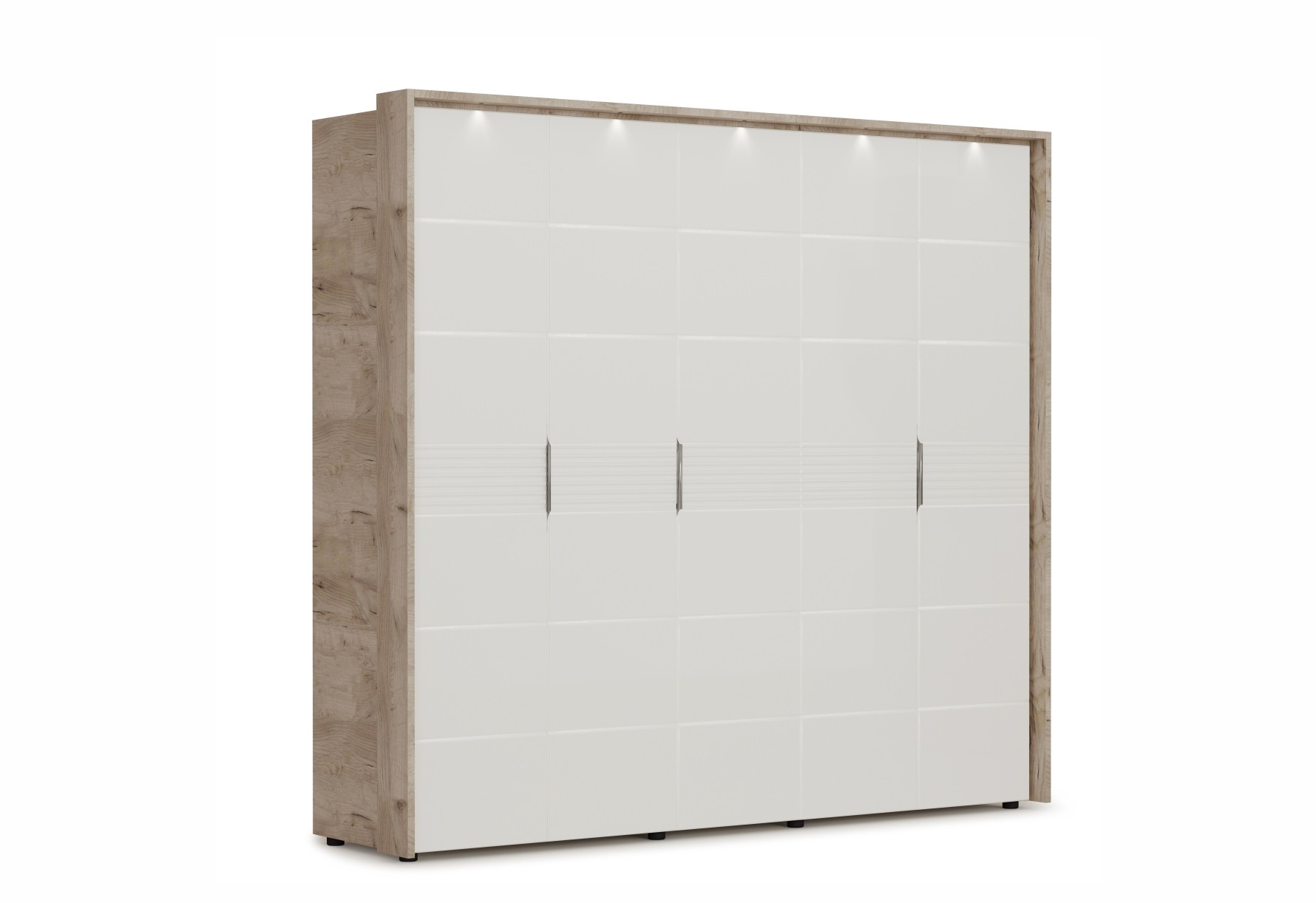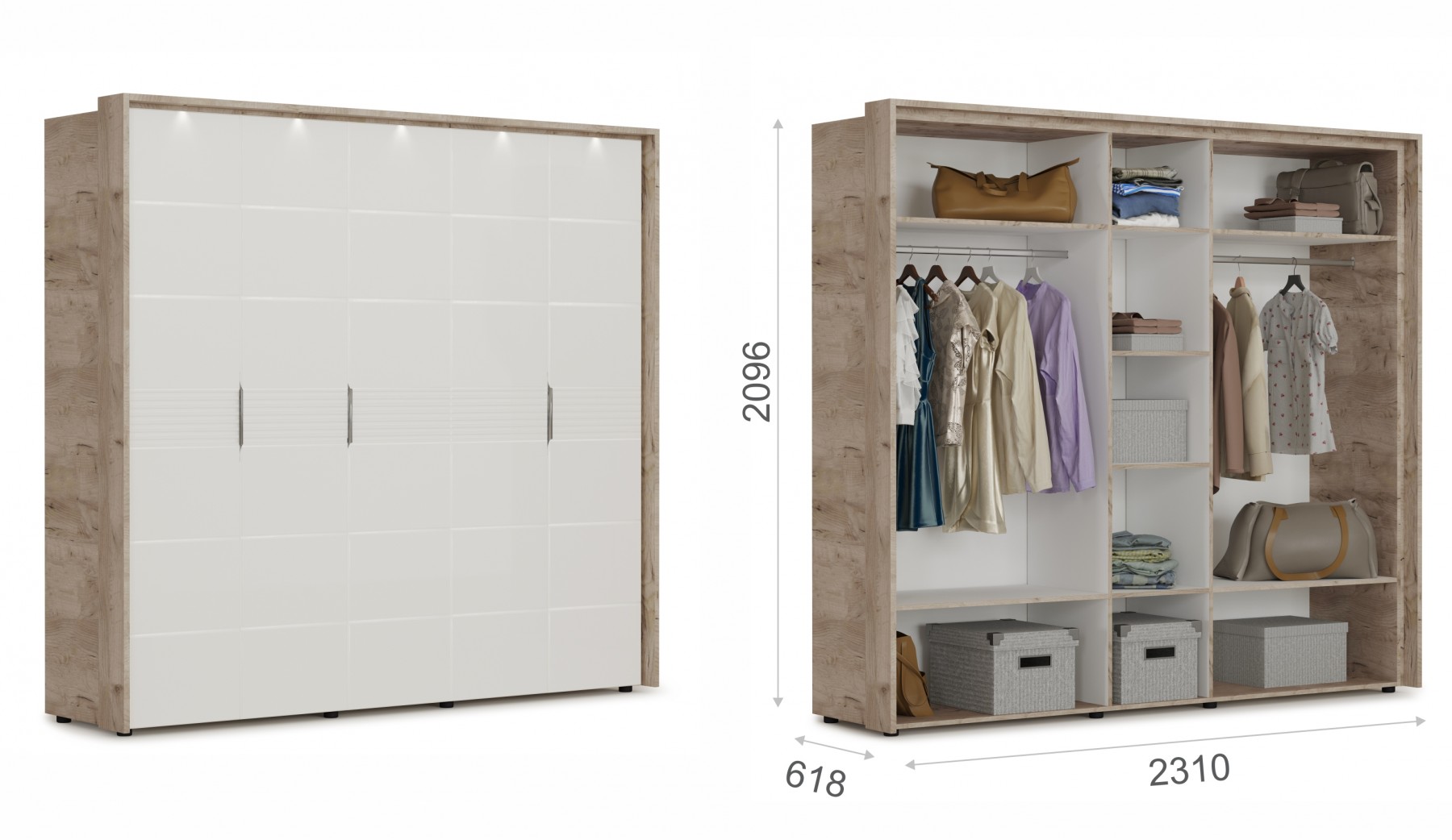 Современный распашной шкаф Джулия яркий представитель европейского минимализма. Это шкаф-конструктор, который позволяет выбрать подходящий вам размер, его наполнение и дизайн. На базе корпуса можно создать множество комбинаций: с зеркалами, с глухими глянцевыми фасадами, с порталом из ЛДСП 22мм или без него. Дополнительная опция – светодиодная подсветка, монтируется в верхней части портала над каждой дверью. Шкаф выполнен из экологически безопасных надежных материалов. Декором белым глянцевым фасадам High Gloss служит фрезерованный рисунок «Волна» - подчеркивает зеркальный блеск, делает интерьер спальни особенным и неповторимым. Торцевые ручки из хромированного металла - яркий акцент фасадов. Наполнение шкафа включает в себя вместительные полки и отделения со штангой, что позволяет создать систему для хранения вещей различного назначения. Идеально компонуются со всеми модулями системы Джулия.