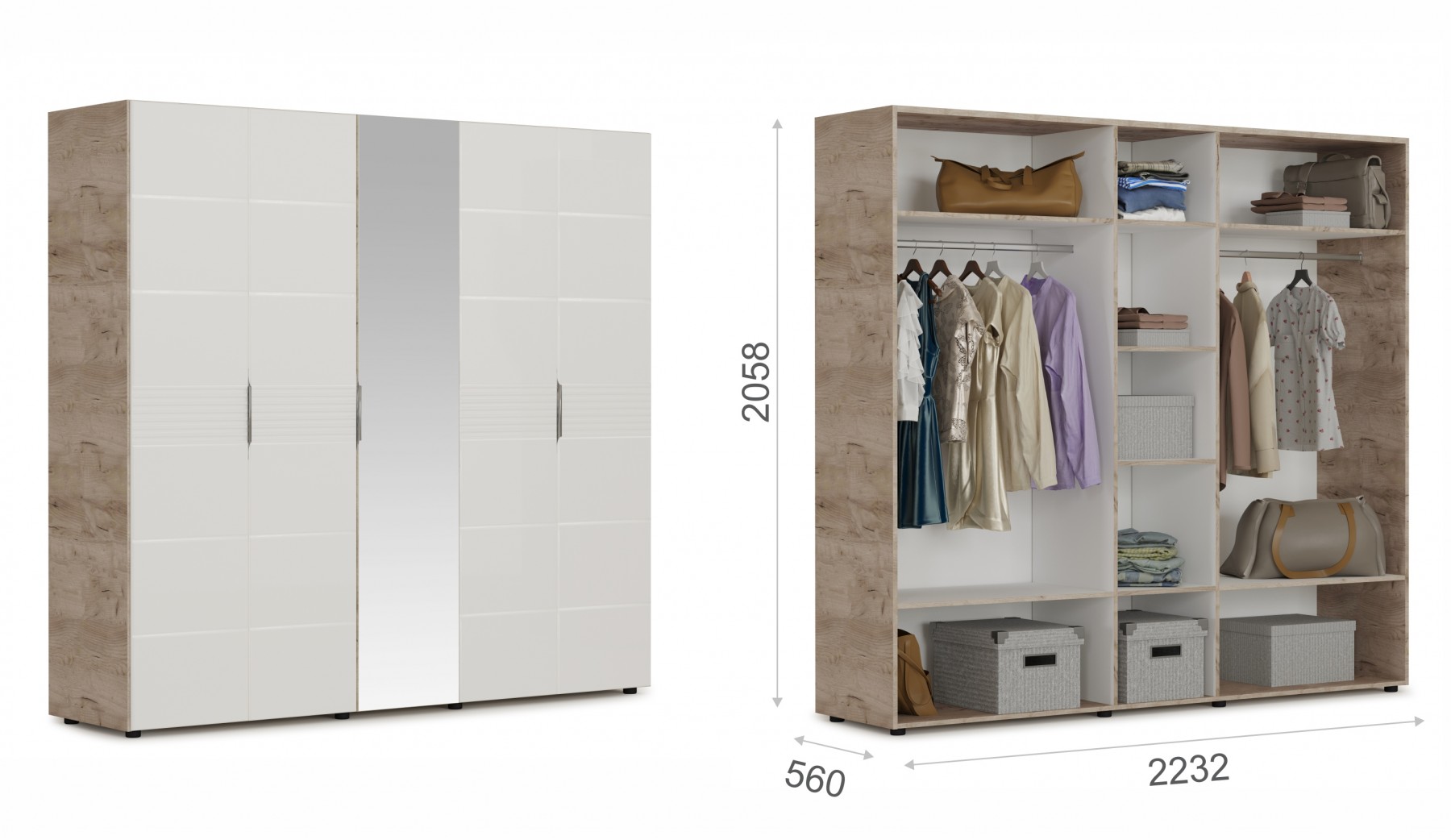 Современный распашной шкаф Джулия яркий представитель европейского минимализма. Это шкаф-конструктор, который позволяет выбрать подходящий вам размер, его наполнение и дизайн. На базе корпуса можно создать множество комбинаций: с зеркалами, с глухими глянцевыми фасадами, с порталом из ЛДСП 22мм или без него. Дополнительная опция – светодиодная подсветка, монтируется в верхней части портала над каждой дверью. Шкаф выполнен из экологически безопасных надежных материалов. Декором белым глянцевым фасадам High Gloss служит фрезерованный рисунок «Волна» - подчеркивает зеркальный блеск, делает интерьер спальни особенным и неповторимым. Торцевые ручки из хромированного металла - яркий акцент фасадов. Наполнение шкафа включает в себя вместительные полки и отделения со штангой, что позволяет создать систему для хранения вещей различного назначения. Идеально компонуются со всеми модулями системы Джулия.