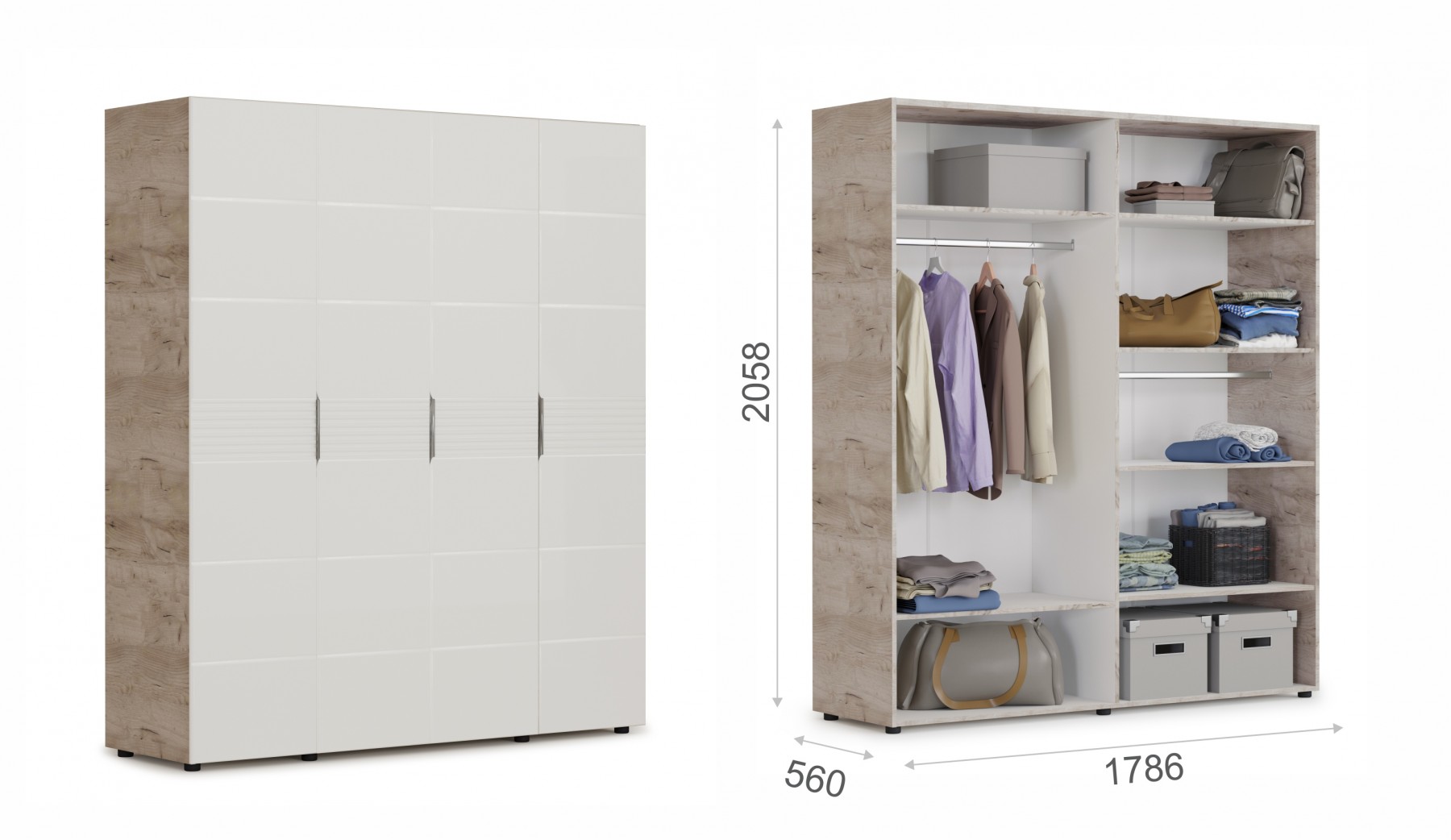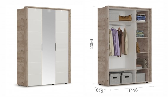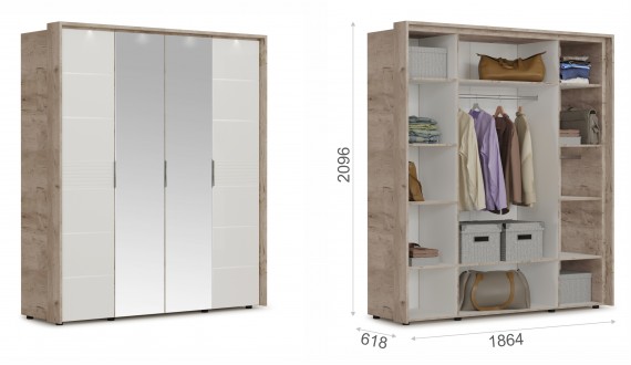 Современный распашной шкаф Джулия яркий представитель европейского минимализма. Это шкаф-конструктор, который позволяет выбрать подходящий вам размер, его наполнение и дизайн. На базе корпуса можно создать множество комбинаций: с зеркалами, с глухими глянцевыми фасадами, с порталом из ЛДСП 22мм или без него. Дополнительная опция – светодиодная подсветка, монтируется в верхней части портала над каждой дверью. Шкаф выполнен из экологически безопасных надежных материалов. Декором белым глянцевым фасадам High Gloss служит фрезерованный рисунок «Волна» - подчеркивает зеркальный блеск, делает интерьер спальни особенным и неповторимым. Торцевые ручки из хромированного металла - яркий акцент фасадов. Наполнение шкафа включает в себя вместительные полки и отделения со штангой, что позволяет создать систему для хранения вещей различного назначения. Идеально компонуются со всеми модулями системы Джулия.