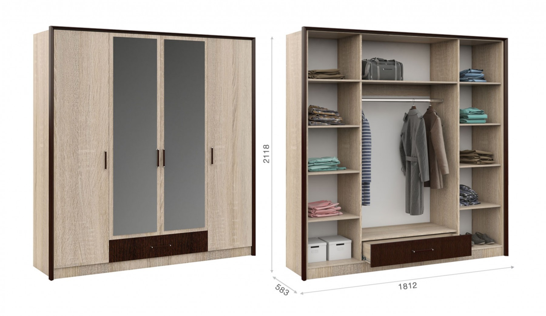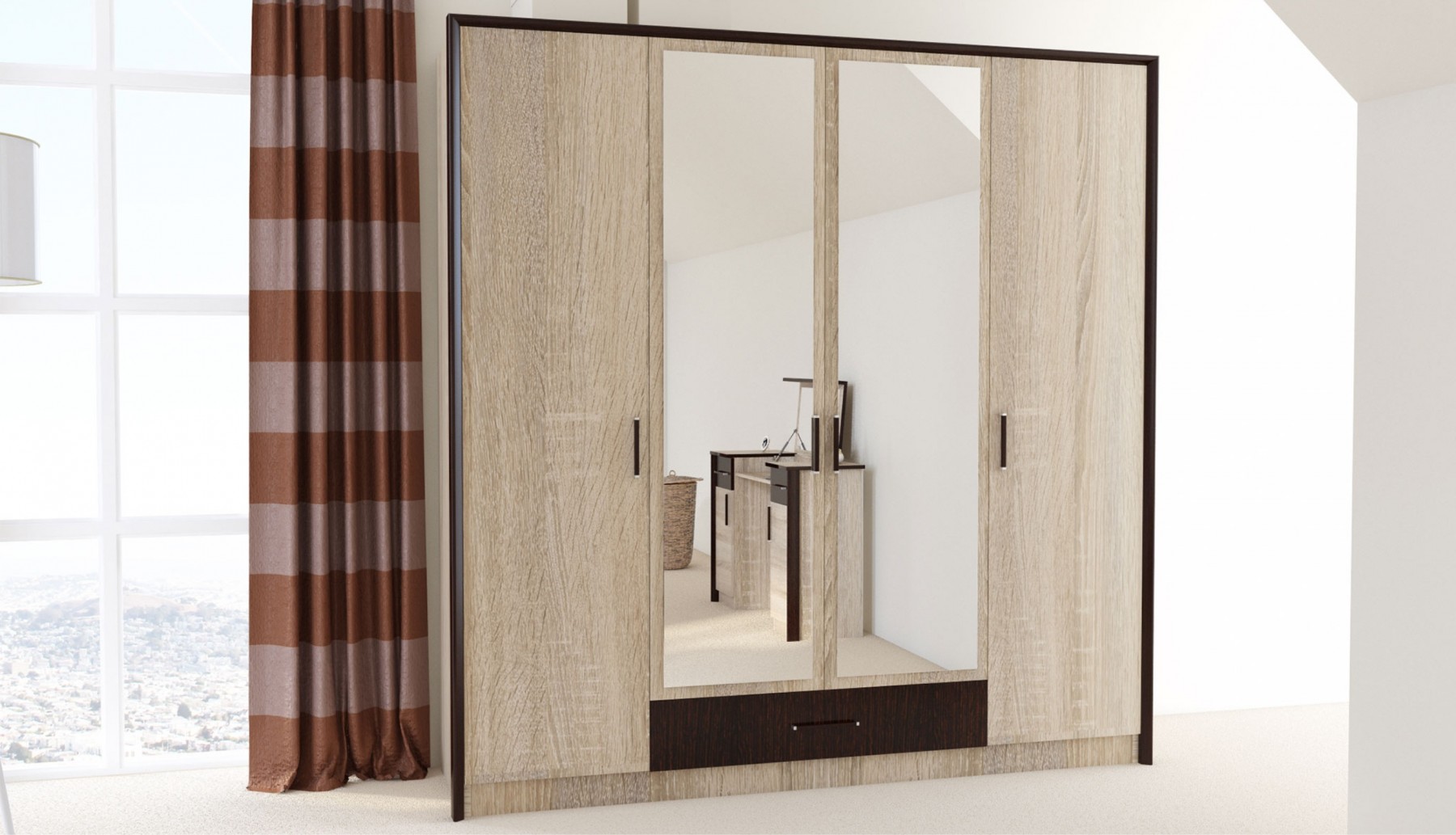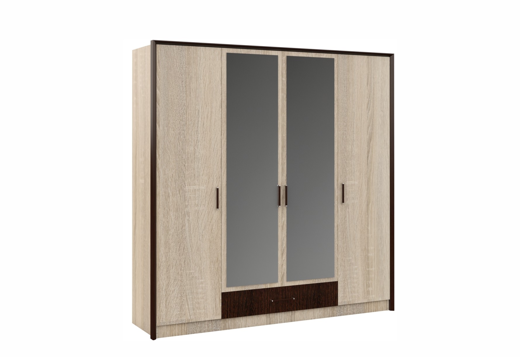 Классический распашной четырехдверный шкаф с дополнительным выдвижным ящиком выполнен в стиле минимализм: строгие черты, функциональность и простота. Контрастный профиль из МДФ 22мм по внешним углам со скругленными краями – максимально безопасное использование мебели. Кромка цвета венге подчеркивает древесную текстуру и рисунок светлого дуба сонома. Зеркала позволяют рассмотреть себя в полный рост, сделают комнату светлее и визуально просторнее. Шкаф легко впишется в обстановку любой комнаты.