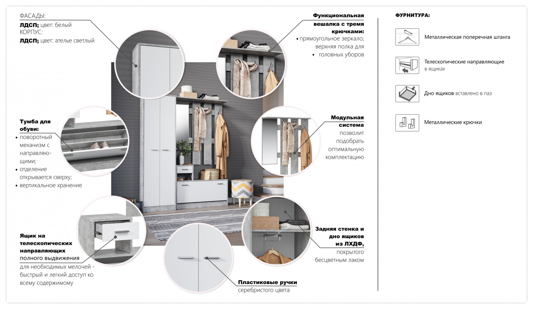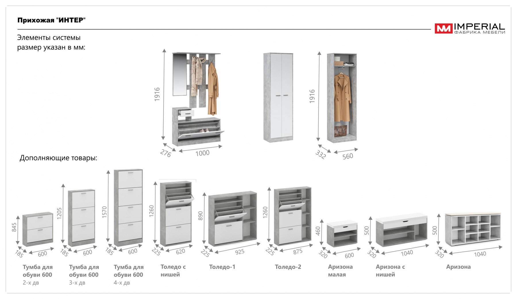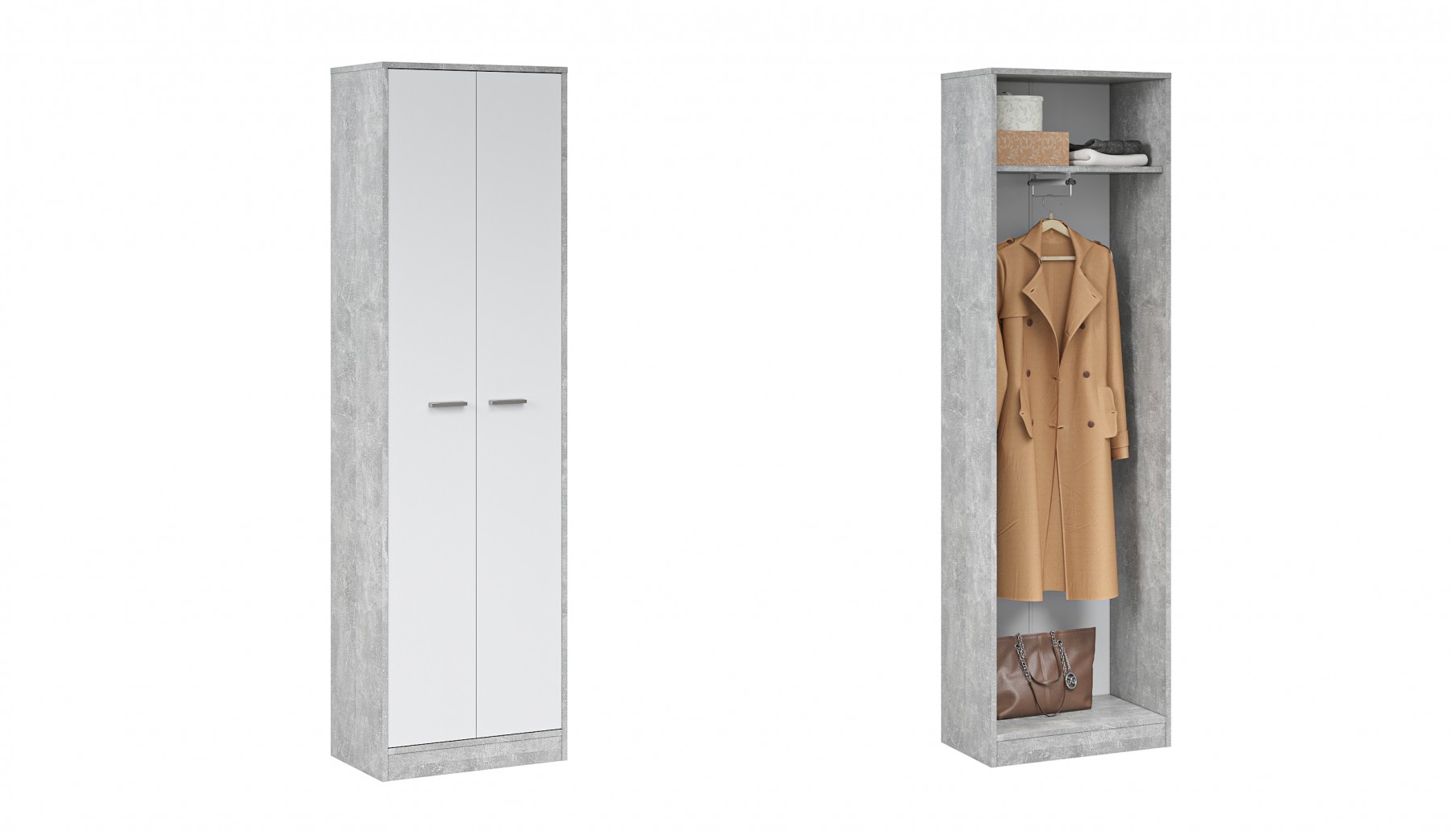 Шкаф «Интер» - это удобное и функциональное место для хранения верхней одежды, обуви, сумок. Выполнен в стиле минимализм: простота, строгая геометрия, отсутствие декора. Благодаря классической нейтральной цветовой гамме гармонично впишется в любой интерьер. Подойдет для небольшой прихожей. Может использоваться как отдельный модуль, так и в составе с прихожей «Интер».