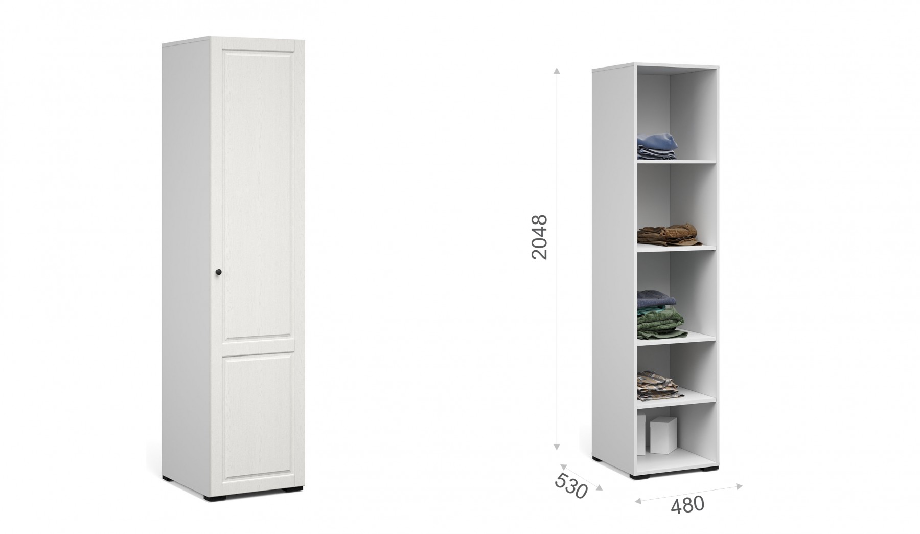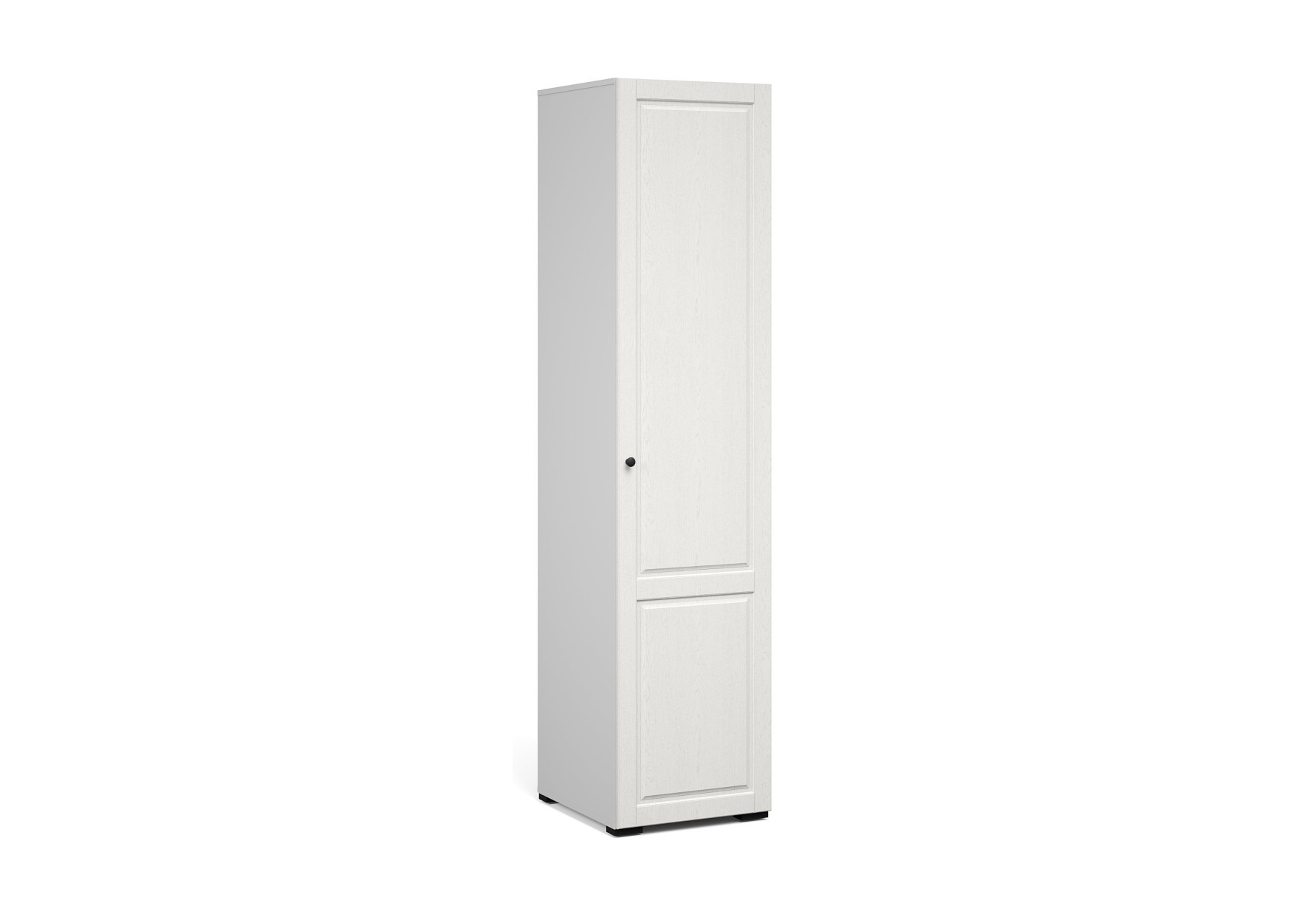 Распашной однодверный пенал – это решение в современном классическом стиле для небольшой спальни, гостиной или прихожей. Сочетает в себе функциональность и эффектный внешний вид – фрезерованные фасады из МДФ с текстурой дерева и фигурный карниз. Белый цвет фасадов наполняет комнату светом, делает ее воздушнее. Оригинальные металлические ручки придают изысканность. Отделение с полками поместит в себя одежду, коробки с обувью и головные уборы. Мебель выполнена из экологичных материалов.