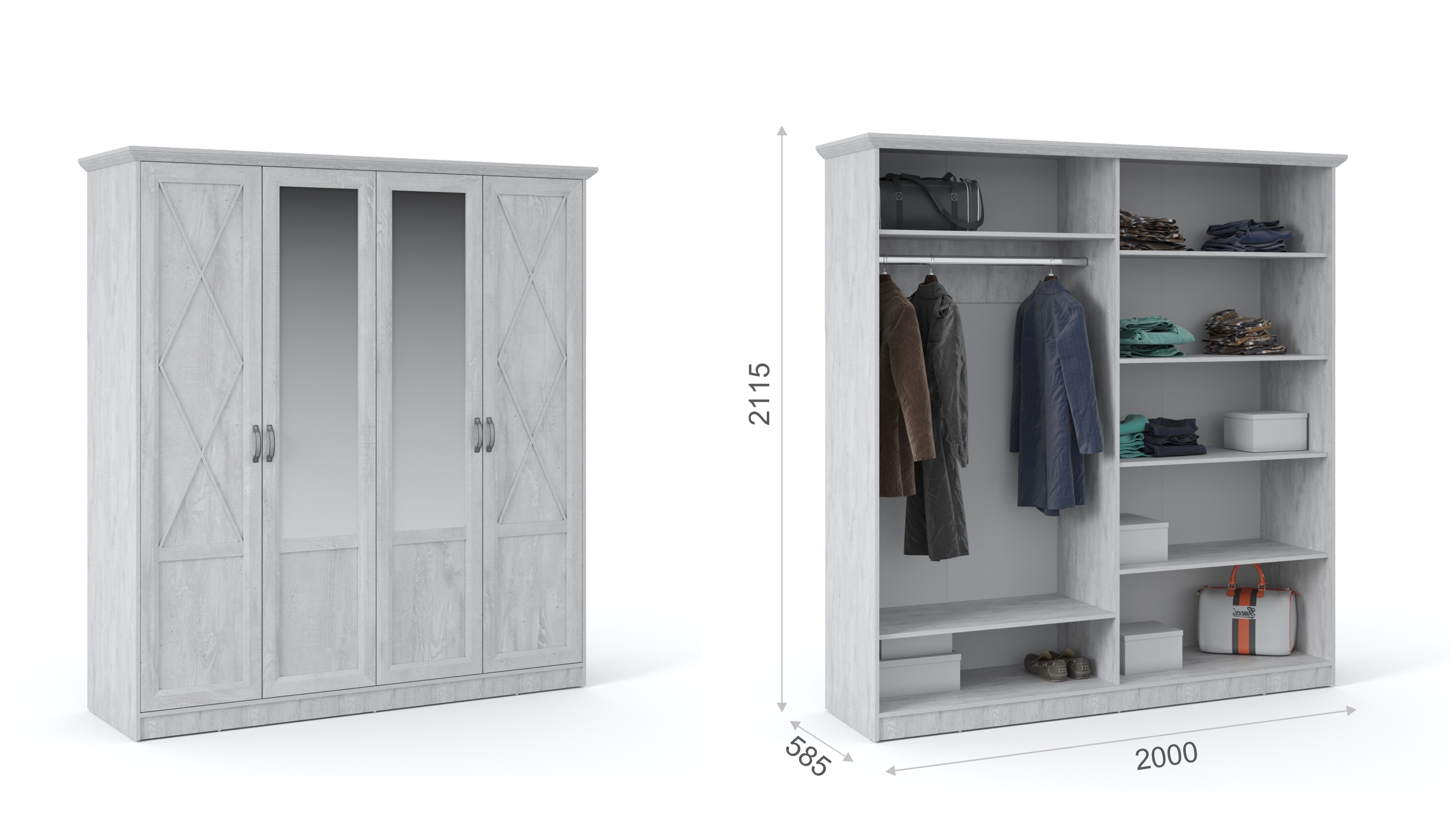 Распашной трехдверный шкаф выполнен в популярном стиле неоклассика – белые рамочные фасады с фактурой и рисунком натурального дерева, декоративные крестообразные накладки, фигурные ножки и карниз все это придает комнате элегантный и светлый вид. Вместительные отделения со штангой и полками поместит в себя верхнюю одежду, коробки с обувью и головные уборы. Мебель выполнена из экологичных материалов.