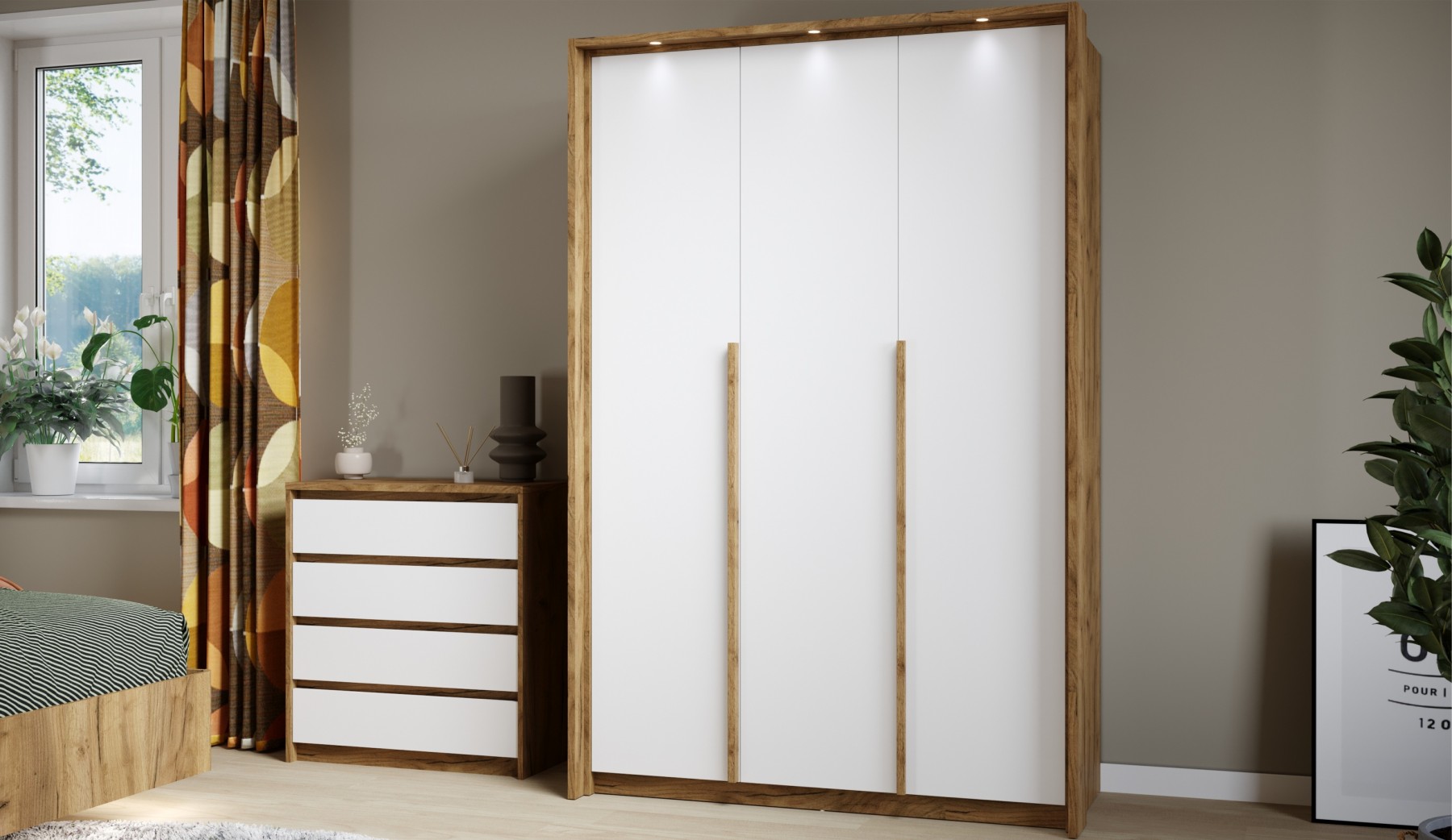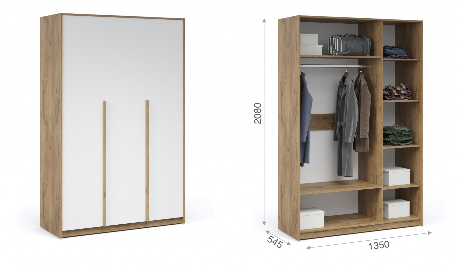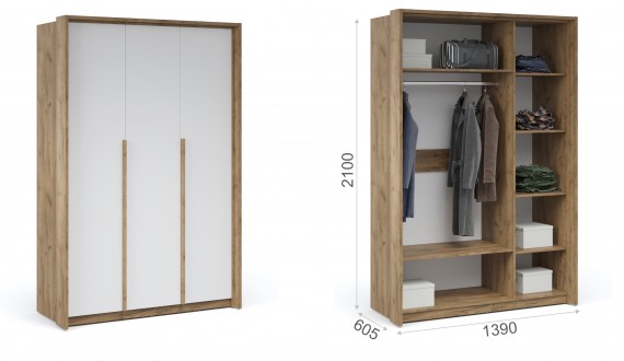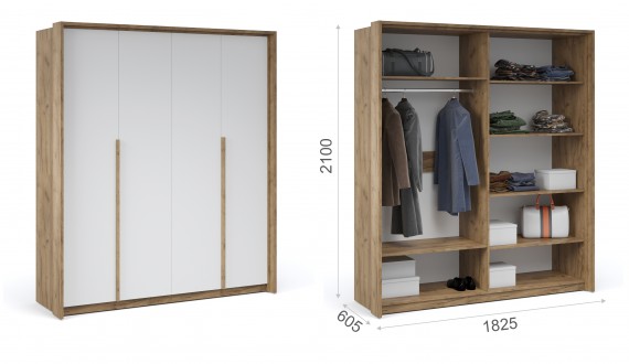 Функциональный распашной шкаф с массивными ручками контрастного цвета включает в себя вместительные полки и отделения со штангой, что позволяет создать систему для хранения вещей различного назначения. Встраиваемая в портал LED подсветка – оригинальное дизайнерское решение и дополнительный источник освещения. Современные цвета декора корпуса и белоснежный фасад добавят в жилое помещение света, уюта и комфорта. Идеально компонуется со всеми модулями системы Мишель.