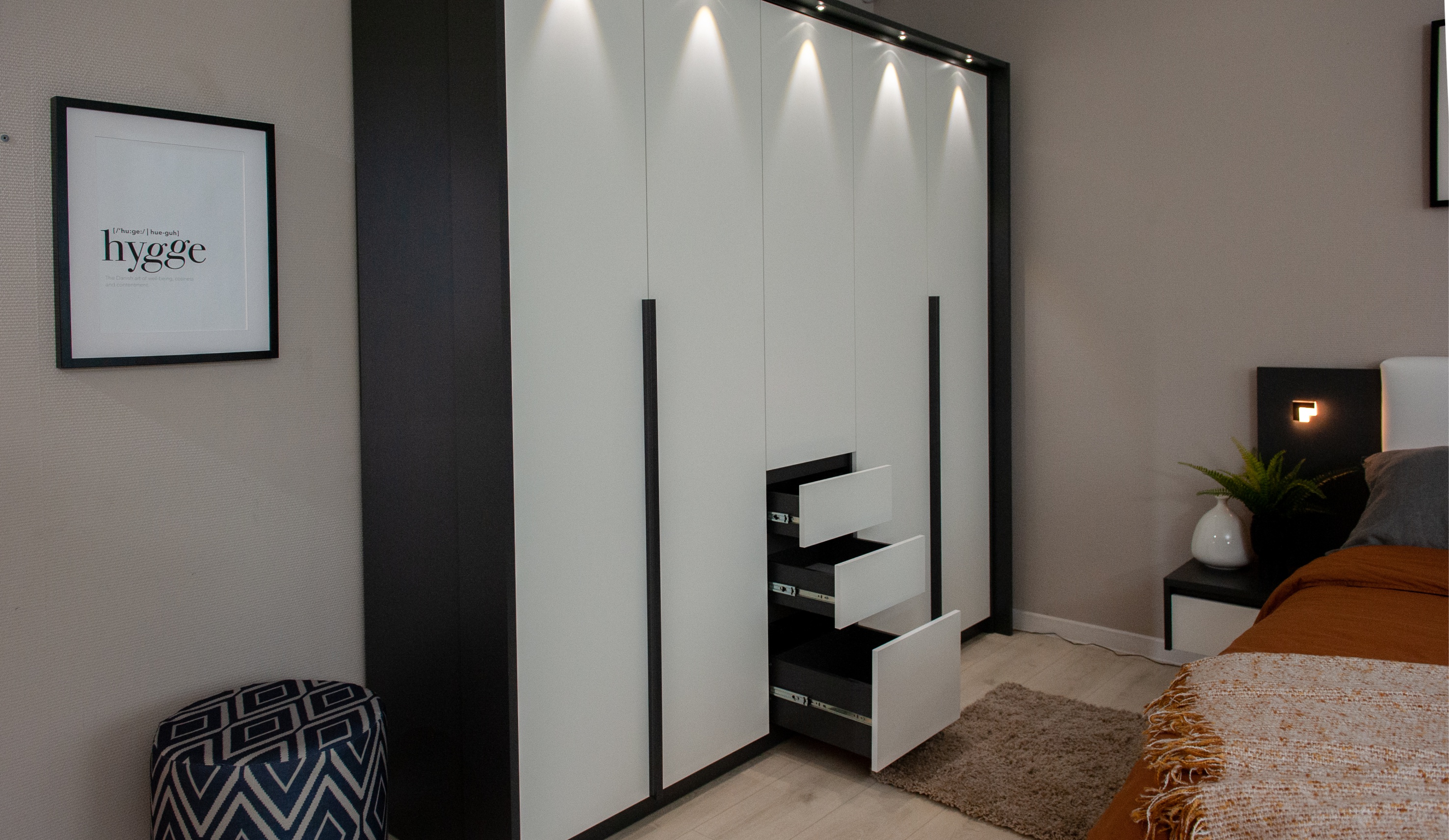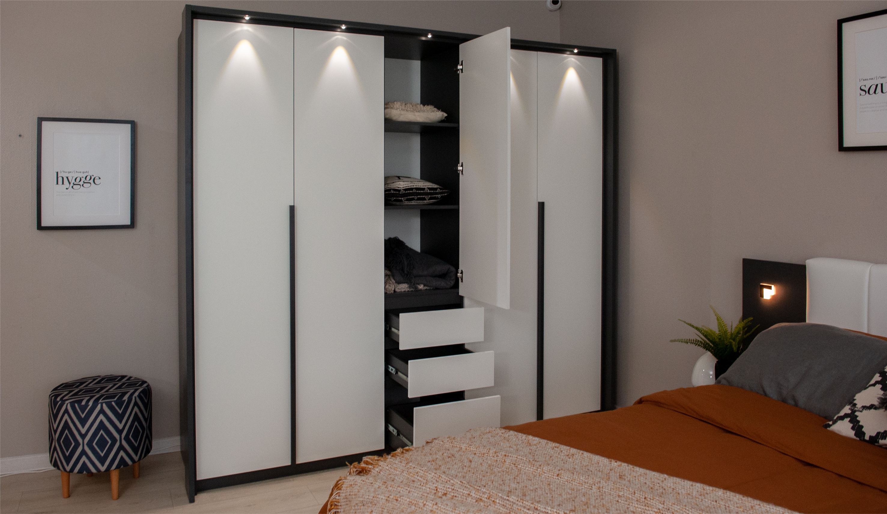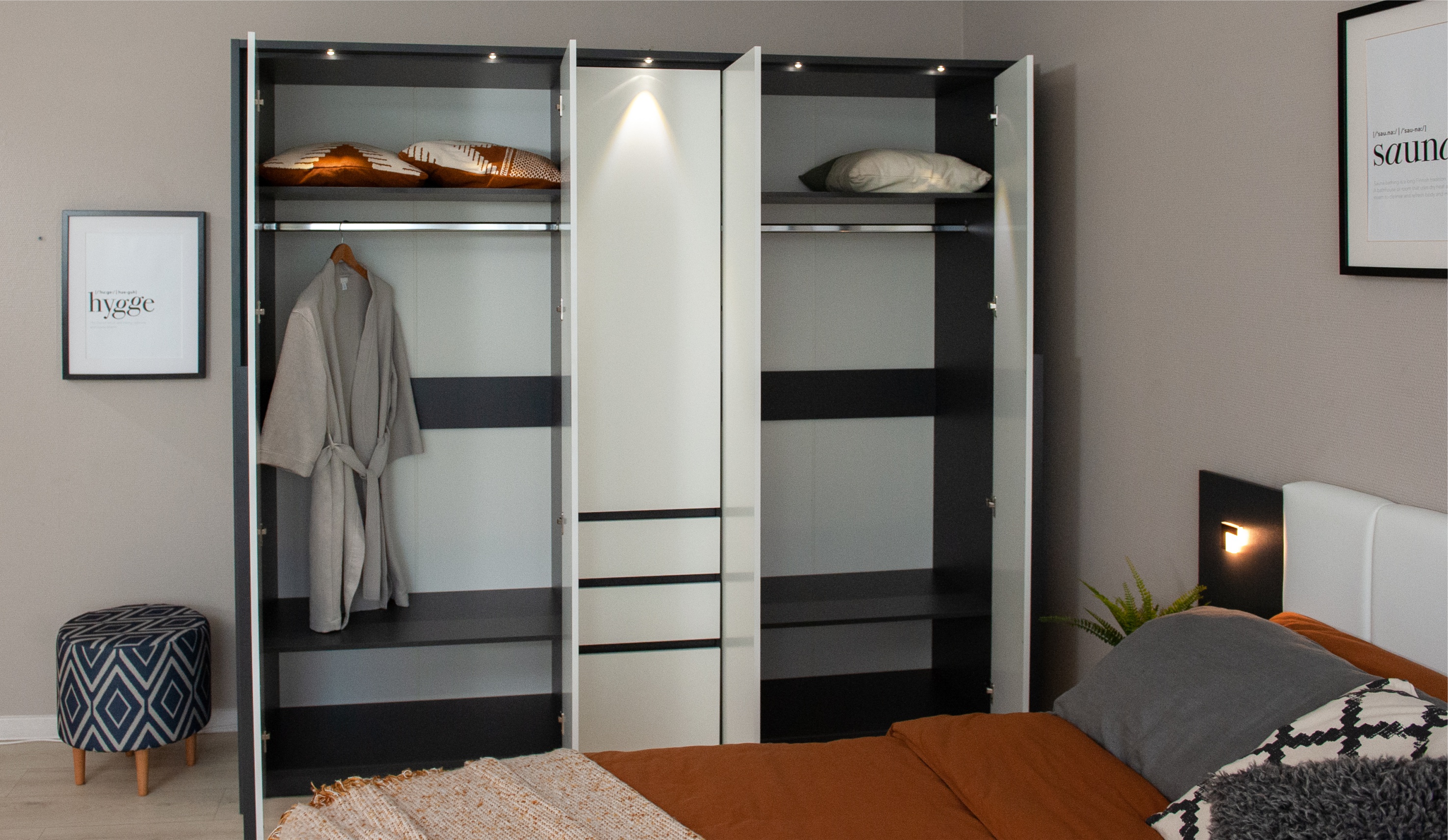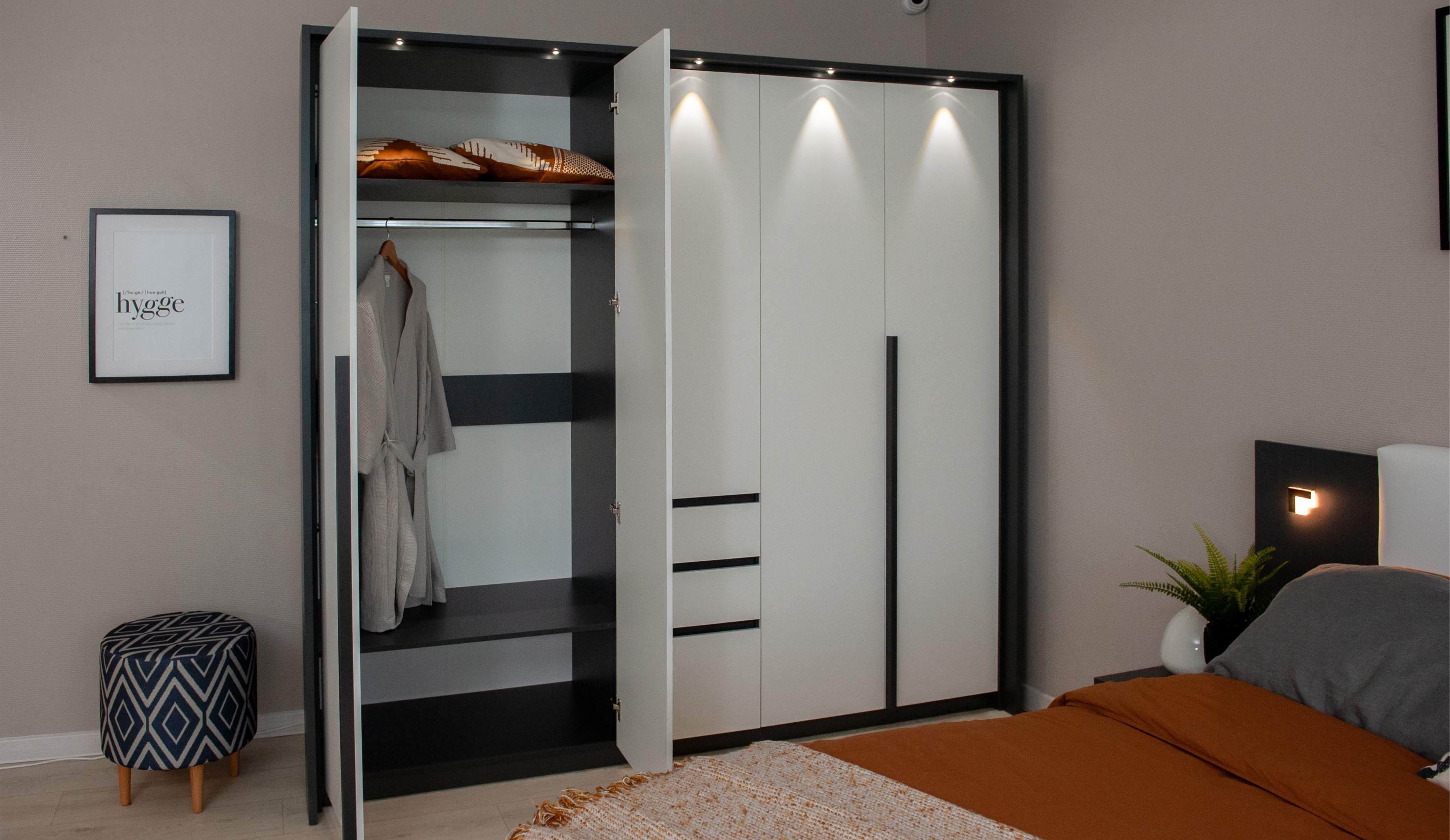 Функциональный распашной шкаф с массивными ручками контрастного цвета включает в себя вместительные полки и отделения со штангой, что позволяет создать систему для хранения вещей различного назначения. Встраиваемая в портал LED подсветка – оригинальное дизайнерское решение и дополнительный источник освещения. Современные цвета декора корпуса и белоснежный фасад добавят в жилое помещение света, уюта и комфорта. Идеально компонуется со всеми модулями системы Мишель.