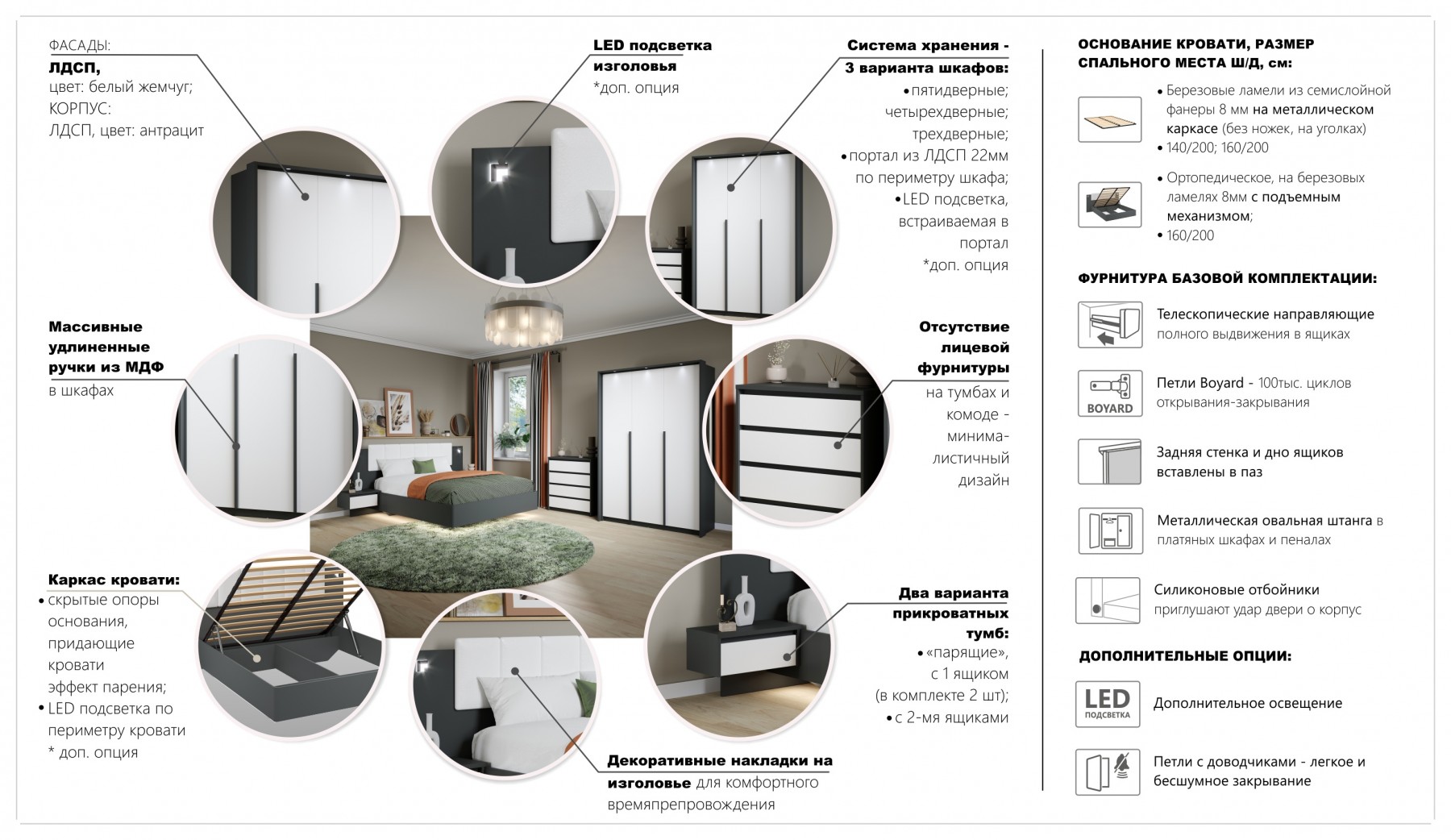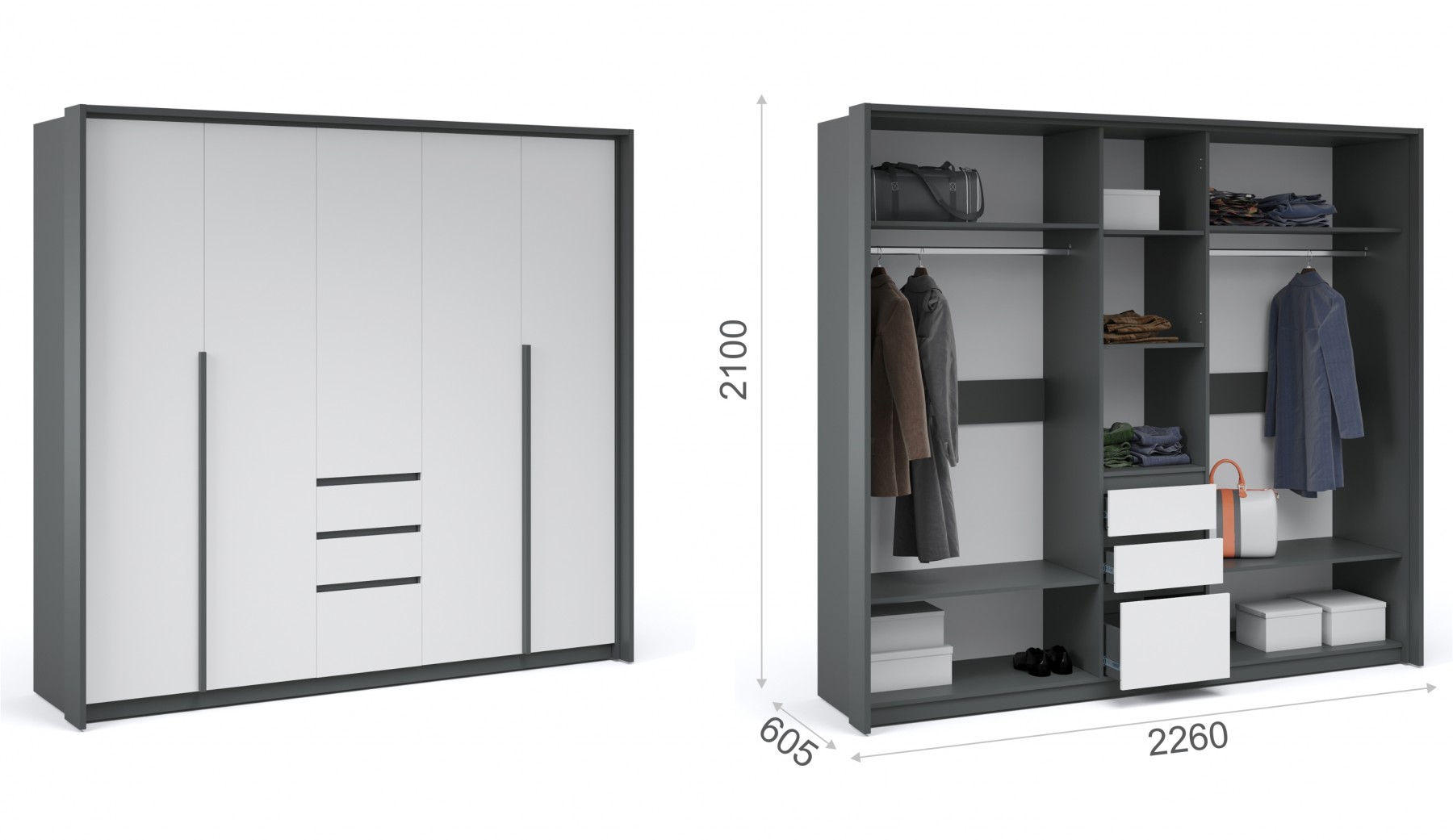 Функциональный распашной шкаф с массивными ручками контрастного цвета включает в себя вместительные полки и отделения со штангой, что позволяет создать систему для хранения вещей различного назначения. Встраиваемая в портал LED подсветка – оригинальное дизайнерское решение и дополнительный источник освещения. Современные цвета декора корпуса и белоснежный фасад добавят в жилое помещение света, уюта и комфорта. Идеально компонуется со всеми модулями системы Мишель.