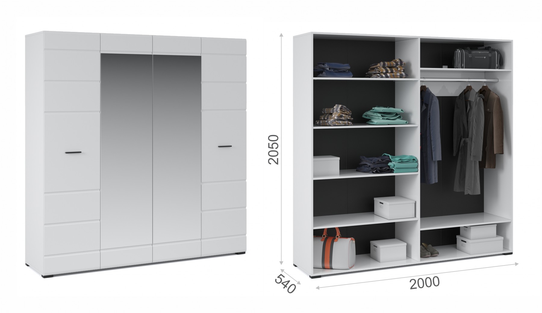 Распашной 4х дверный шкаф для одежды Йорк выполнен в современном стиле, сочетает в себе функциональность и эффектный внешний вид: строгая горизонтальная фрезеровка фасадов, контрастного черного цвета ручки и задняя стенка из ХДФ, элегантный белый цвет. Блеск глянцевых фасадов High Gloss из МДФ и зеркала наполняют комнату светом, делают ее просторнее. Внутри предусмотрены вместительные секции для белья и отделение со штангой. Мебель выполнена из экологически безопасных и надежных материалов.
