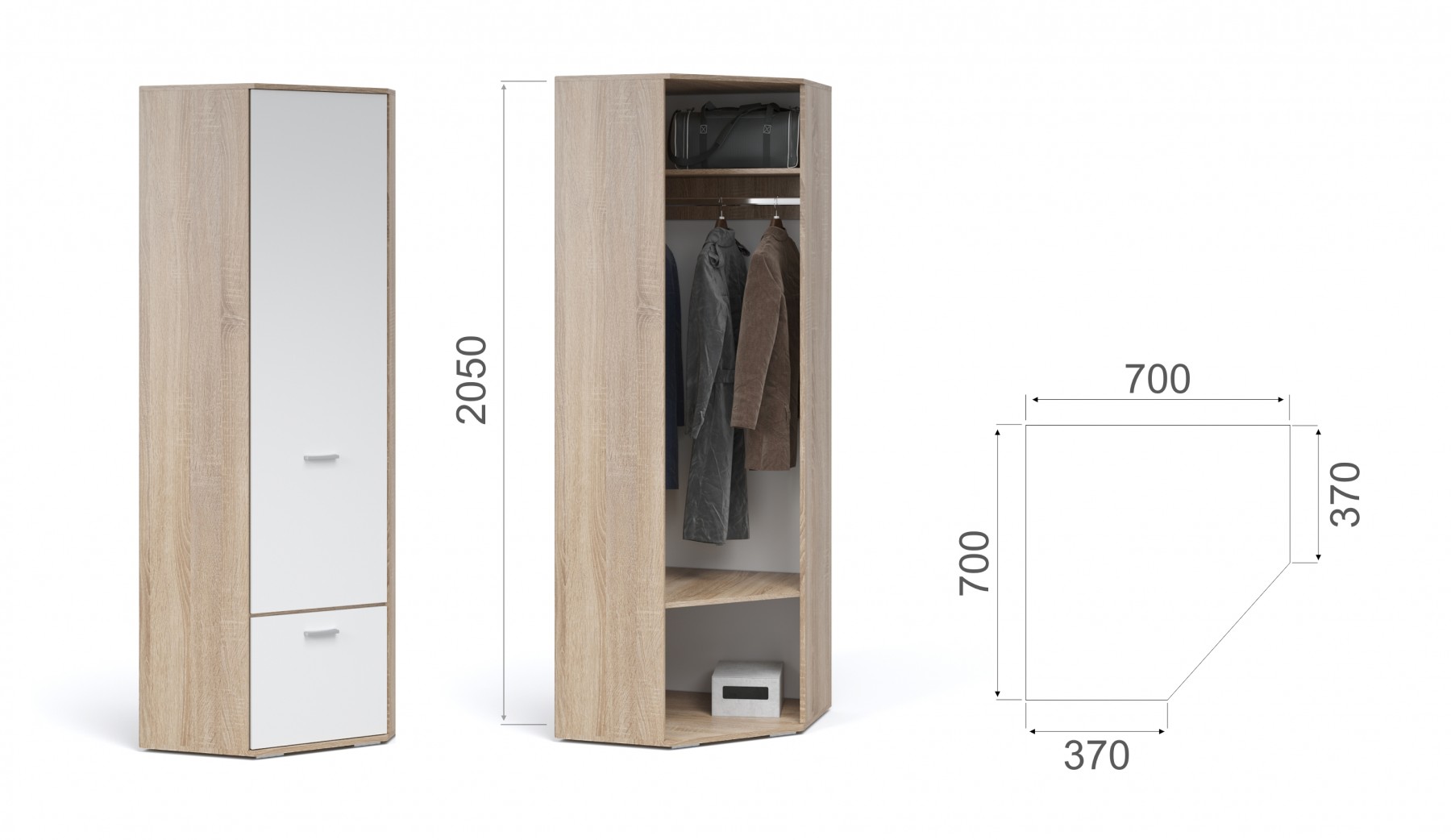 Шкаф позволяет рационально использовать пространство и будет хорошо смотреться даже в небольшой комнате, служит связующим звеном для составления угловой системы хранения. Нейтральные цвета корпуса и фасадов всегда будут актуальны, создают особый комфорт и уют. Внутри предусмотрены полки для белья и отделение с металлической овальной штангой. Идеально компонуется со всеми модулями системы Виола.