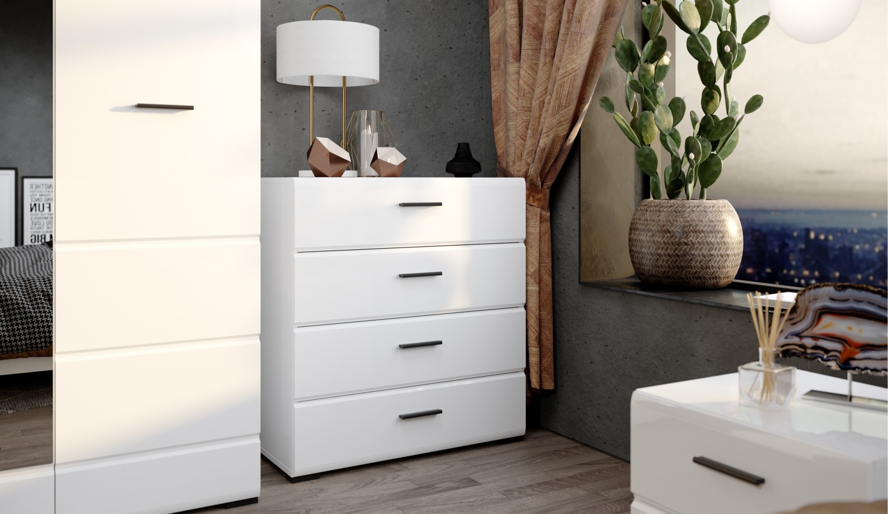 Стильный комод Йорк — оптимальное решение для спальни и гостиной. Горизонтальная фрезеровка фасадов, контрастные черного цвета ручки и задняя стенка из ХДФ, элегантный белый цвет— все это делает модель универсальной, позволяет сочетать ее с любой мебелью и отделкой. Блеск глянцевых фасадов High Gloss из МДФ наполняют комнату светом, делают ее просторнее. Ящики на телескопических направляющих, позволяют рационально использовать всё внутреннее пространство ящиков, обеспечивая удобный и легкий доступ ко всему содержимому. Мебель выполнена из экологически безопасных и надежных материалов.
