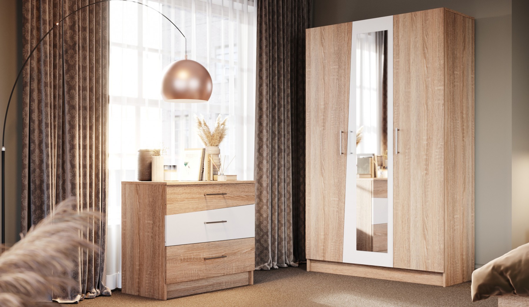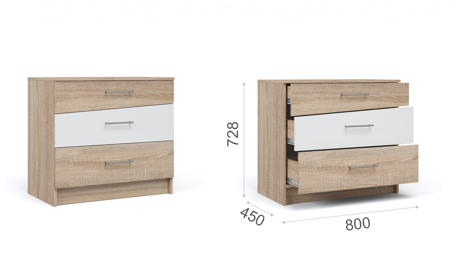 Вместительный комод Антария из ЛДСП с асимметричными скошенными линиями фасадов вносит свободу и движение в жилое пространство, делает интерьер более сложным и необычным. Нейтральные цвета декора универсальны для любого стиля интерьера. Три выдвижных ящика на роликовых направляющих поместят в себя одежду, личные вещи и аксессуары. Верхнюю крышку можно использовать для декора или фотографий. В спальне он легко превращается в туалетный столик, достаточно повесить над ним зеркало.