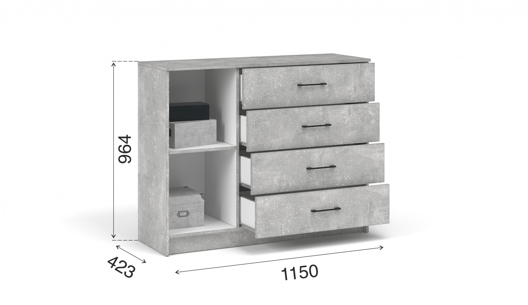 Практичный и надежный комод, изготовленный из прочного ЛДСП высокого качества, оборудован вместительными полками и выдвижными ящиками на роликовых направляющих для удобного хранения вещей по категориям. Нейтральные цвета декора визуально добавляют света и создают уют, а черные матовые ручки завершают композицию. Комод легко вписывается в готовые интерьеры благодаря своему универсальному дизайну и гармонично сочетается со всеми элементами модульной системы Чикаго.