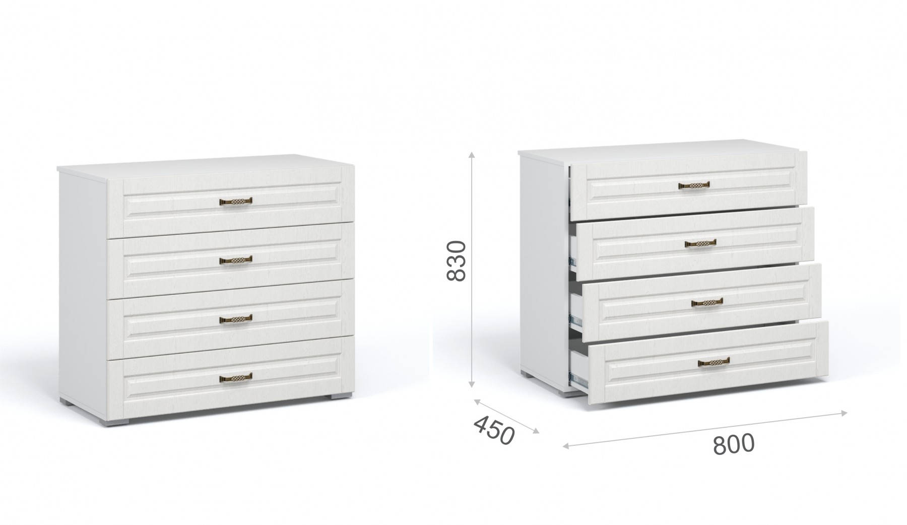 Вместительный комод Лацио создаст уютную атмосферу в интерьере гостиной или спальни. Белые фрезерованные фасады из МДФ с рисунком и текстурой дерева наполняют комнату светом, делают ее просторнее. Оригинальные металлические ручки придают комоду изысканность. В выдвижных ящиках на телескопических направляющих удобно хранить любые предметы одежды и личные вещи. Выполнен из экологичных материалов