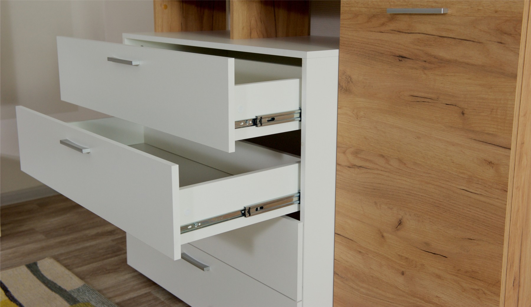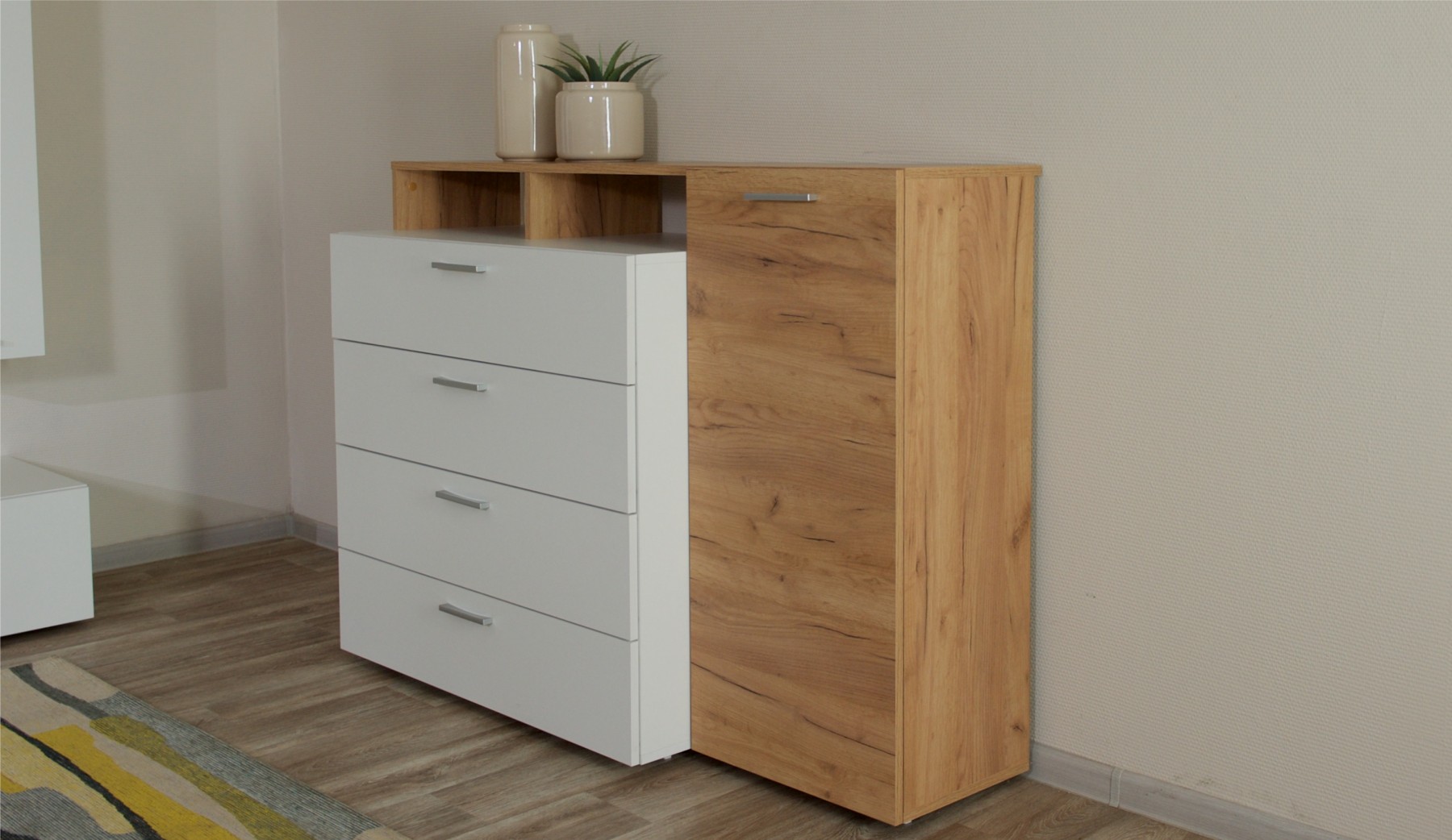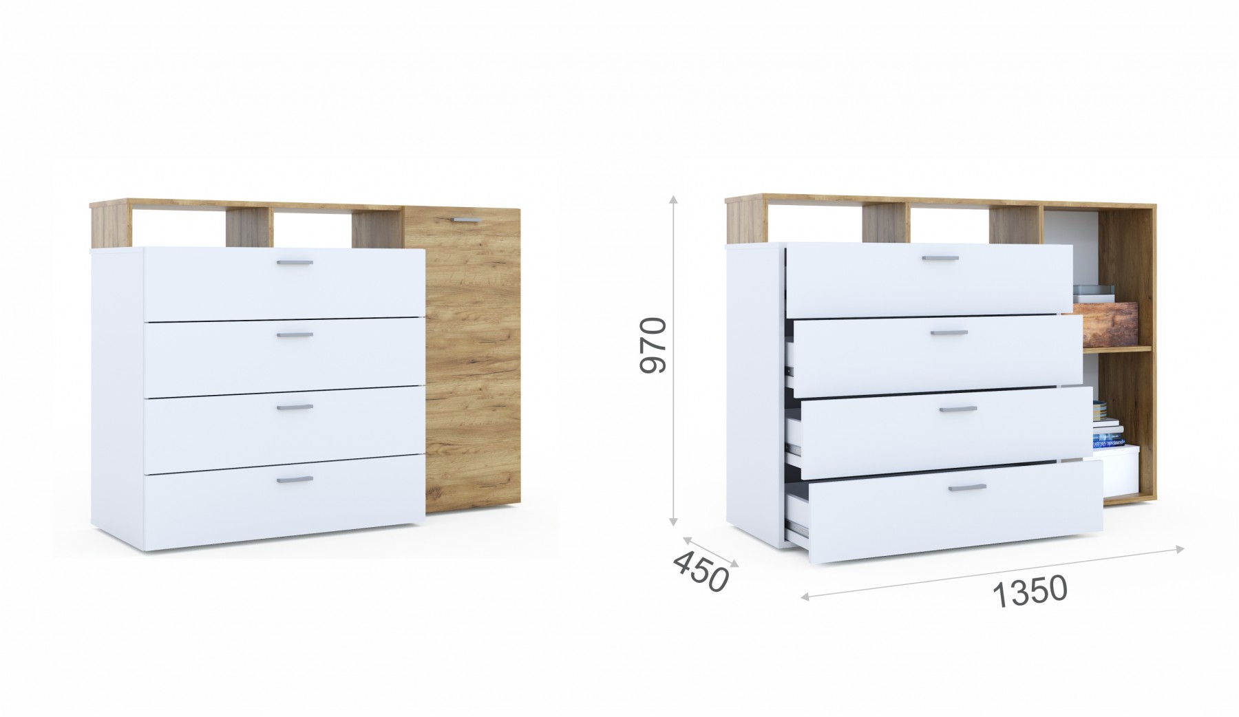 Комод Невио 1 - стильное и функциональное решение для дома. Белый цвет в сочетании с древесным делает модель гармоничным дополнением к любому интерьеру, позволяя создавать уникальные и яркие решения. Вместительные ящики полного выдвижения и полки обеспечивают удобное хранение вещей. Увеличенная на 1 см верхняя крышка позволяет поставить комод вплотную к стене. Мебель изготовлена из высококачественных экологически чистых материалов.