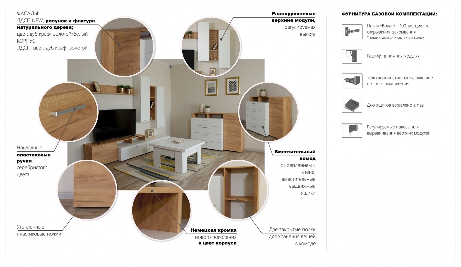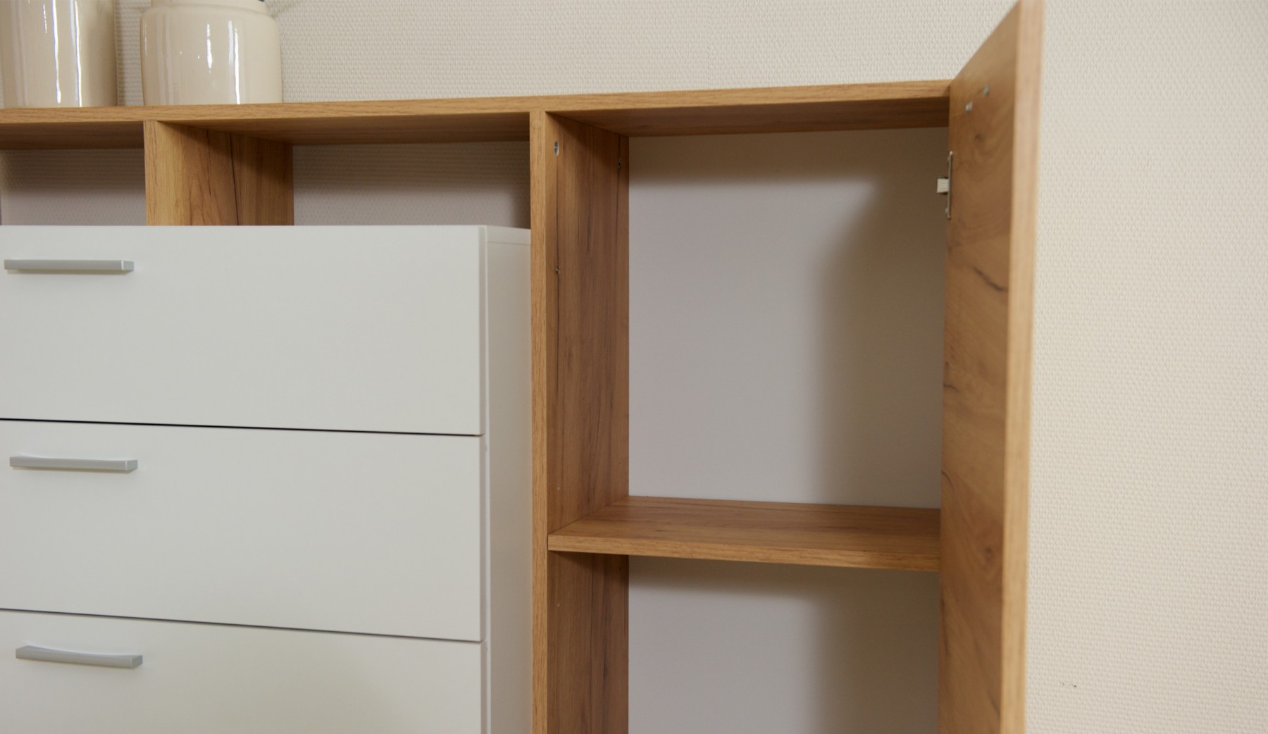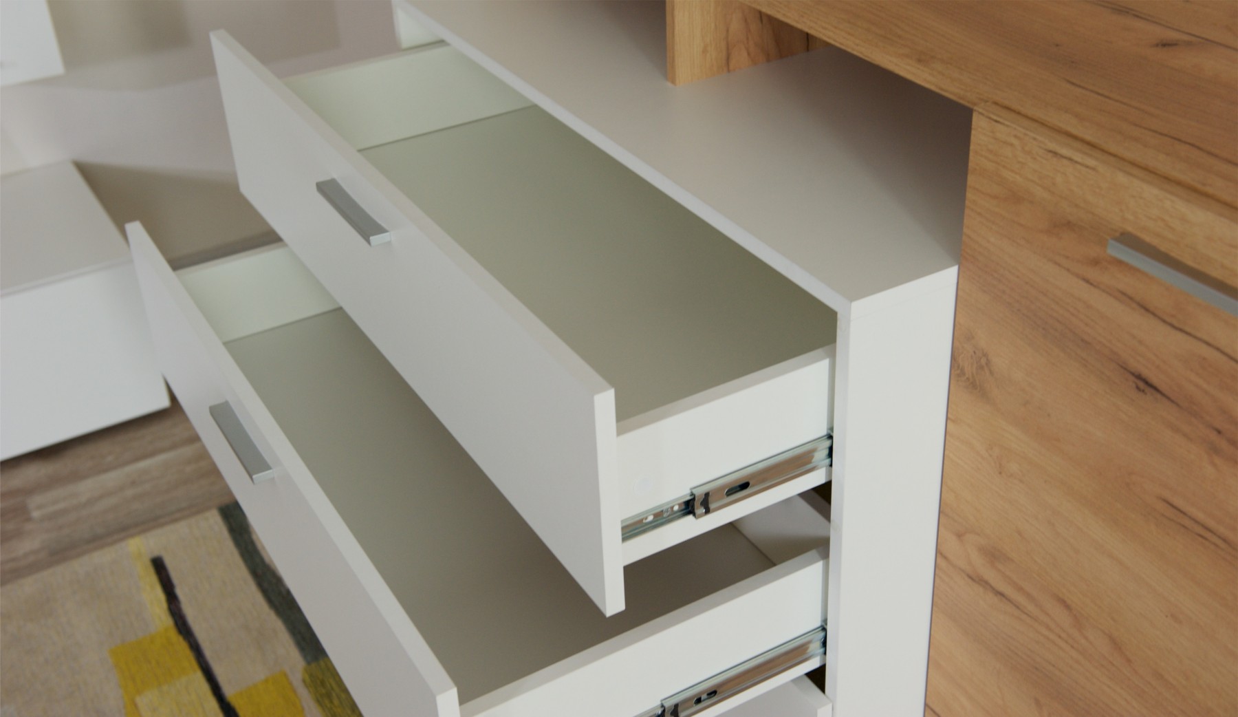 Комод Невио 1 - стильное и функциональное решение для дома. Белый цвет в сочетании с древесным делает модель гармоничным дополнением к любому интерьеру, позволяя создавать уникальные и яркие решения. Вместительные ящики полного выдвижения и полки обеспечивают удобное хранение вещей. Увеличенная на 1 см верхняя крышка позволяет поставить комод вплотную к стене. Мебель изготовлена из высококачественных экологически чистых материалов.