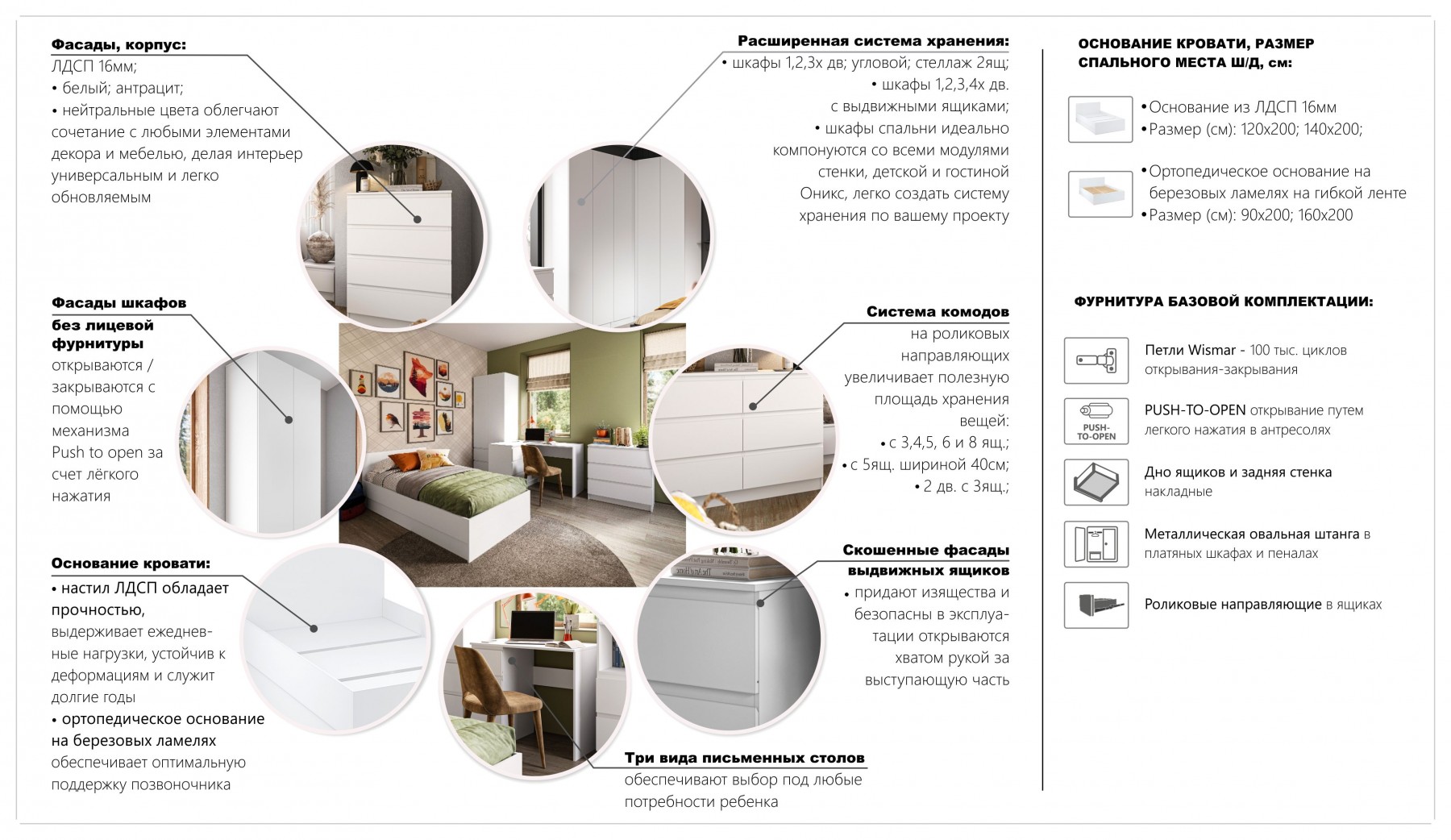 Шкафы для спальни идеально сочетаются с модулями детской, прихожей и гостиной серии «Оникс», позволяя легко создать единую систему хранения. Варианты исполнения: