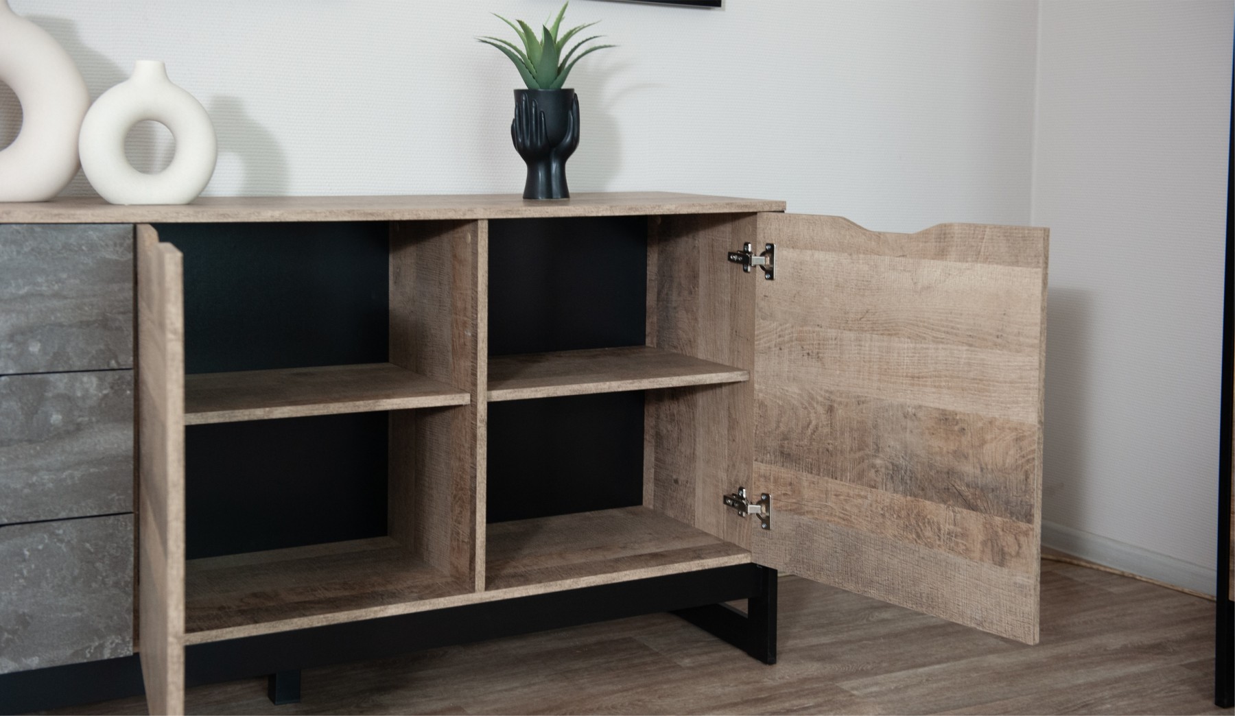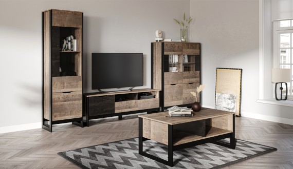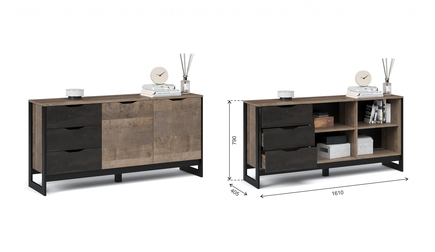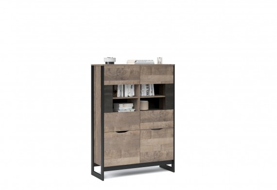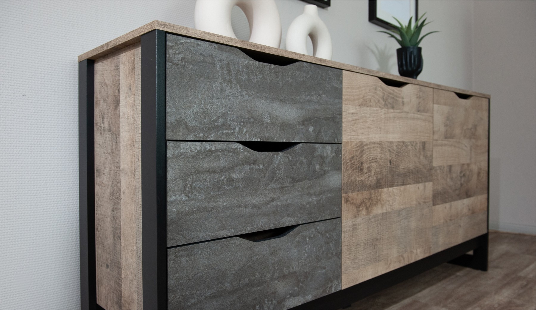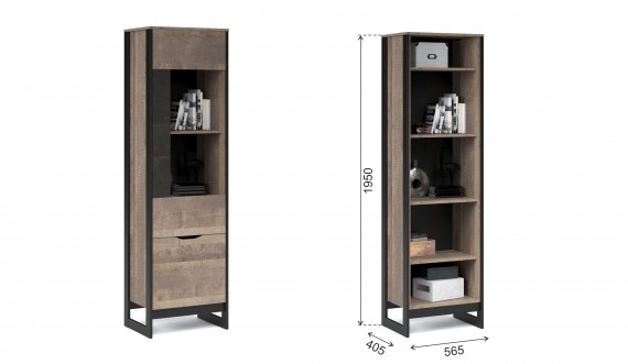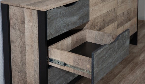 Функциональный вместительный комод в стиле лофт, оснащен тремя ящиками на телескопических направляющих и закрытыми полками для хранения вещей и аксессуаров. Отсутствие лицевой фурнитуры подчеркивает минимализм и геометрию модуля. Особенность дизайна - это сочетание реалистичных по цвету и тактильности трендовых декоров, которые соответствуют последним городским тенденциям. "Дуб Гранж" привлекает имитацией вручную обработанного дерева и выразительной зернистой текстурой, характерной формой досок. Стильный серый цвет "Железного камня" с металлическими разводами и новая текстура состаренной штукатурки в сочетании с гладкостью металла вносят индустриальный колорит. Оригинальные ножки-опоры из МДФ контрастного цвета придают изюминку интерьеру.