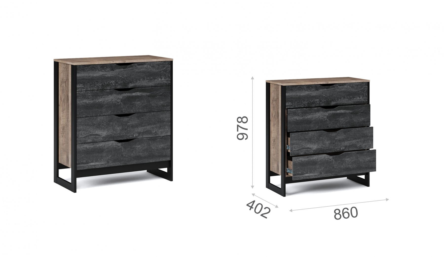 Функциональный вместительный комод станет отличным решением для оформления прихожей, спальни или гостиной. Особенность дизайна - это сочетание реалистичных по цвету и тактильности трендовых декоров, которые соответствуют последним городским тенденциям. "Дуб Гранж" привлекает имитацией вручную обработанного дерева и выразительной зернистой текстурой, характерной формой досок. Стильный серый цвет "Железного камня" с металлическими разводами и новая текстура состаренной штукатурки в сочетании с гладкостью металла вносят индустриальный колорит. Оригинальные ножки-опоры из МДФ контрастного цвета придают изюминку интерьеру. Комод оснащен четырьмя ящиками на телескопических направляющих для хранения вещей и аксессуаров. Отсутствие лицевой фурнитуры подчеркивает минимализм и геометрию модуля. Идеально компонуется со всеми модулями системы Стокгольм.
