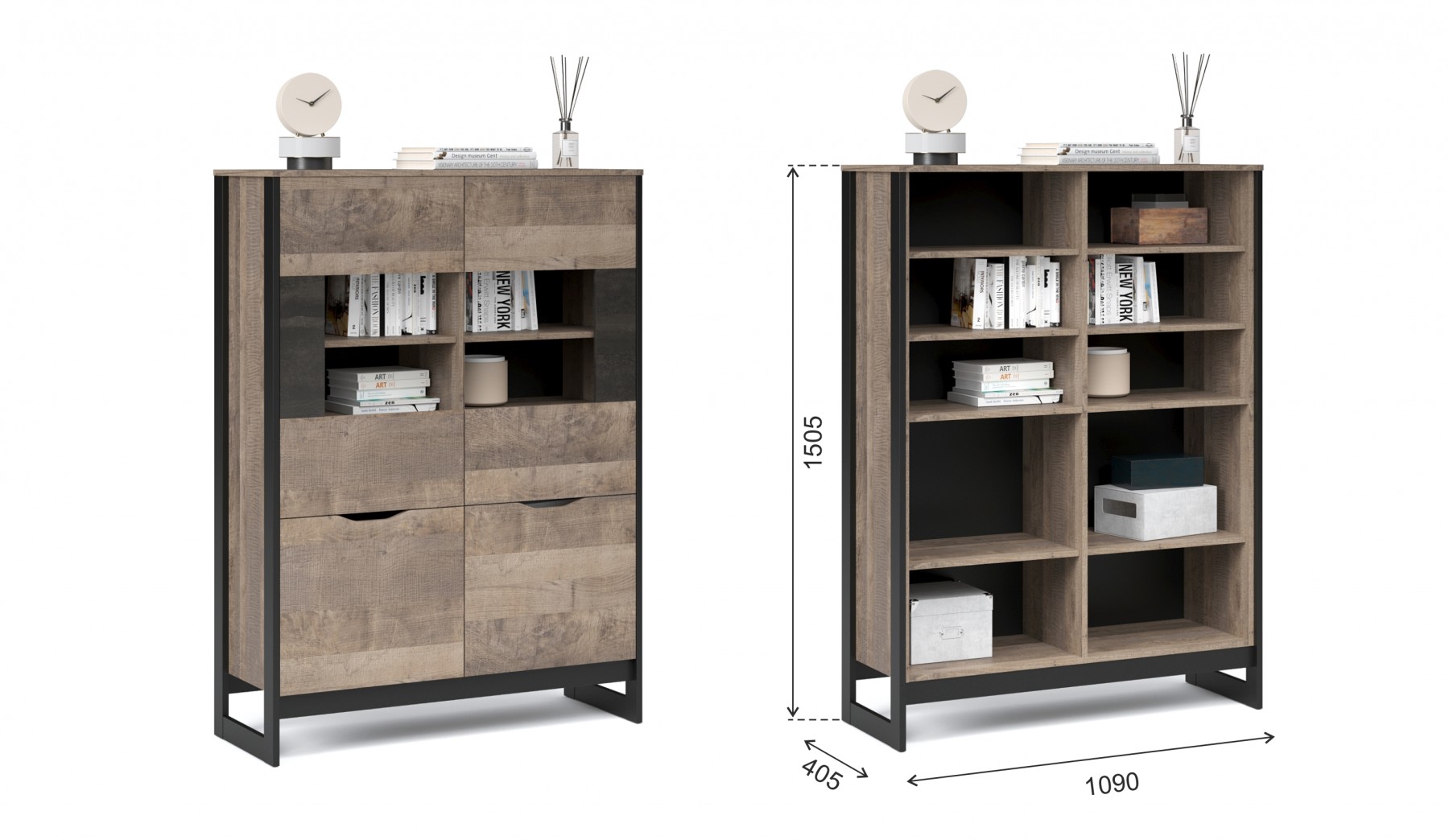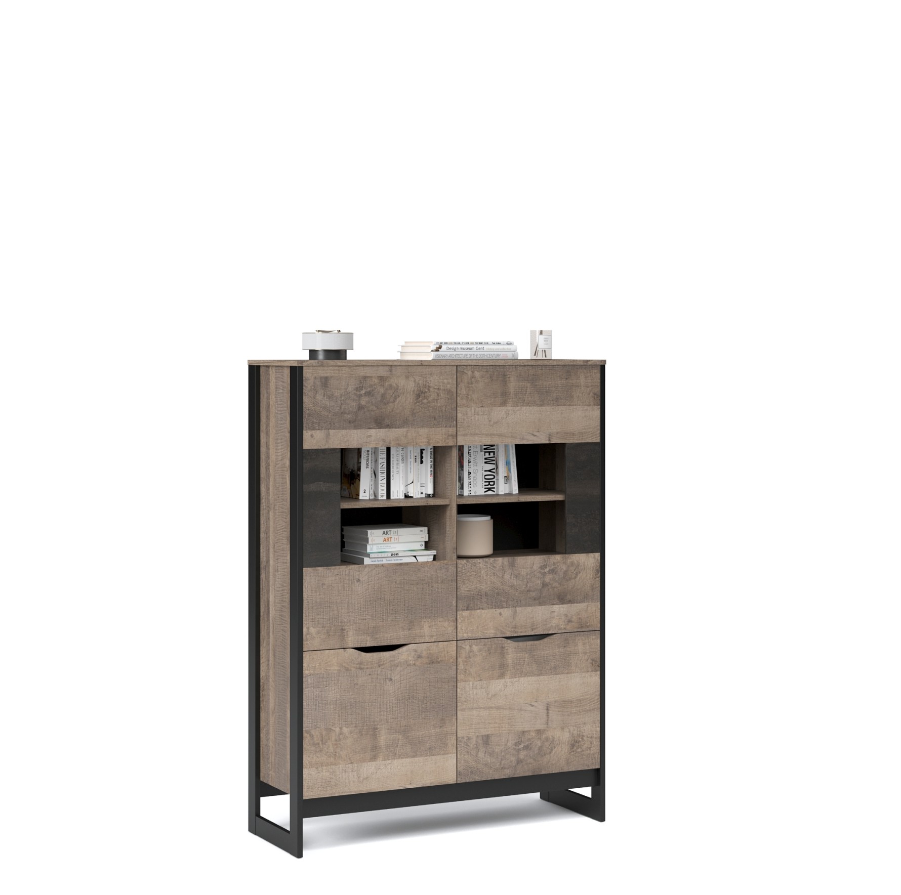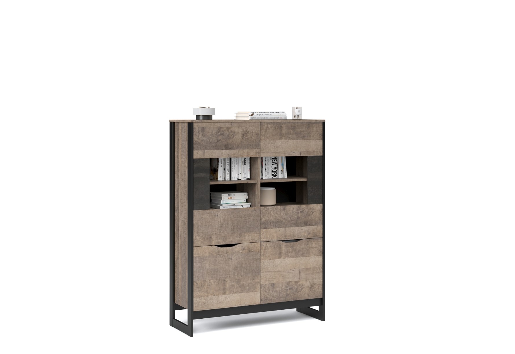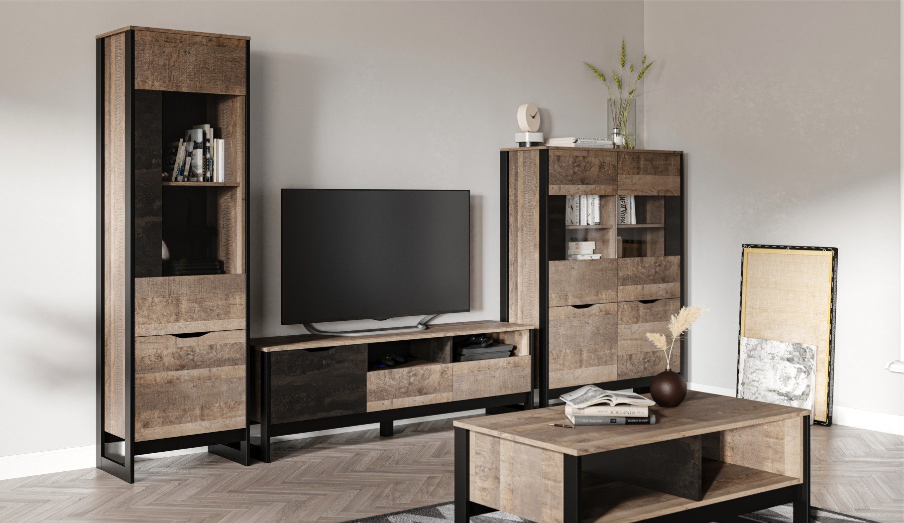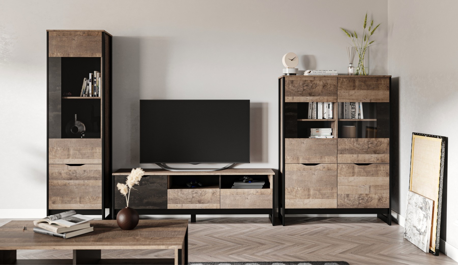 Шкаф-витрина со стеклянным фасадом - современное решение для гостиной или прихожей в стилях лофт, сканди, эко-минимализм. За стеклом размещены полки для предметов интерьера или красивой посуды. Нижние отделения с глухими фасадами служат для хранения личных вещей. Отсутствие лицевой фурнитуры подчеркивает минимализм и геометрию модуля. Особенность дизайна - это сочетание реалистичных по цвету и тактильности трендовых декоров, которые соответствуют последним городским тенденциям. "Дуб Гранж" привлекает имитацией вручную обработанного дерева и выразительной зернистой текстурой, характерной формой досок. Стильный серый цвет "Железного камня" с металлическими разводами и новая текстура состаренной штукатурки в сочетании с гладкостью металла вносят индустриальный колорит. Оригинальные ножки-опоры из МДФ контрастного цвета придают изюминку, а светодиодная подсветка усилит впечатление от созданного интерьера.